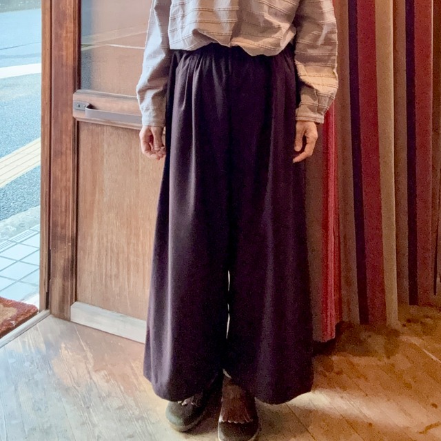 nachukaraのウォッシャブルウール ワイドパンツ。 起毛したウールの平織素材、メランジ調の色合いが特徴。ホームクリーニングができるウォッシャブルウール素材です。 柔らかな肌触りと保温性があります。 ウエスト総ゴムのイージーな穿き心地。 フロントに2タック。 ゆったりとした股上に程よく広がったワイドシルエット。 両脇スリットポケット、後ろはパッチポケット付きです。 滑りの良いポリエステルの裏地付きで履き心地も抜群。 素材:ポリエステル70%、ウール30% 裏地ポリエステル100% カラー:ライトグレー、ブラウン サイズ:フリー ウエスト約70cm〜、ヒップ約130cm、脇丈約90cm、股上約33.5cm、股下約59cm、裾幅約33cm モデル身長160cm ※通販ご利用のお客様へ※ TOPページ上部にある【通販の注意事項】を必ずお読みください。 お客様都合による返品交換はお受けできません。 必ず寸法をお確かめ頂き、ご質問のある方は購入前にお問い合わせ下さい。 試着のできないお買い物となりますのでよくお考えの上ご注文くださいませ。よろしくお願いします。