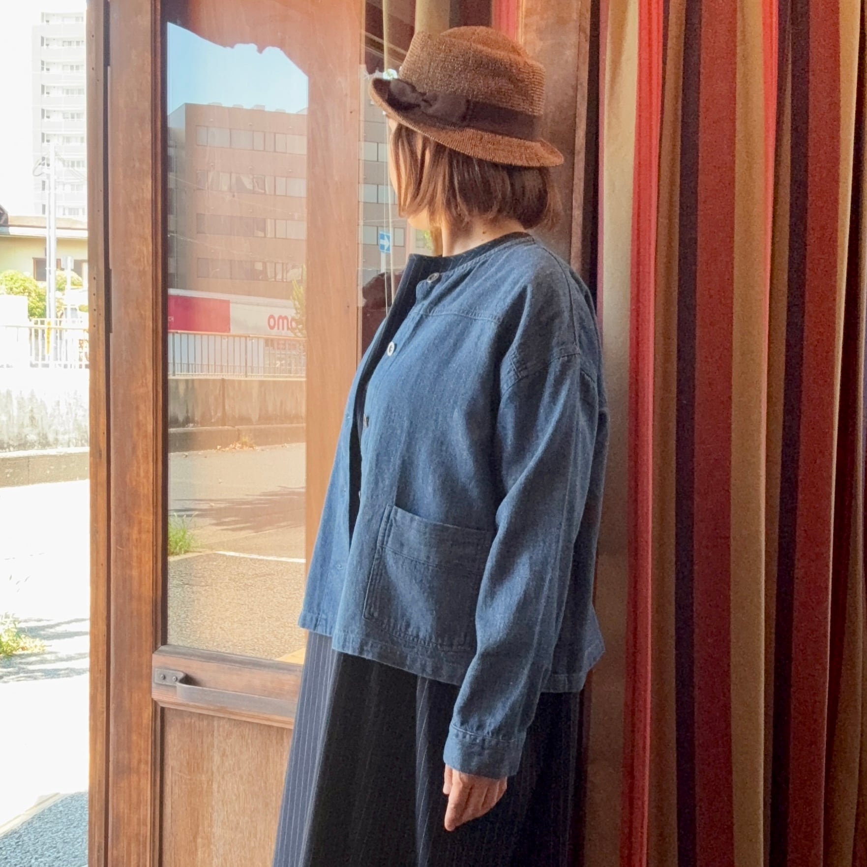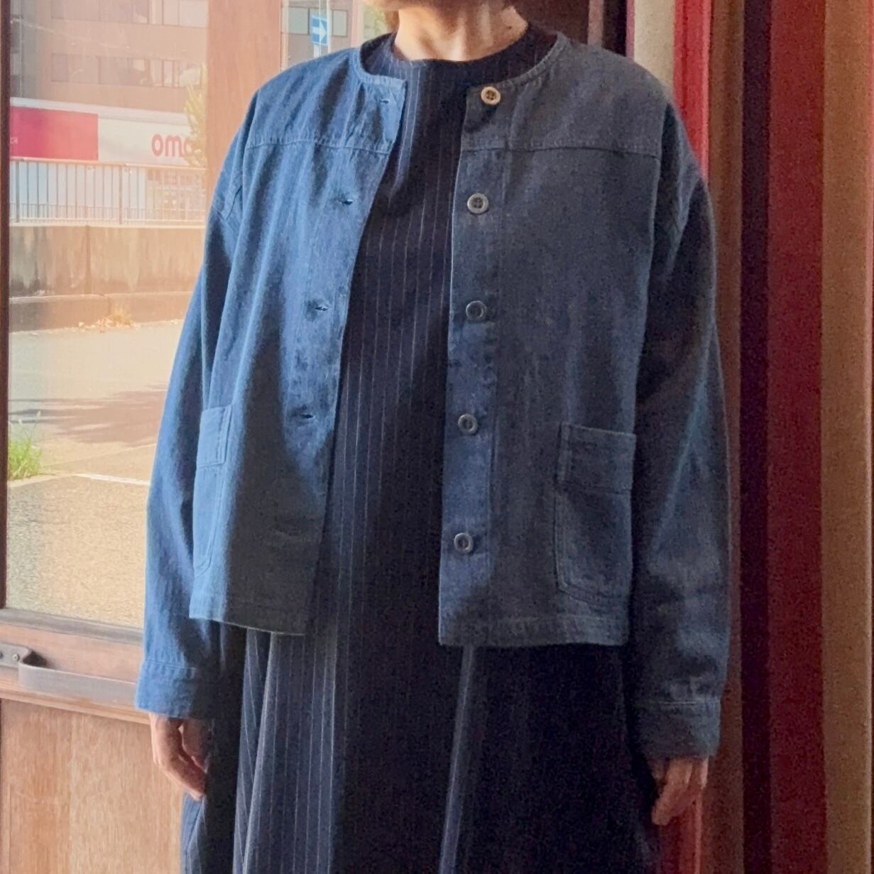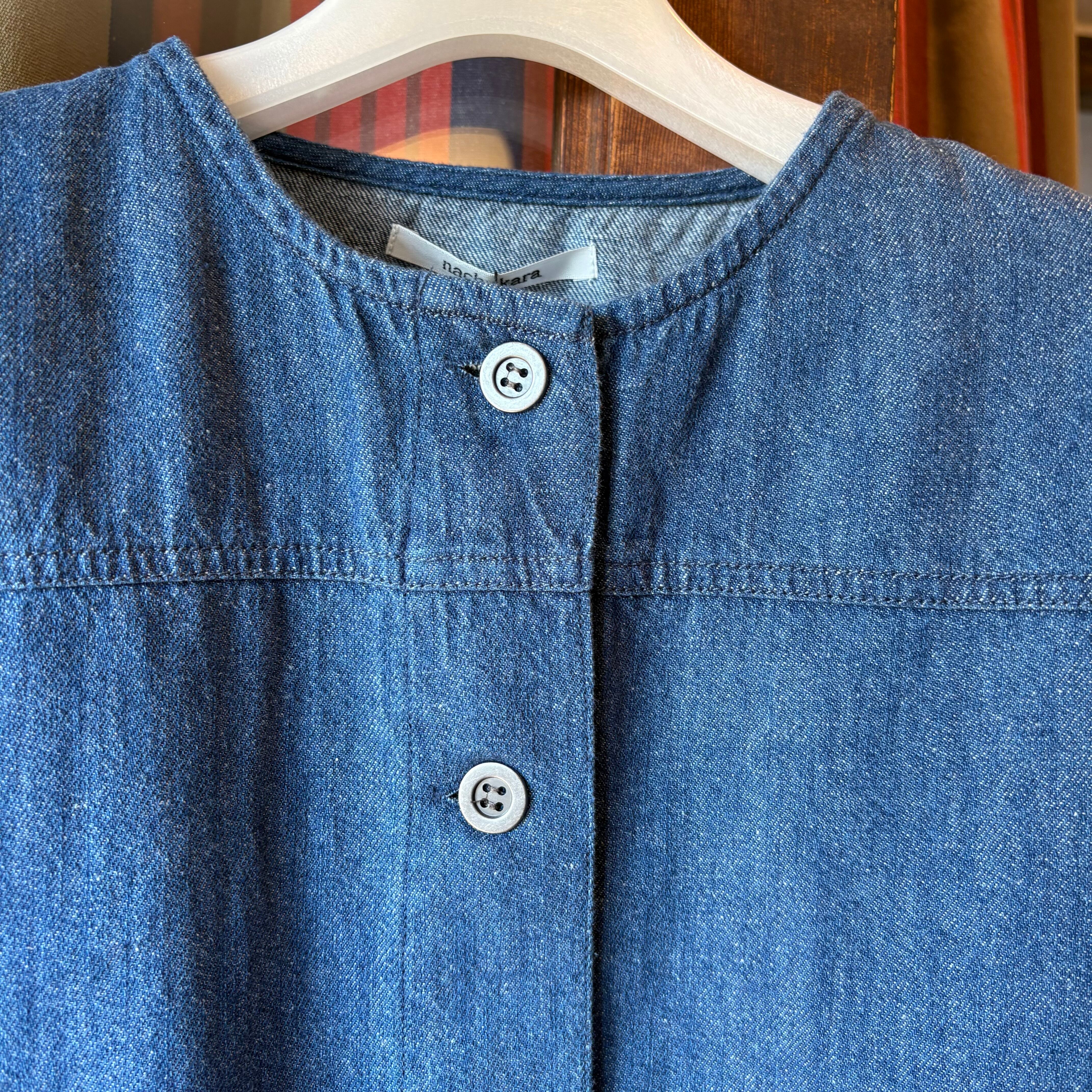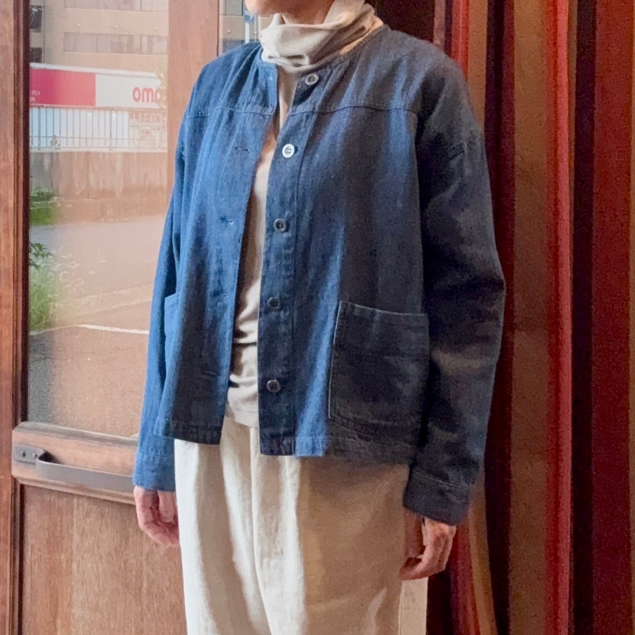 nachukaraのコットンリネンデニム ノーカラージャケット。