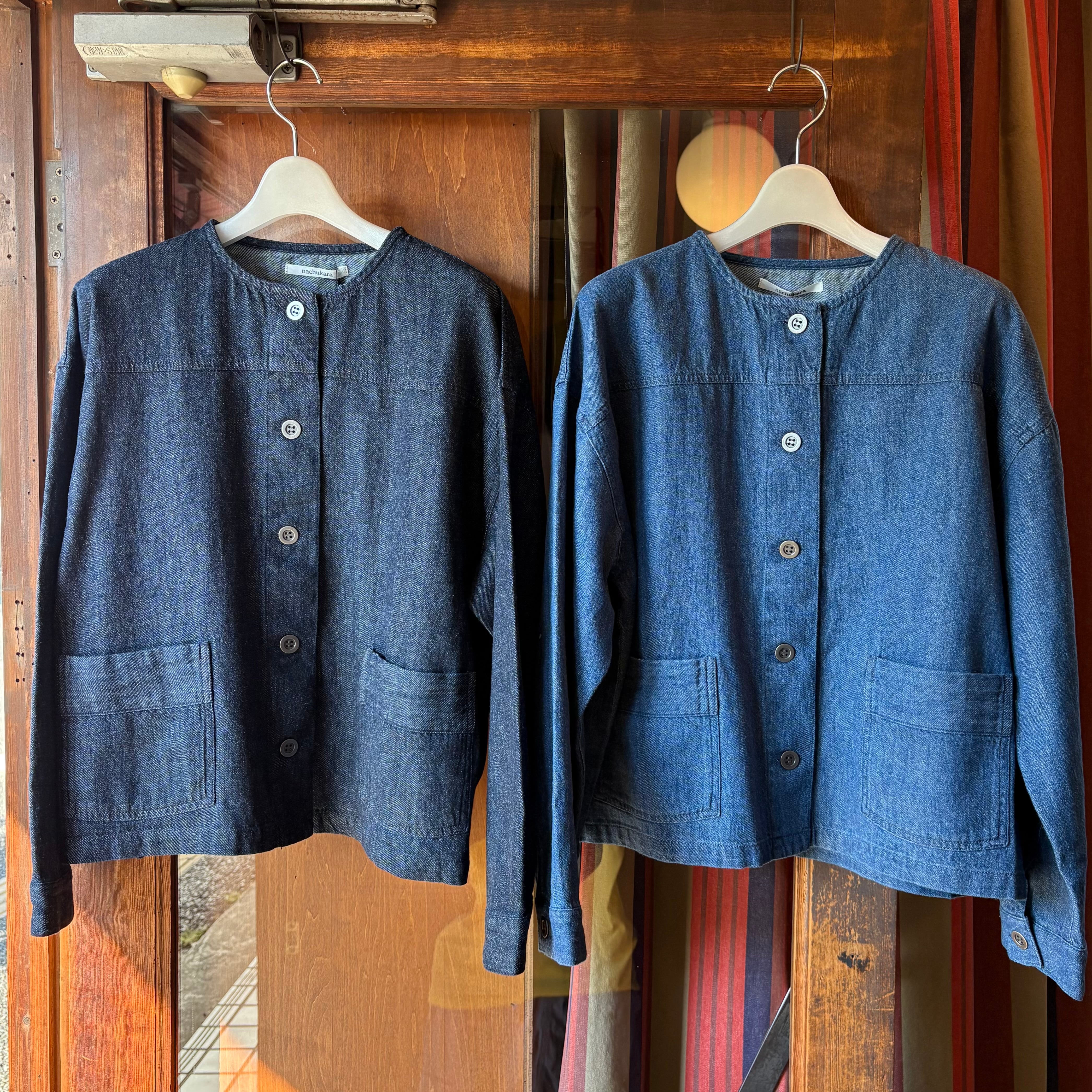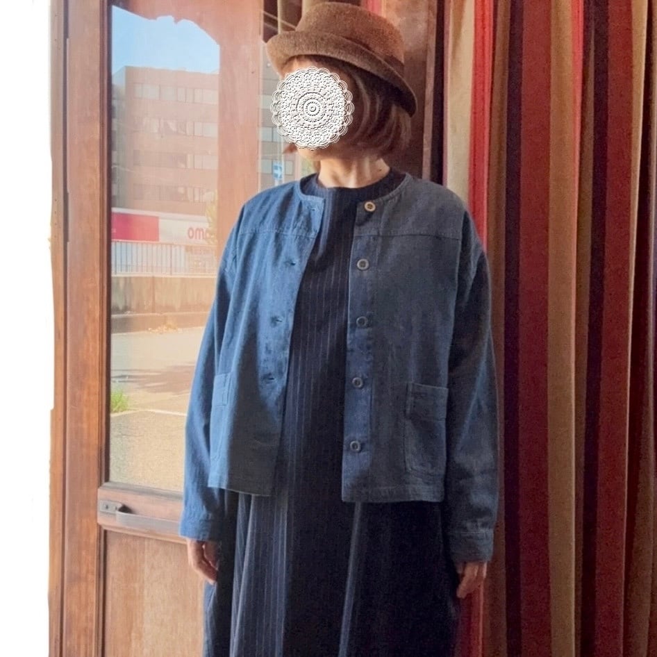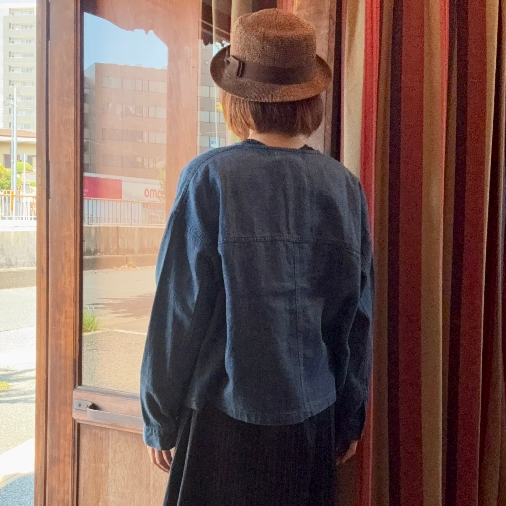 nachukaraのコットンリネンデニム ノーカラージャケット。