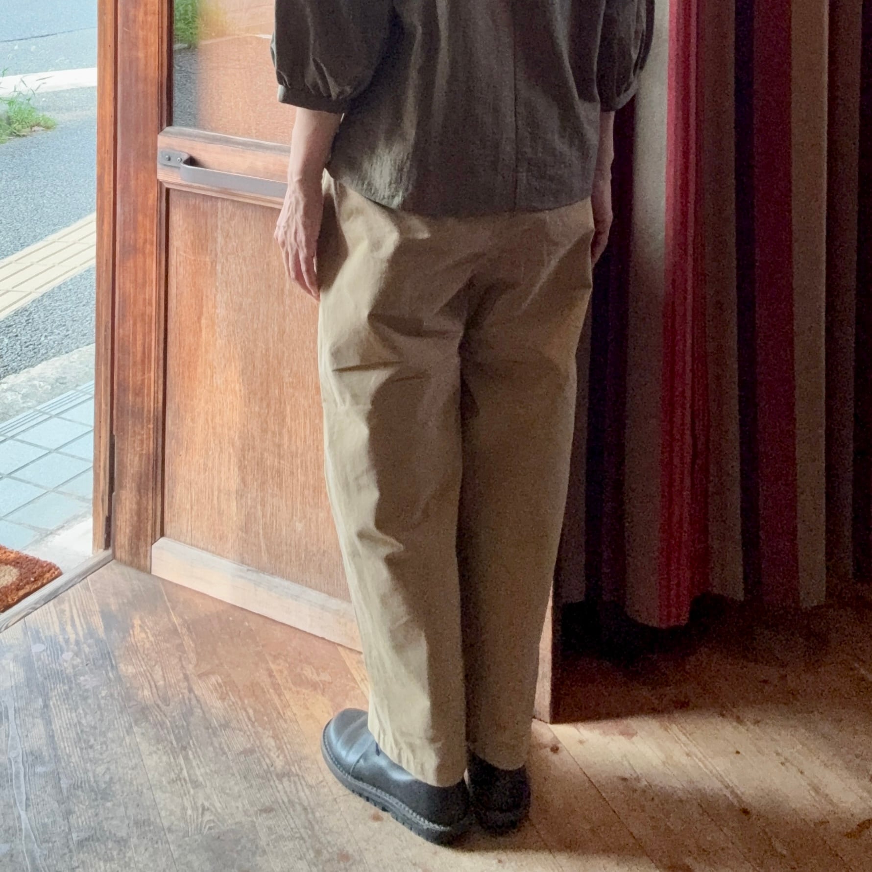 タックを入れてヒップと太もも周りにゆとりを持たせたテーパードシルエット。脇ラインを前振りにして丸みを持たせました。