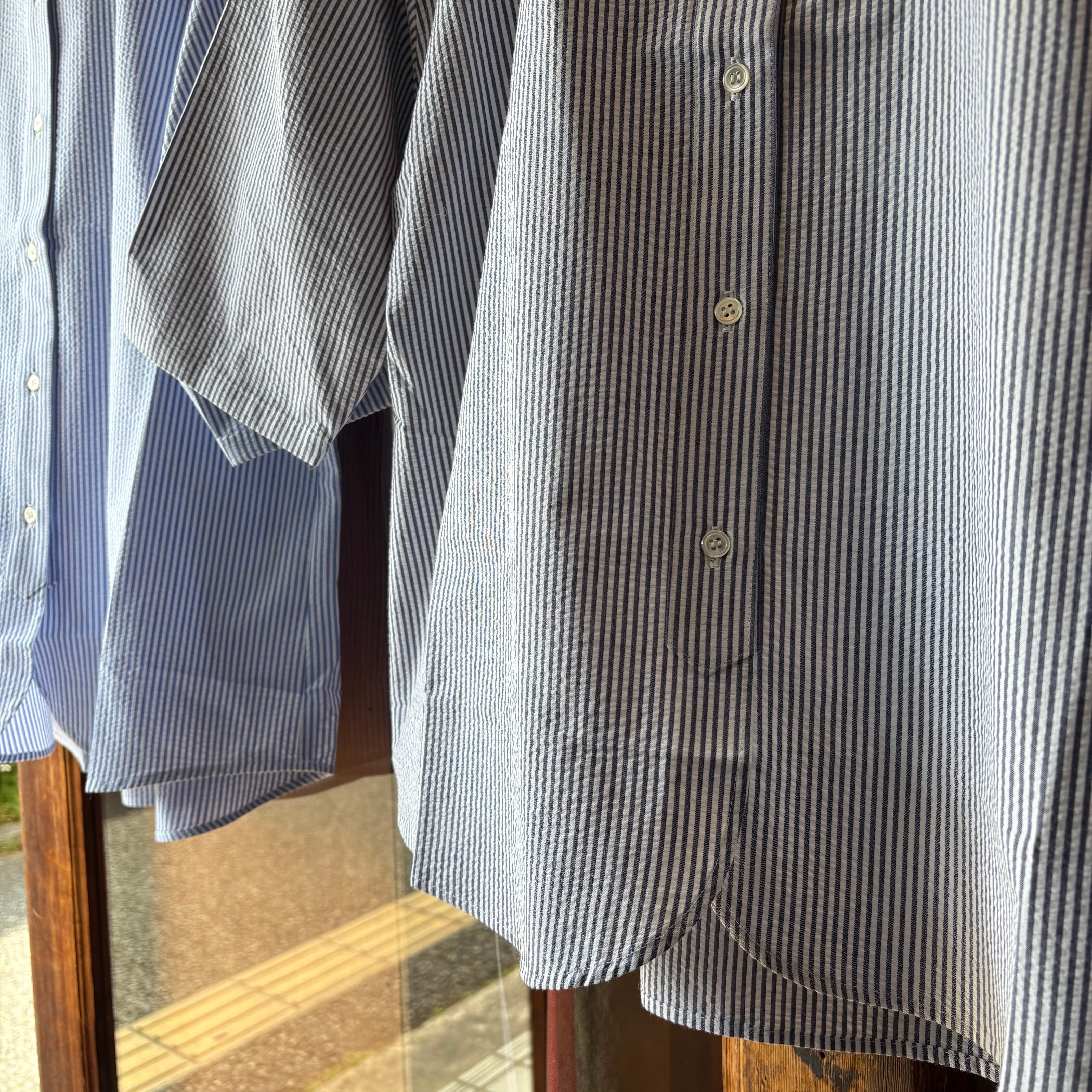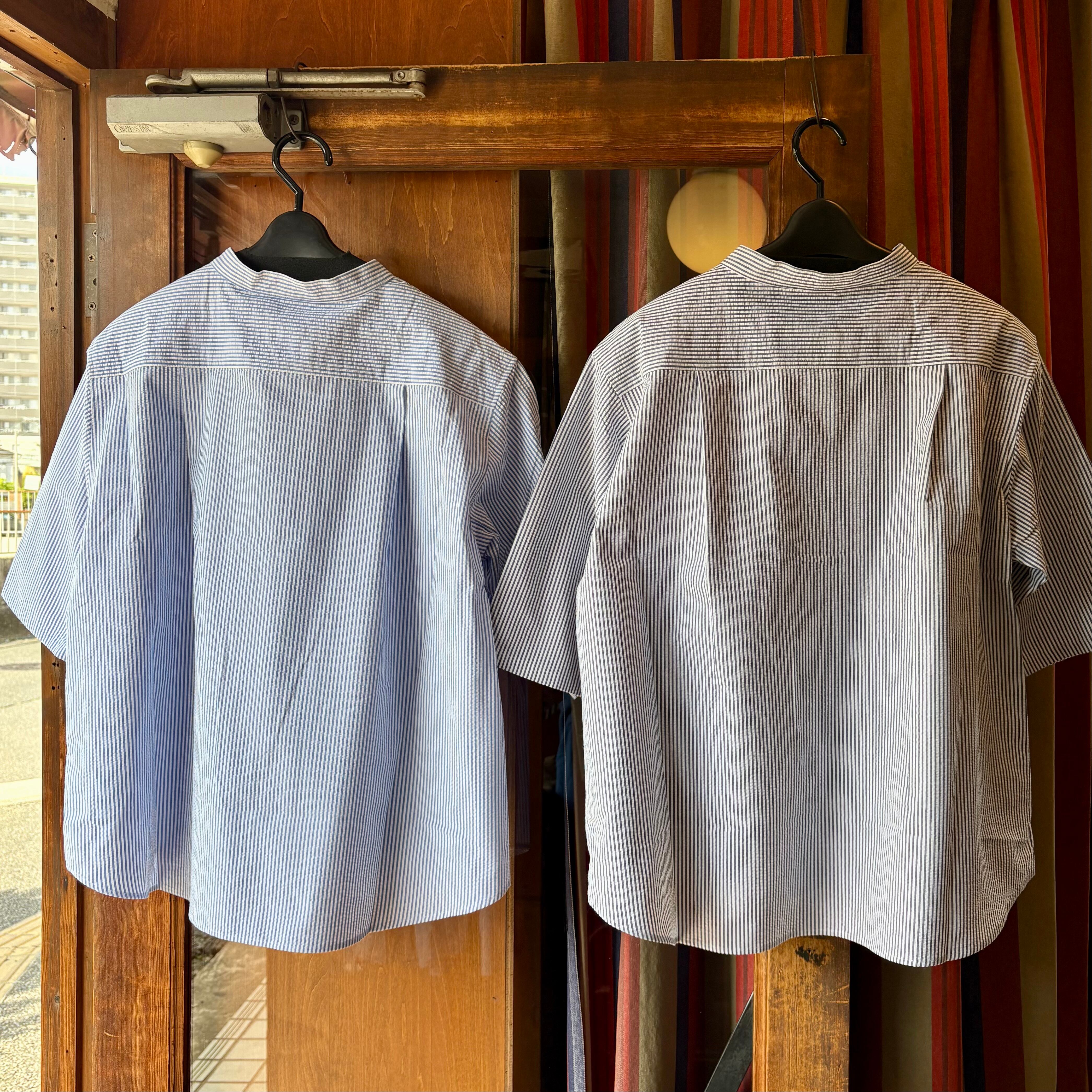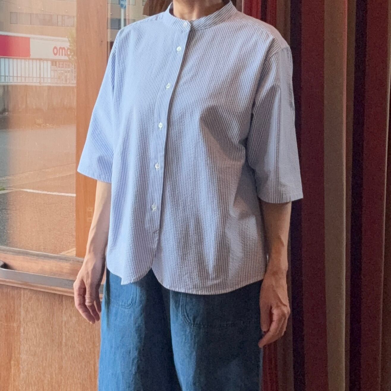 nachukaraのコットンシアサッカー バンドカラーブラウス・サックスストライプ