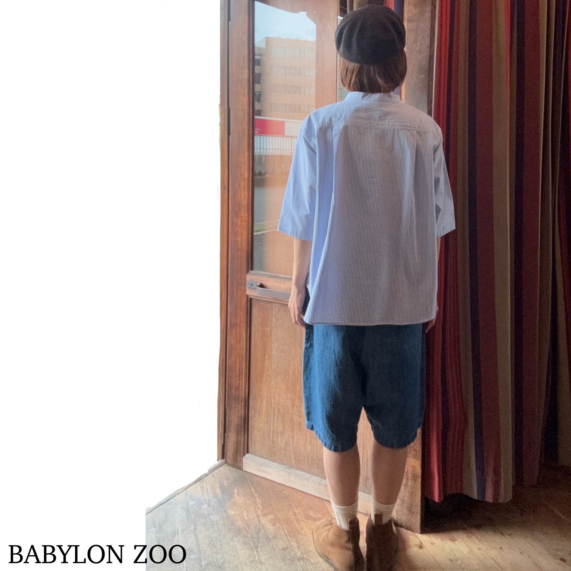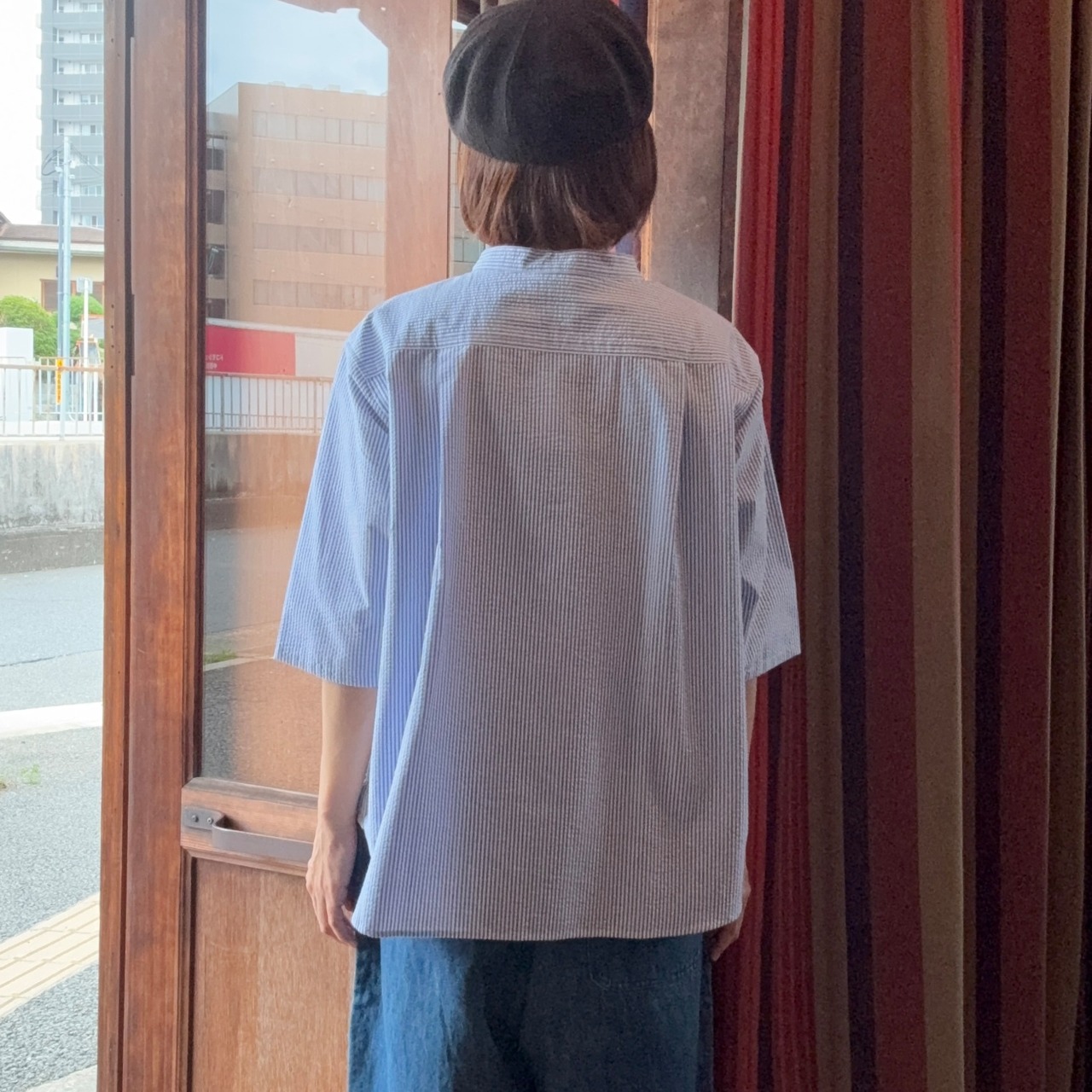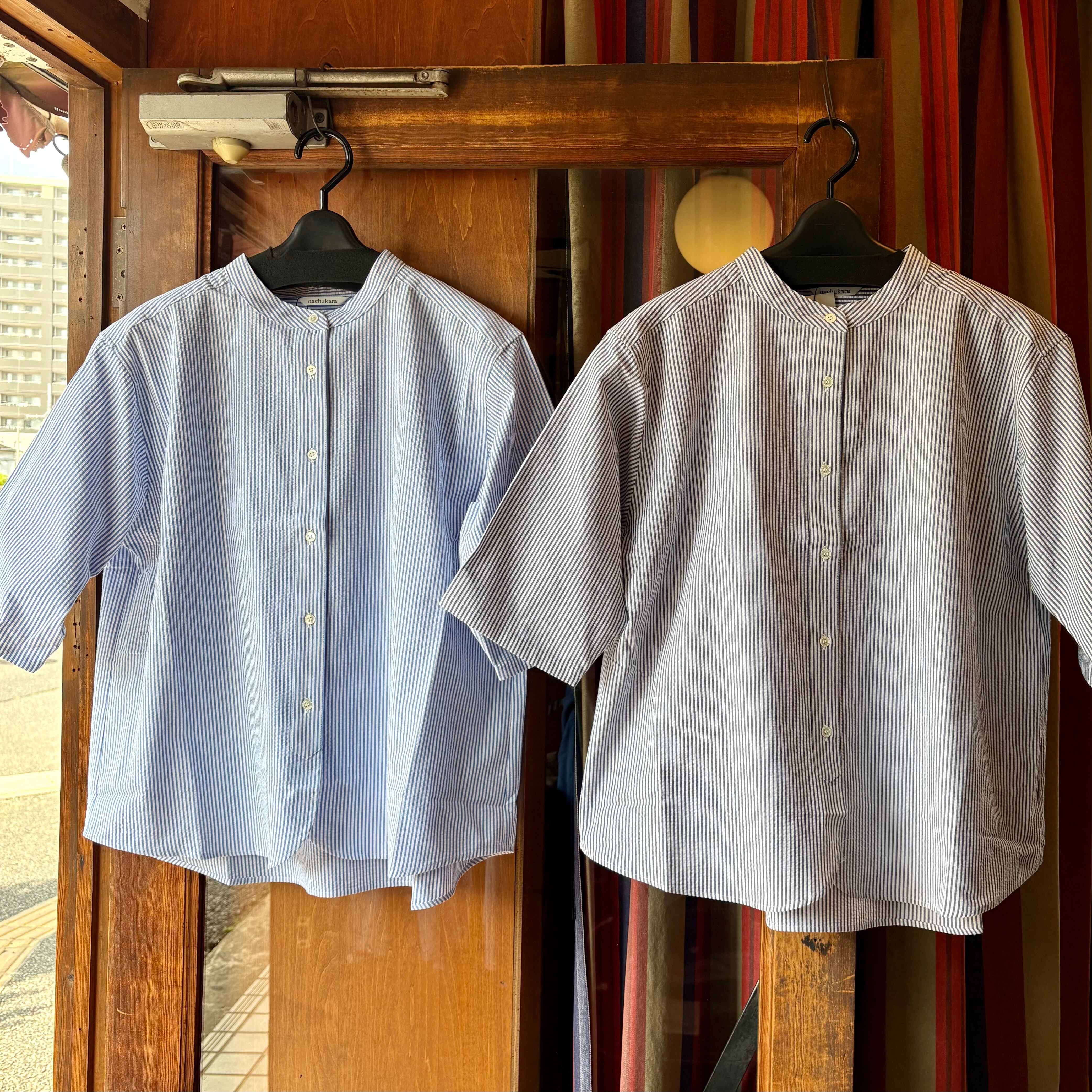 nachukaraのコットンシアサッカー バンドカラーブラウス・サックスストライプ