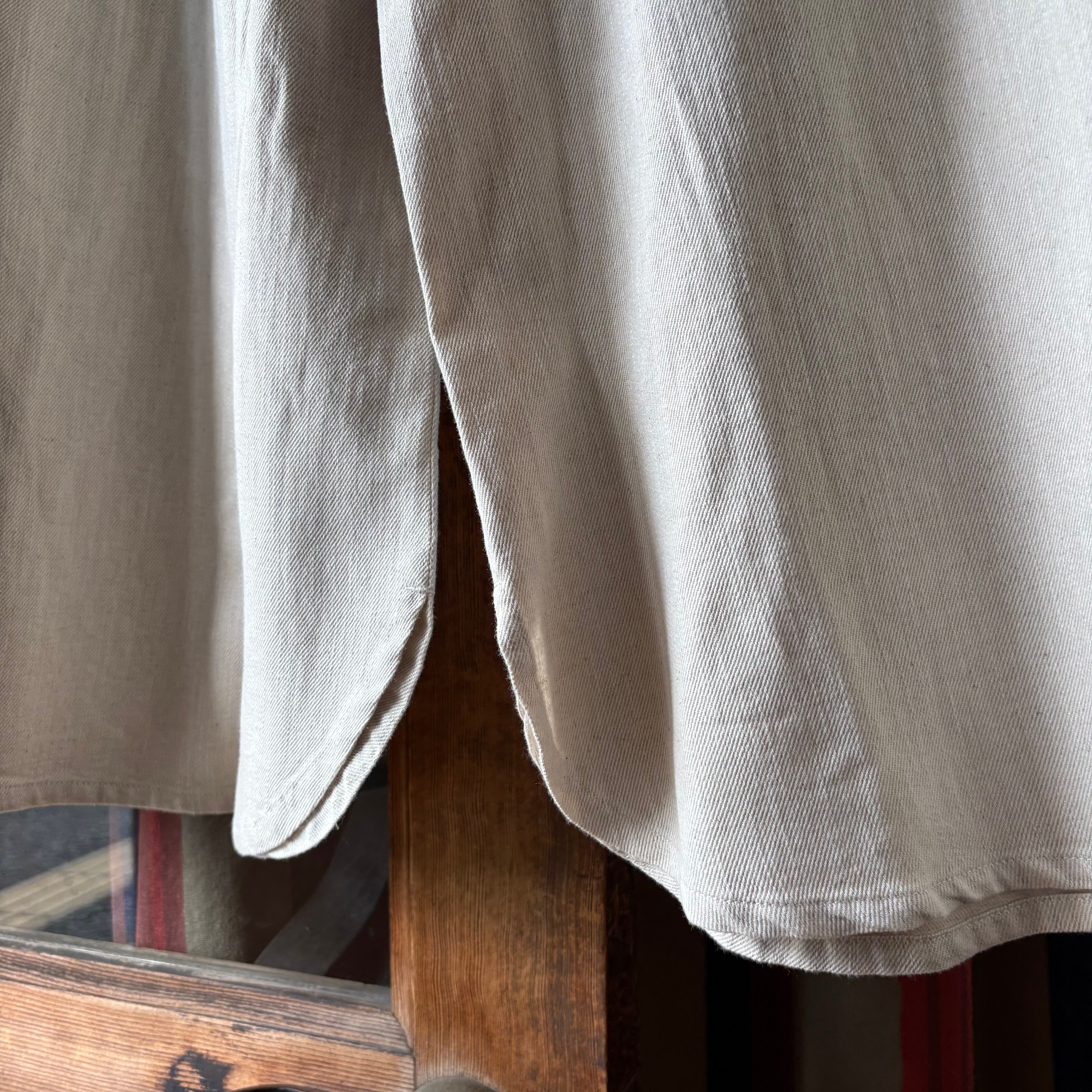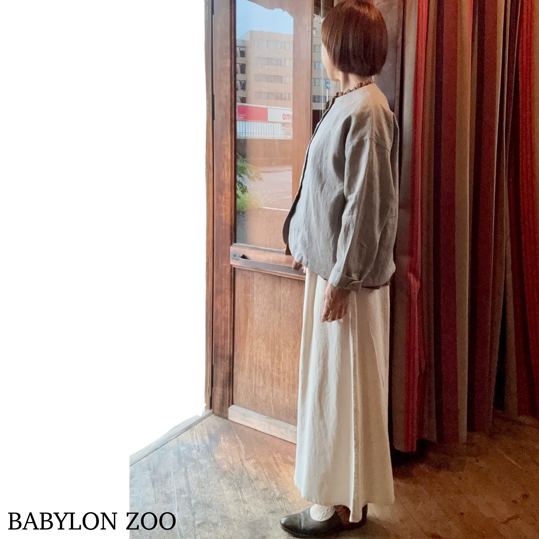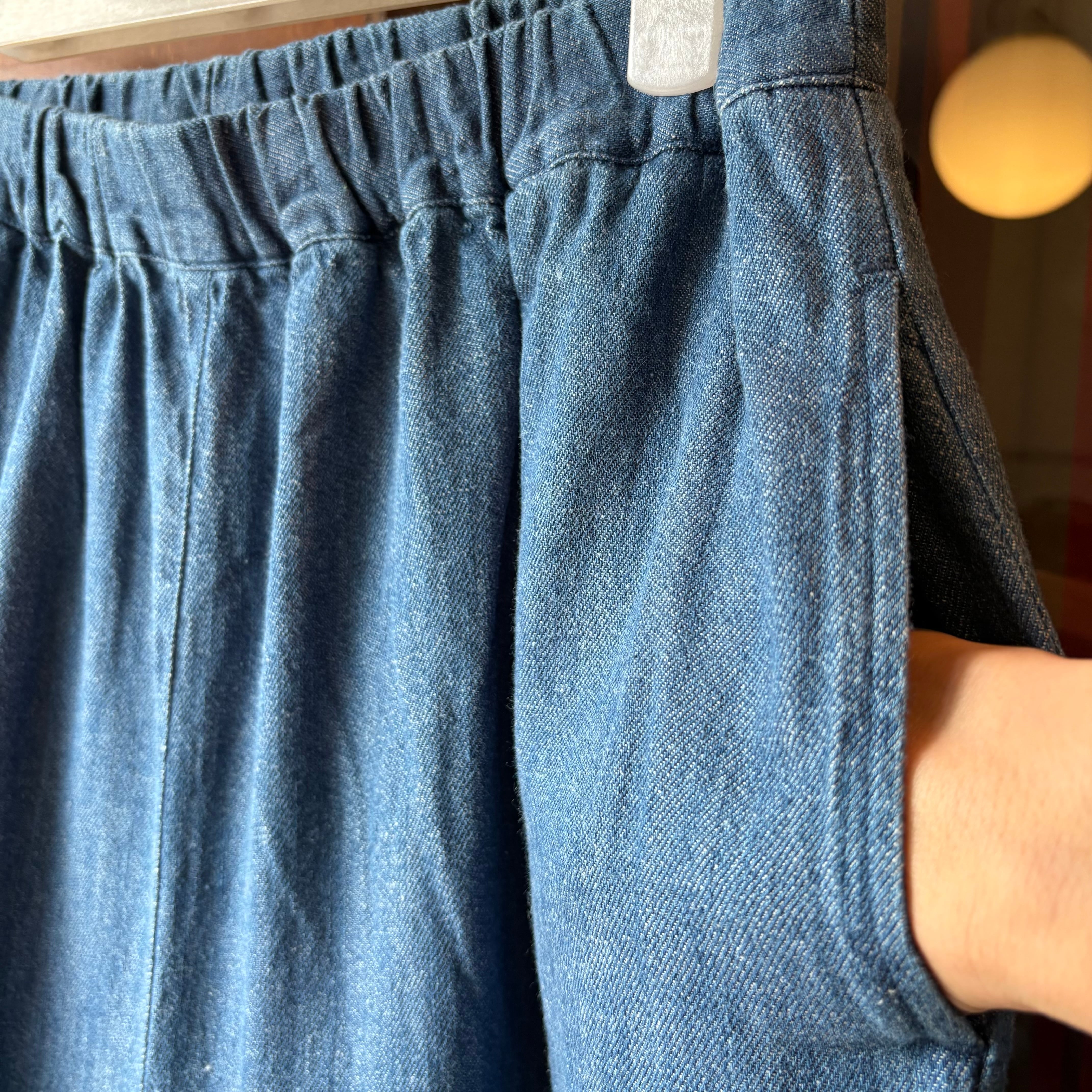 コットンリネン素材のデニムで、製品洗い加工を施して柔らかな風合いに仕上げてあります。