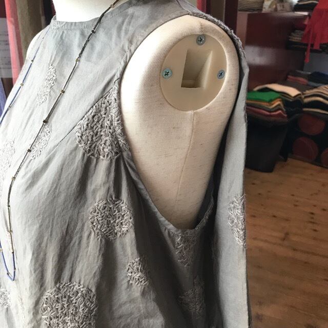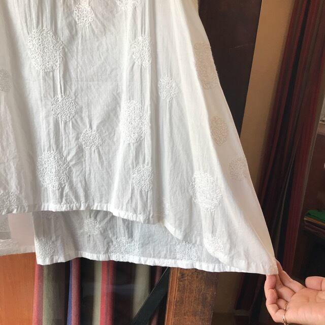 全体に大小様々な大きさのサークル型の刺繍を施した薄手コットンローン素材を使用。