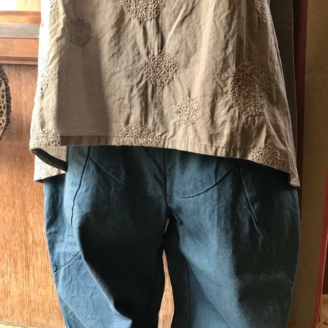 洗いを施すことによって、刺繍部分にナチュラルなシワができるのもこの素材の特徴です。