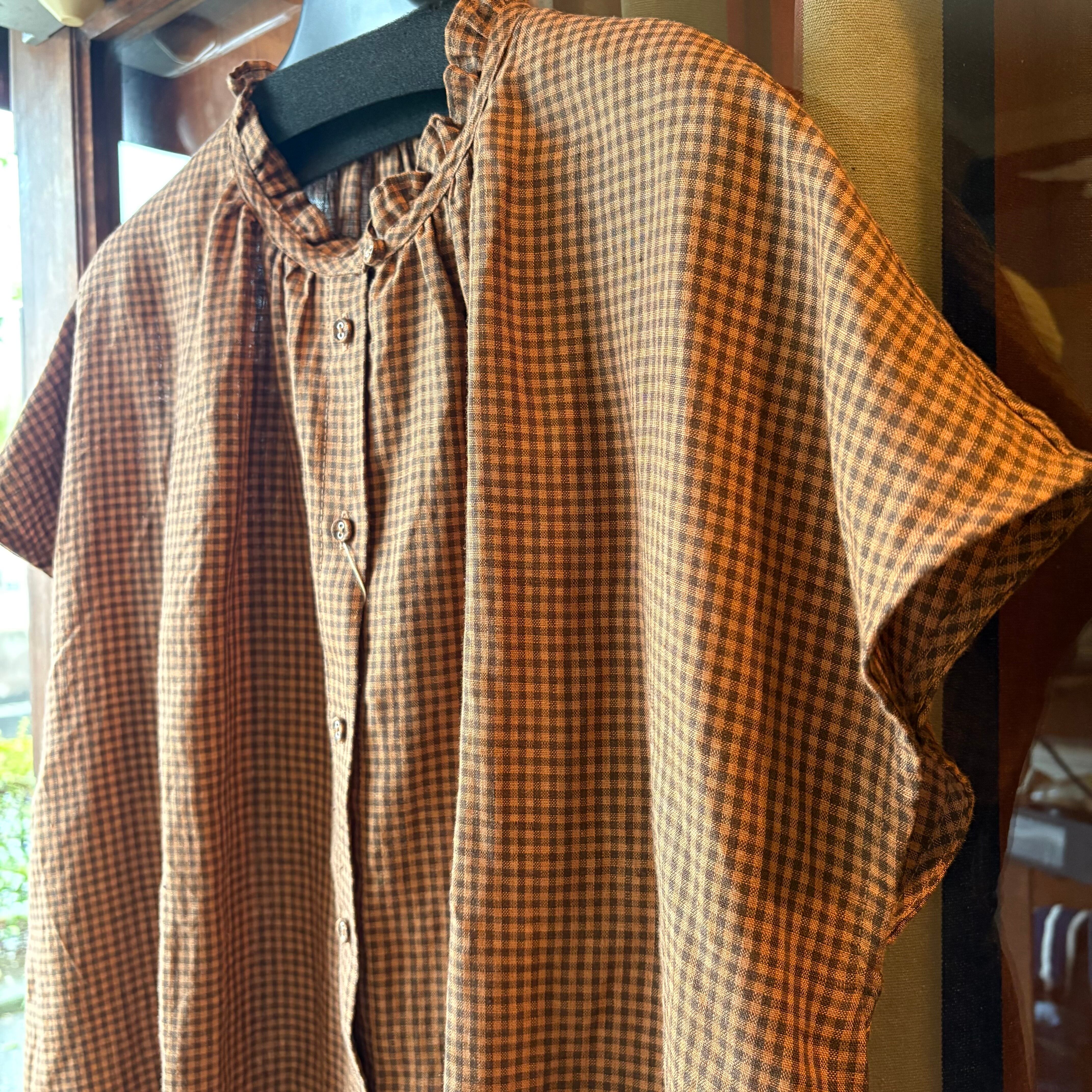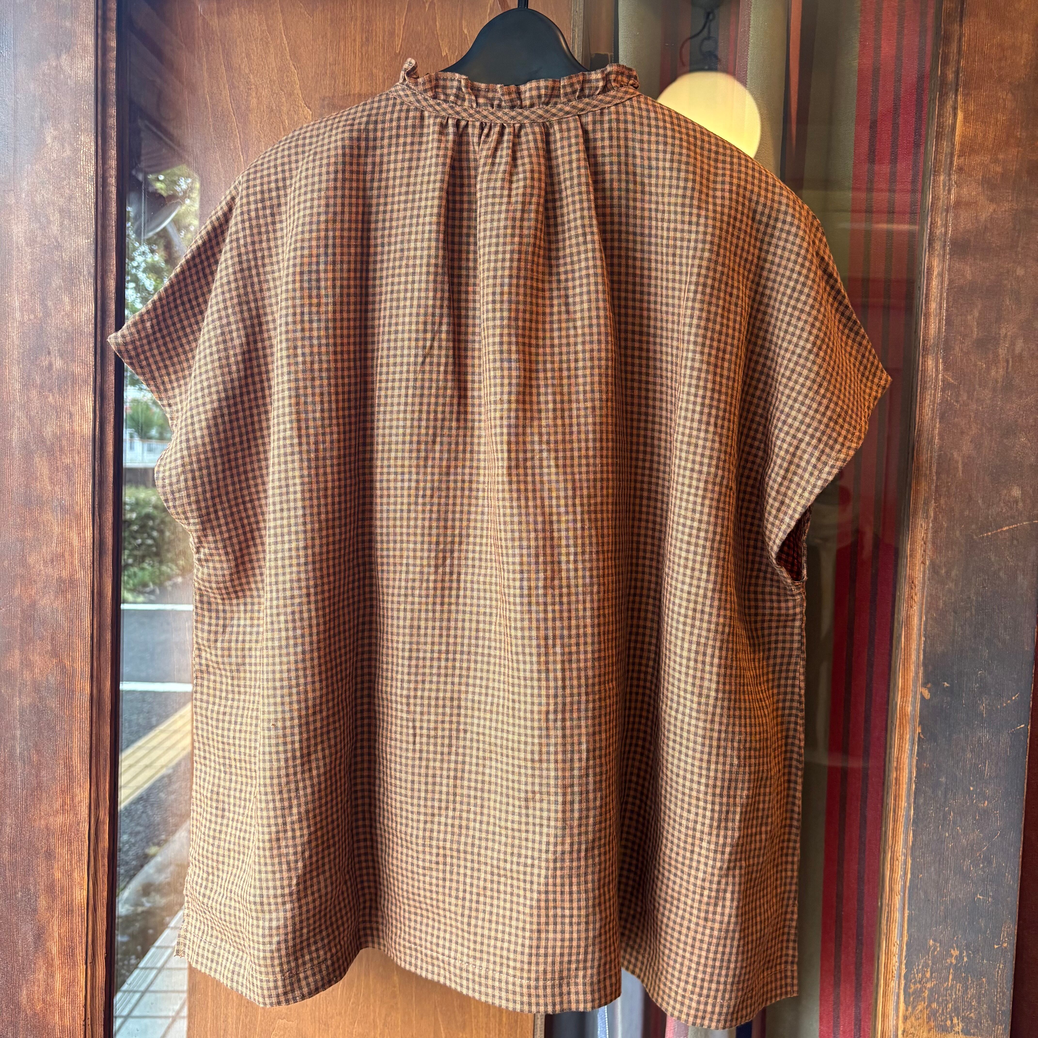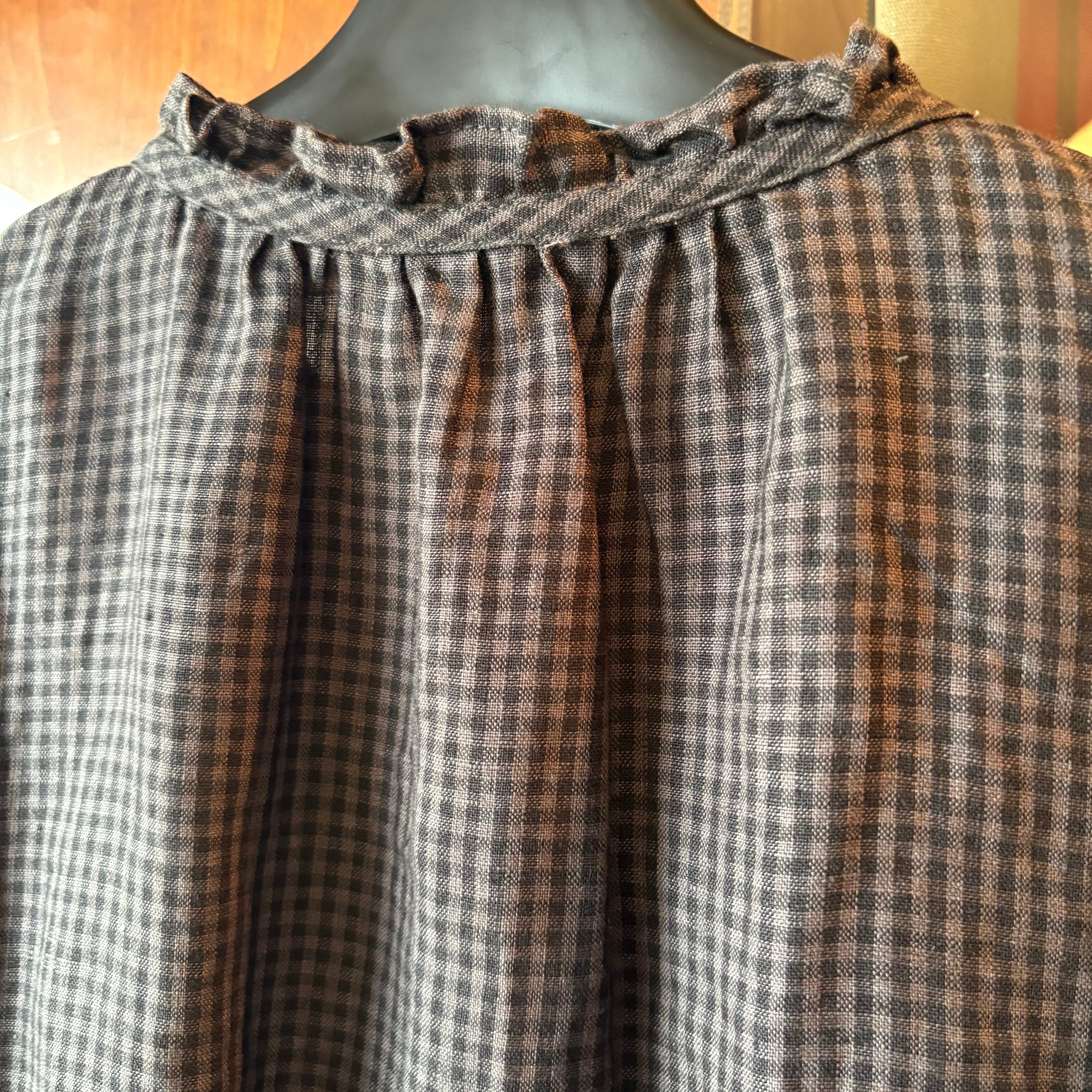 blue willowのリネンギンガムチェックフリルブラウス・ブラウン