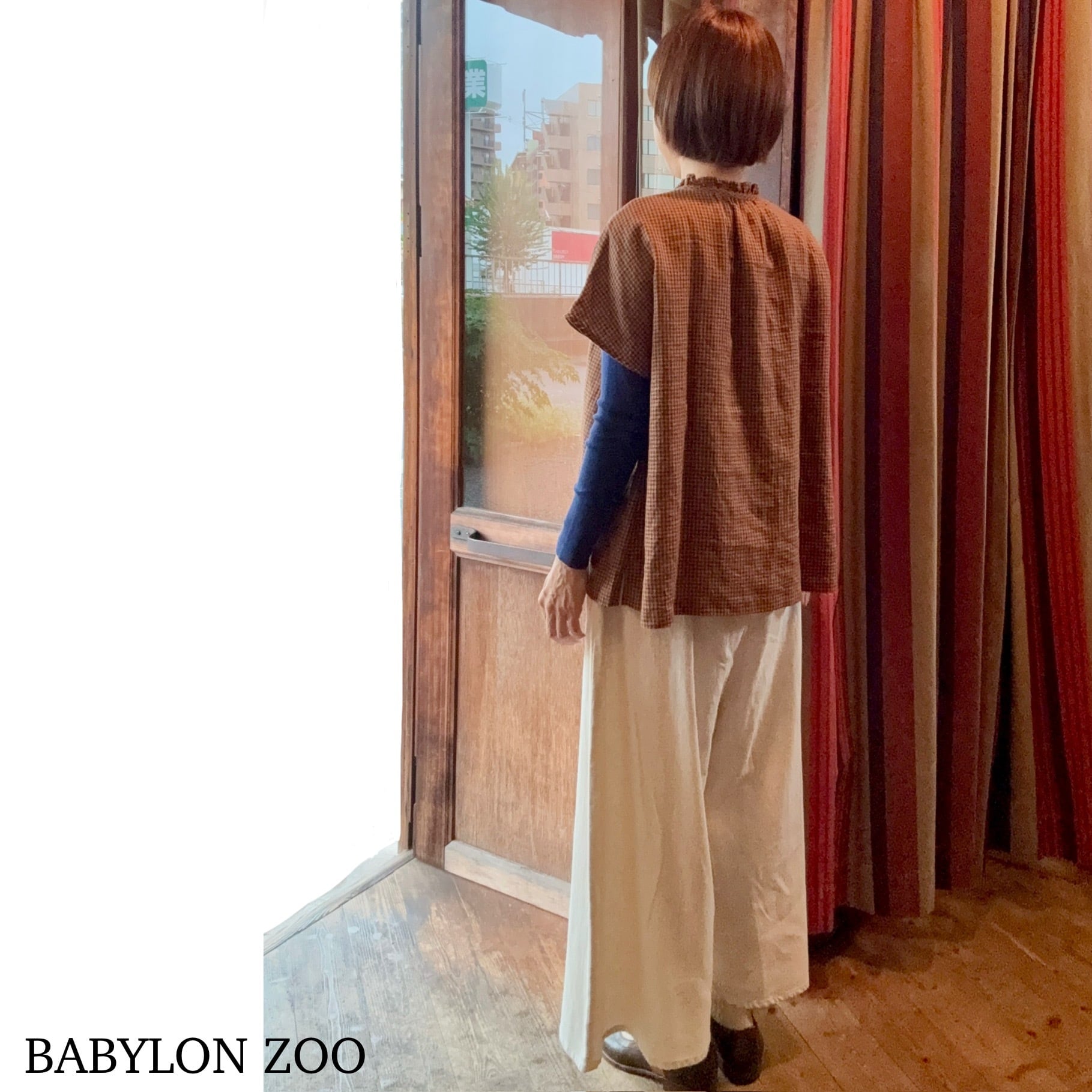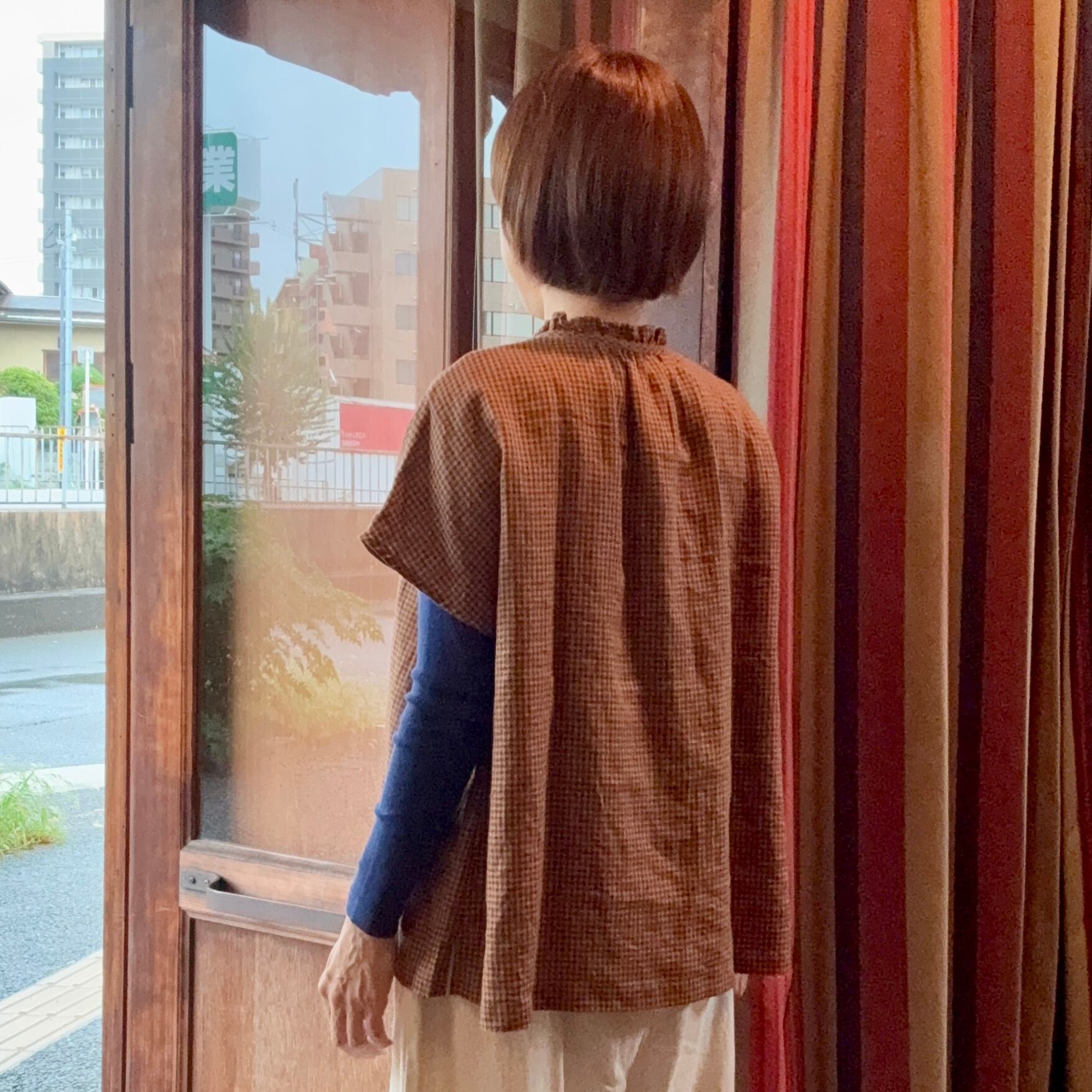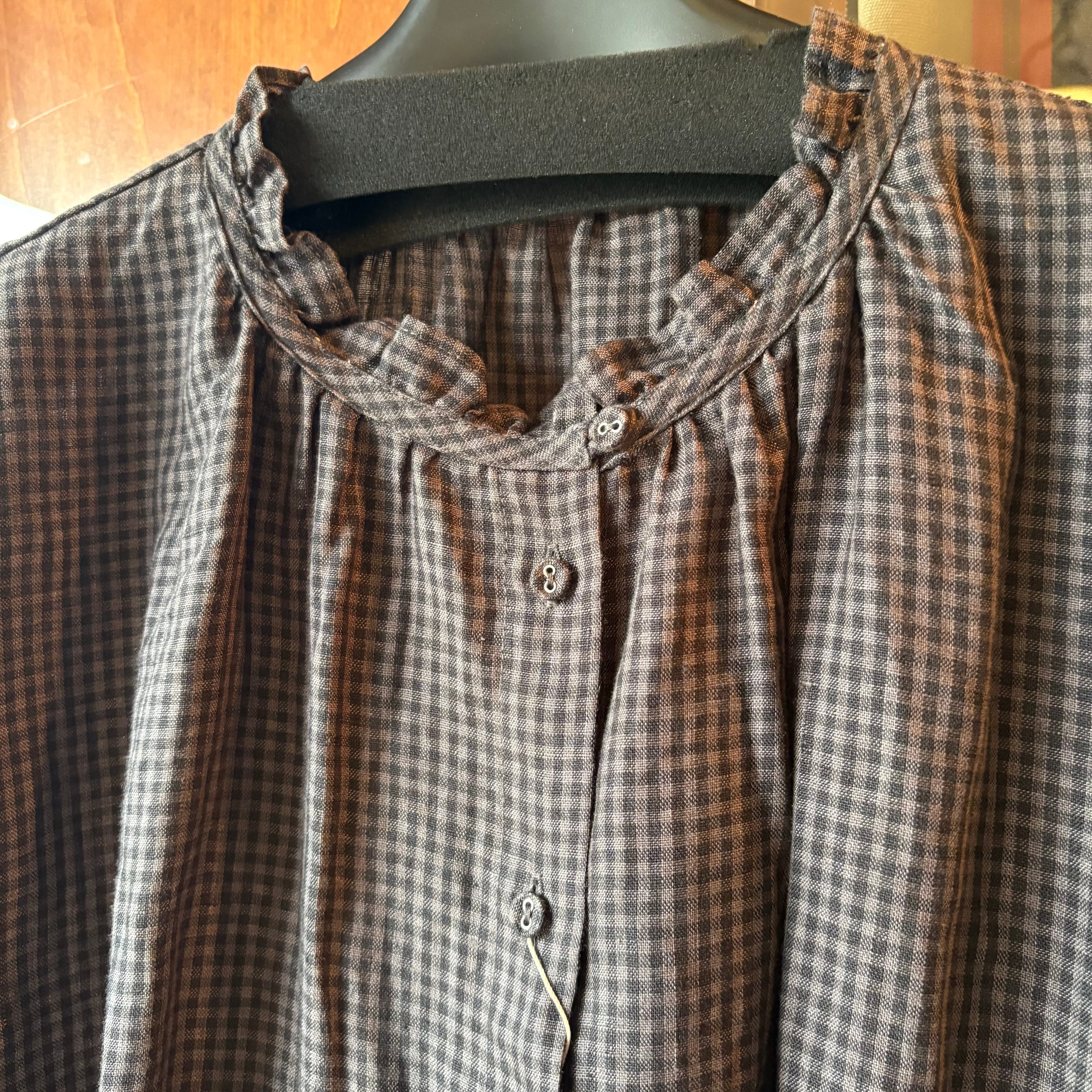 blue willowのリネンギンガムチェックフリルブラウス・ブラウン