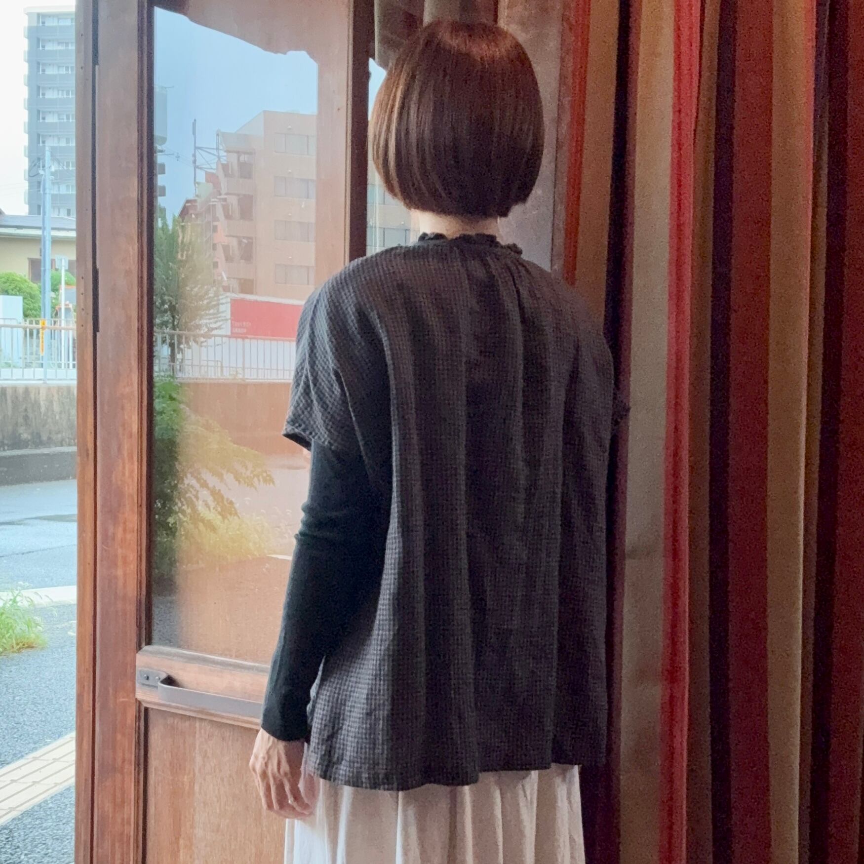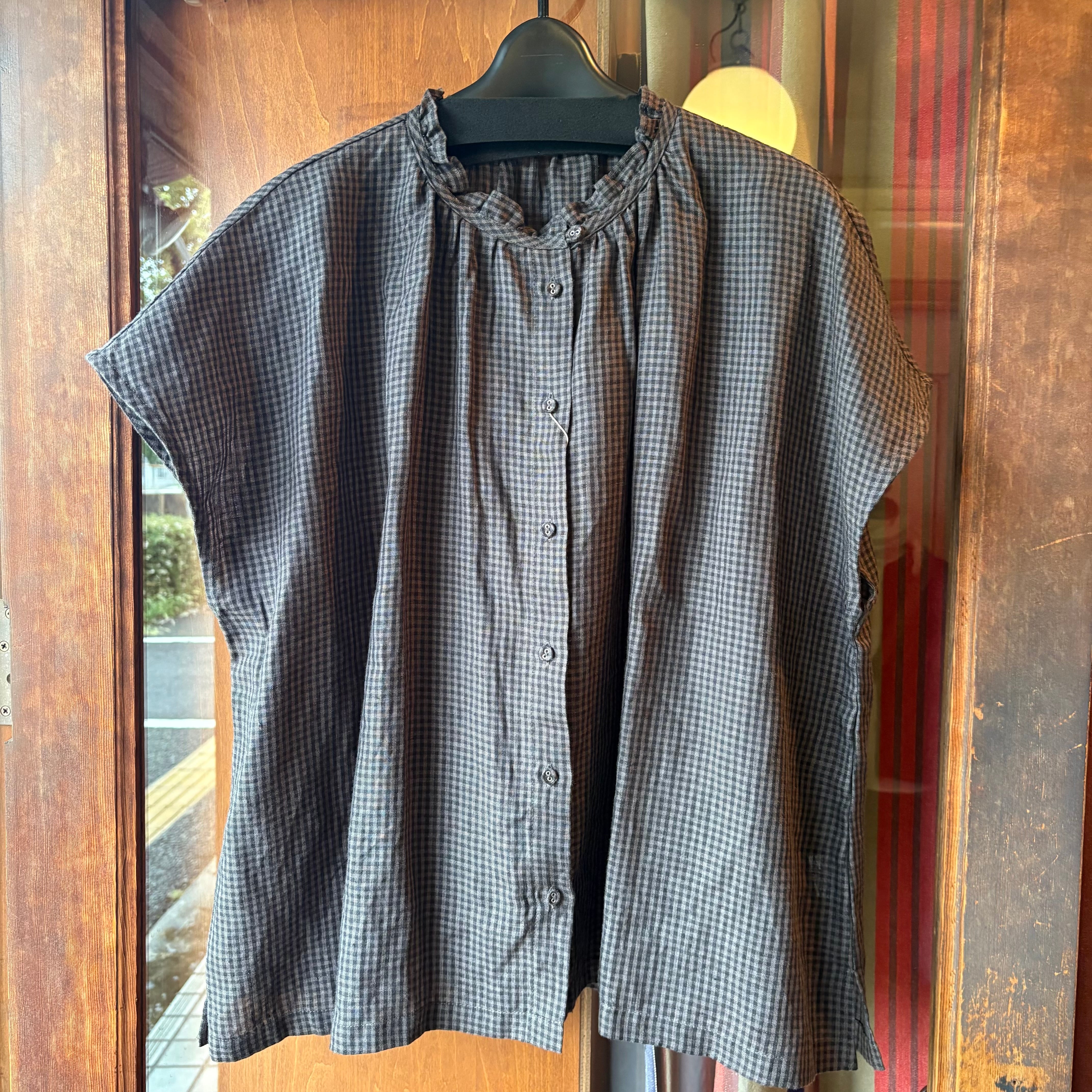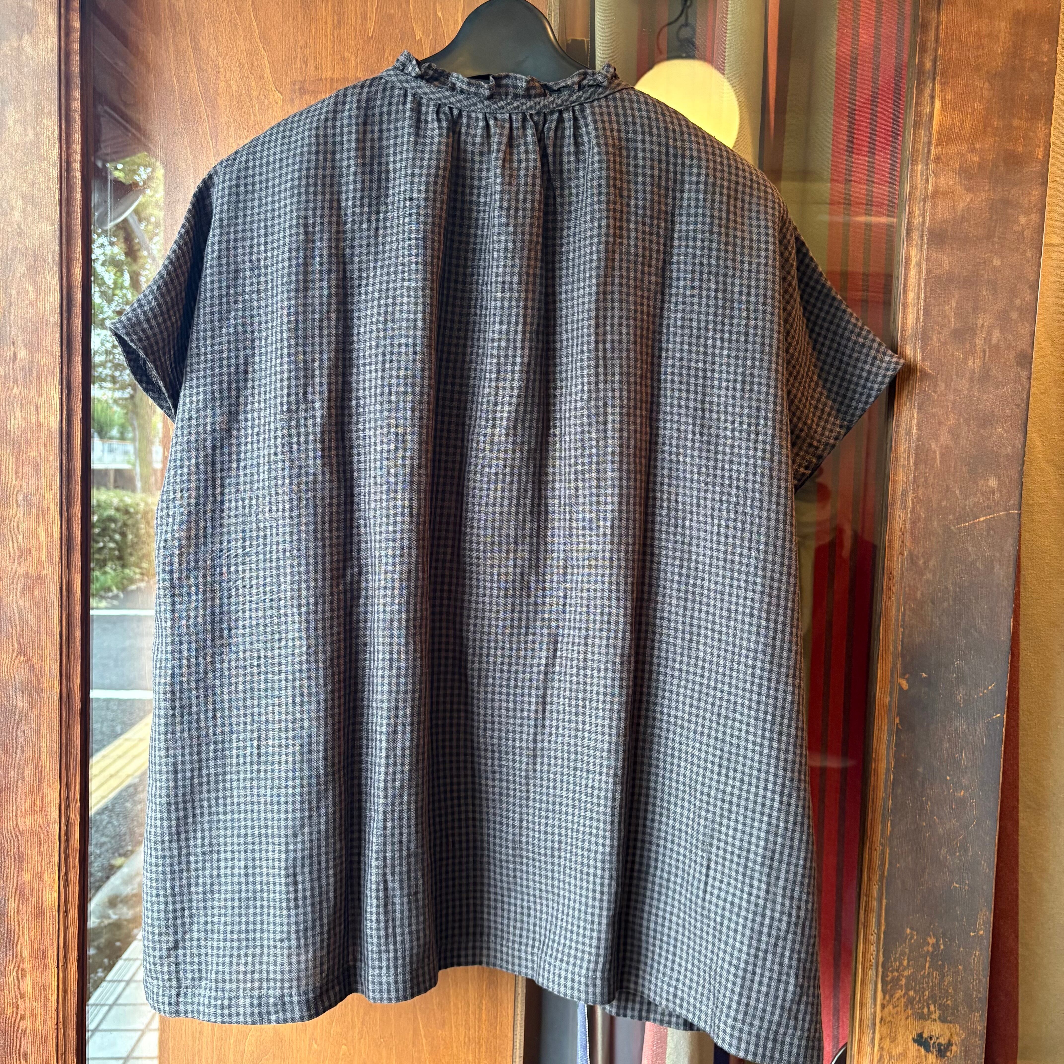 blue willowのリネンギンガムチェックフリルブラウス・ダークグレー