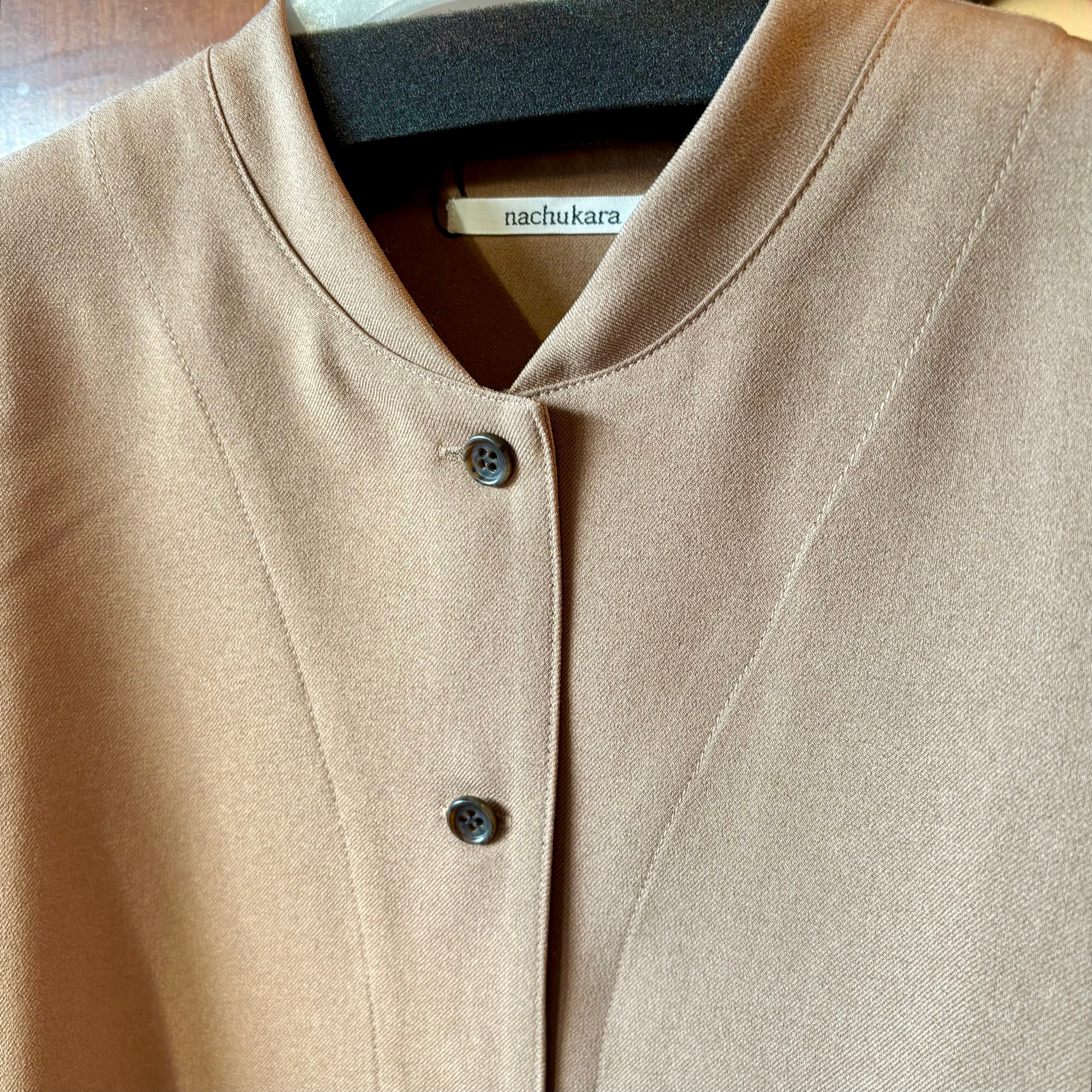 共布の細い衿と緩やかにラウンドさせた裾線がポイント。
