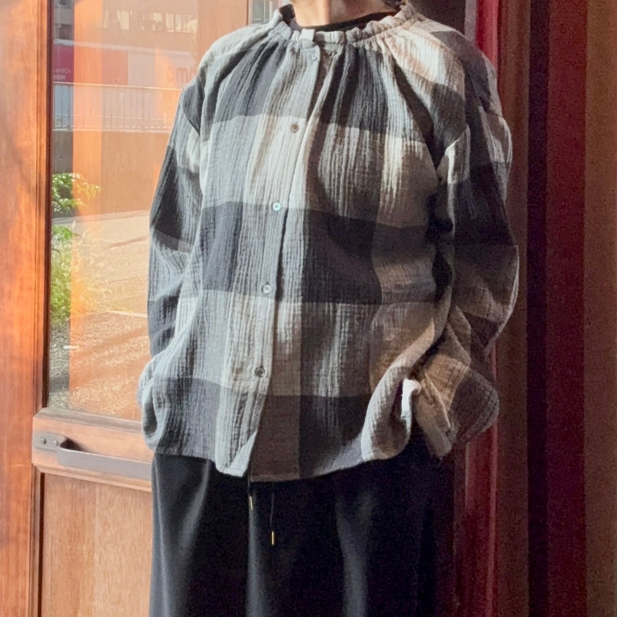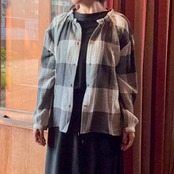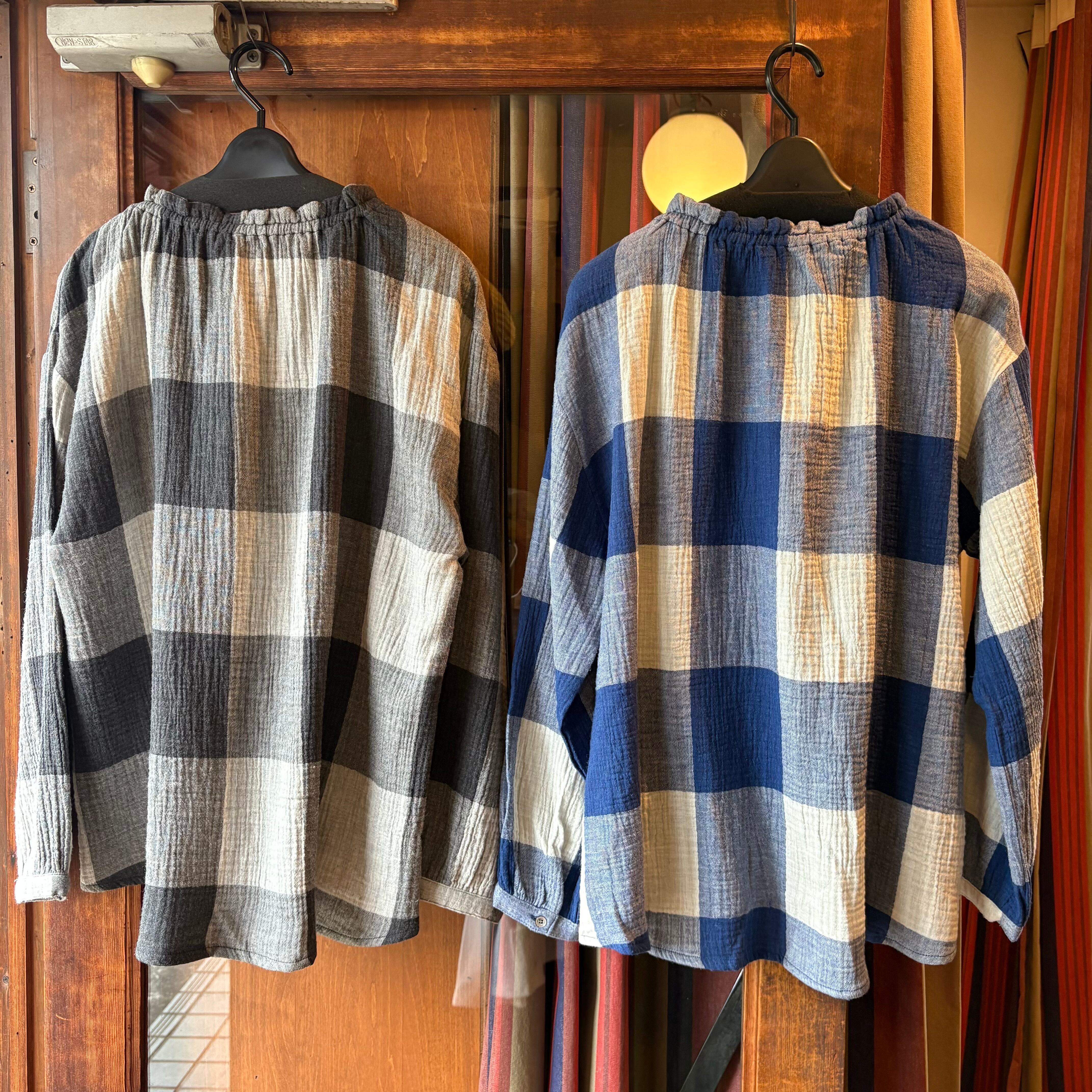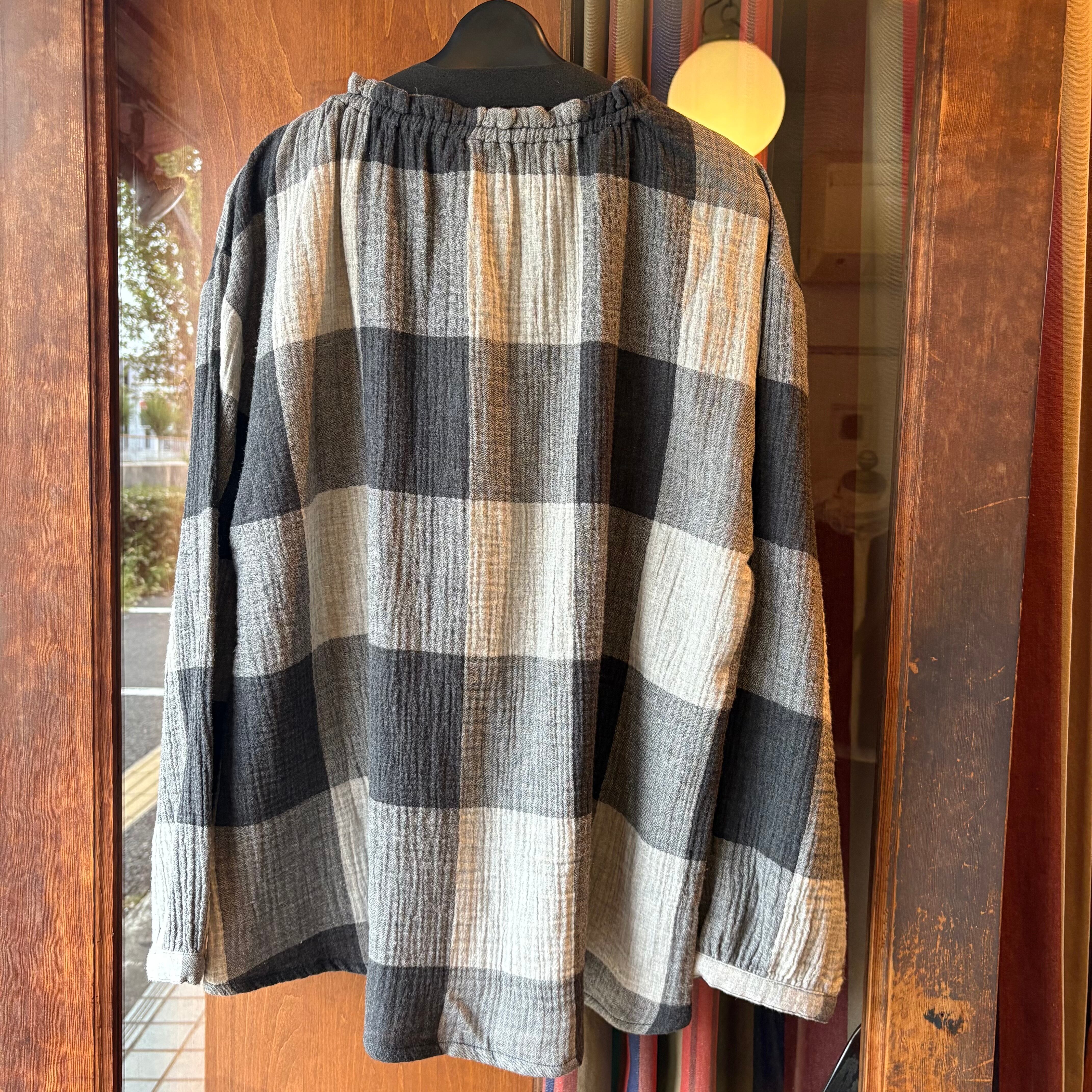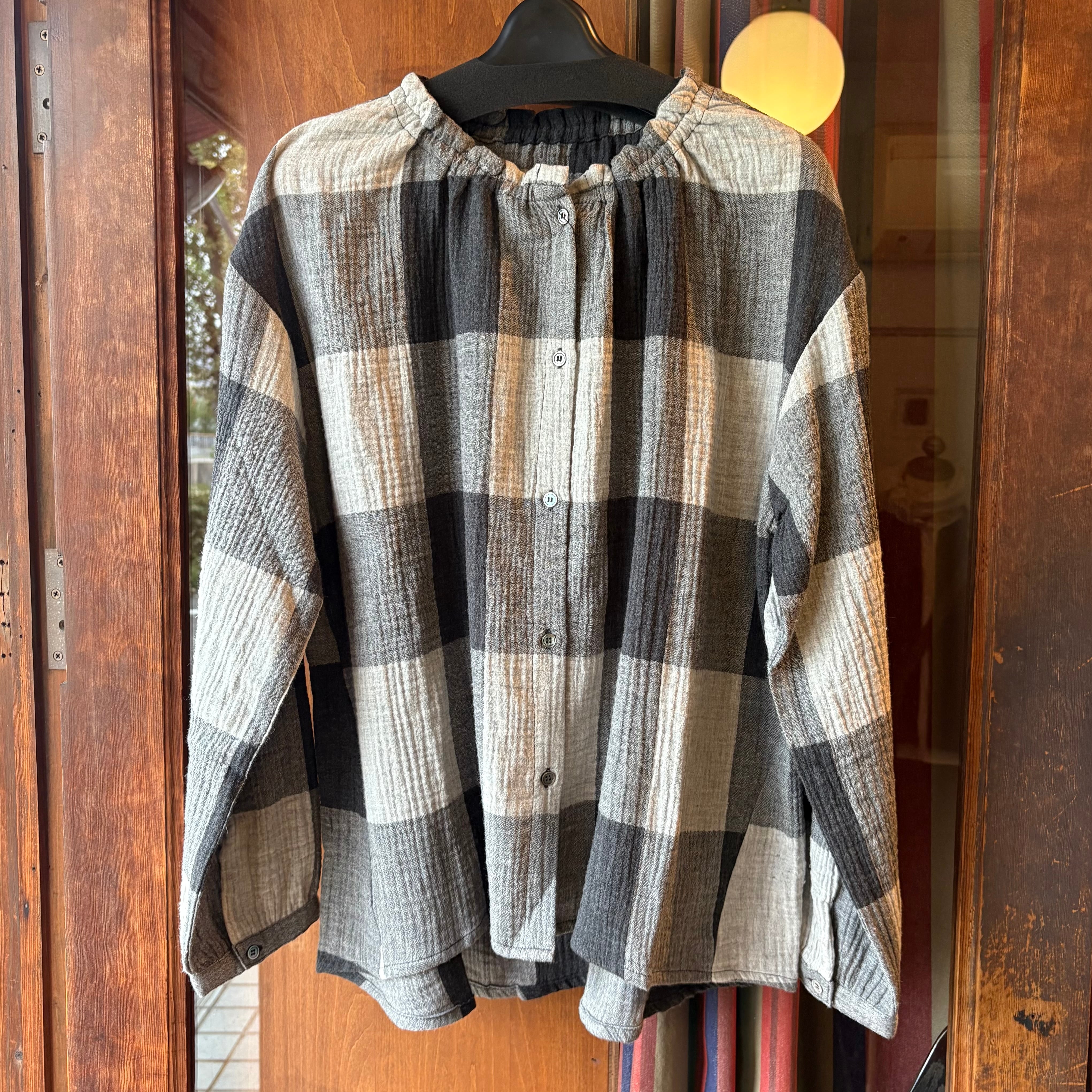 nachukaraのダブルガーゼ ギャザー衿ブラウス・グレーチェック