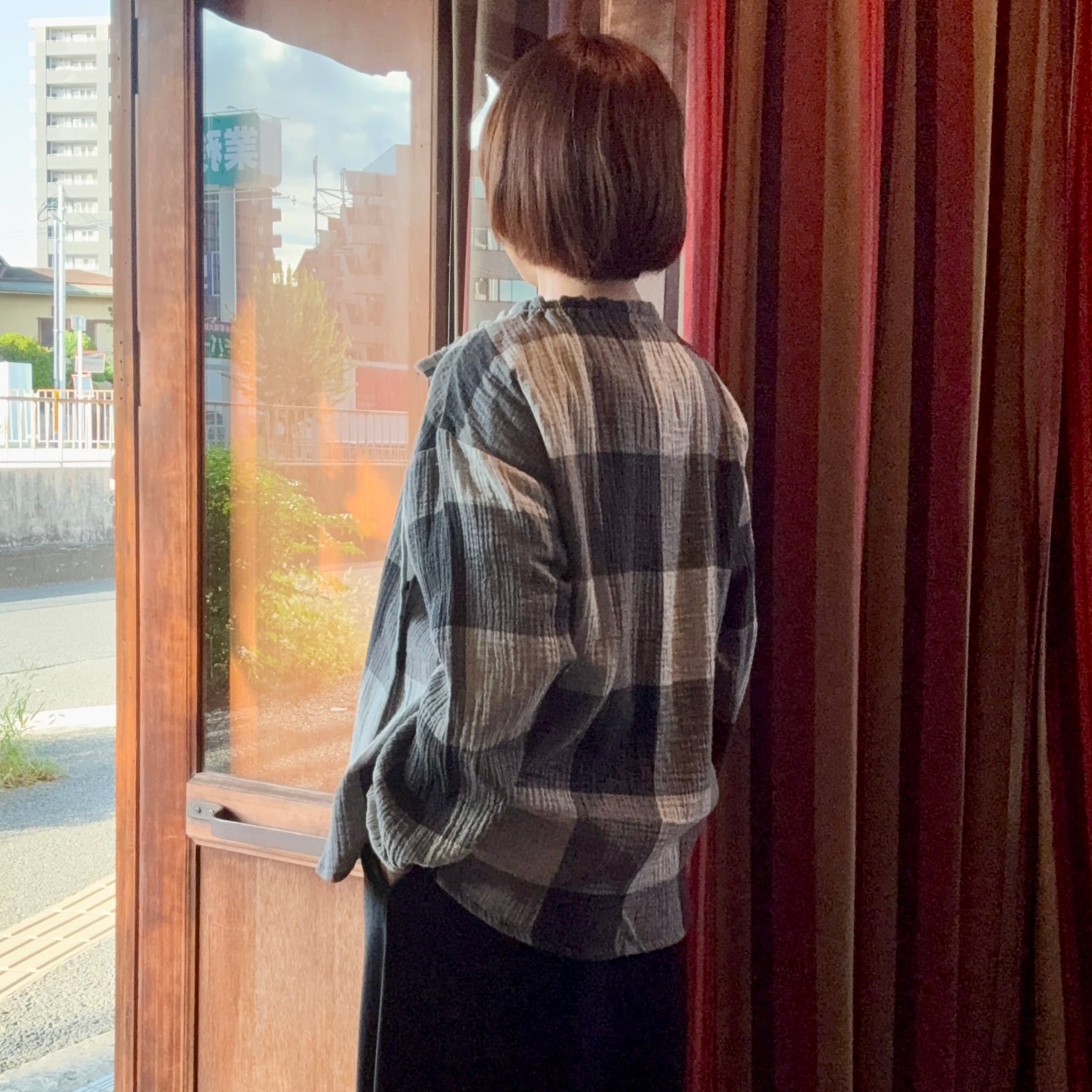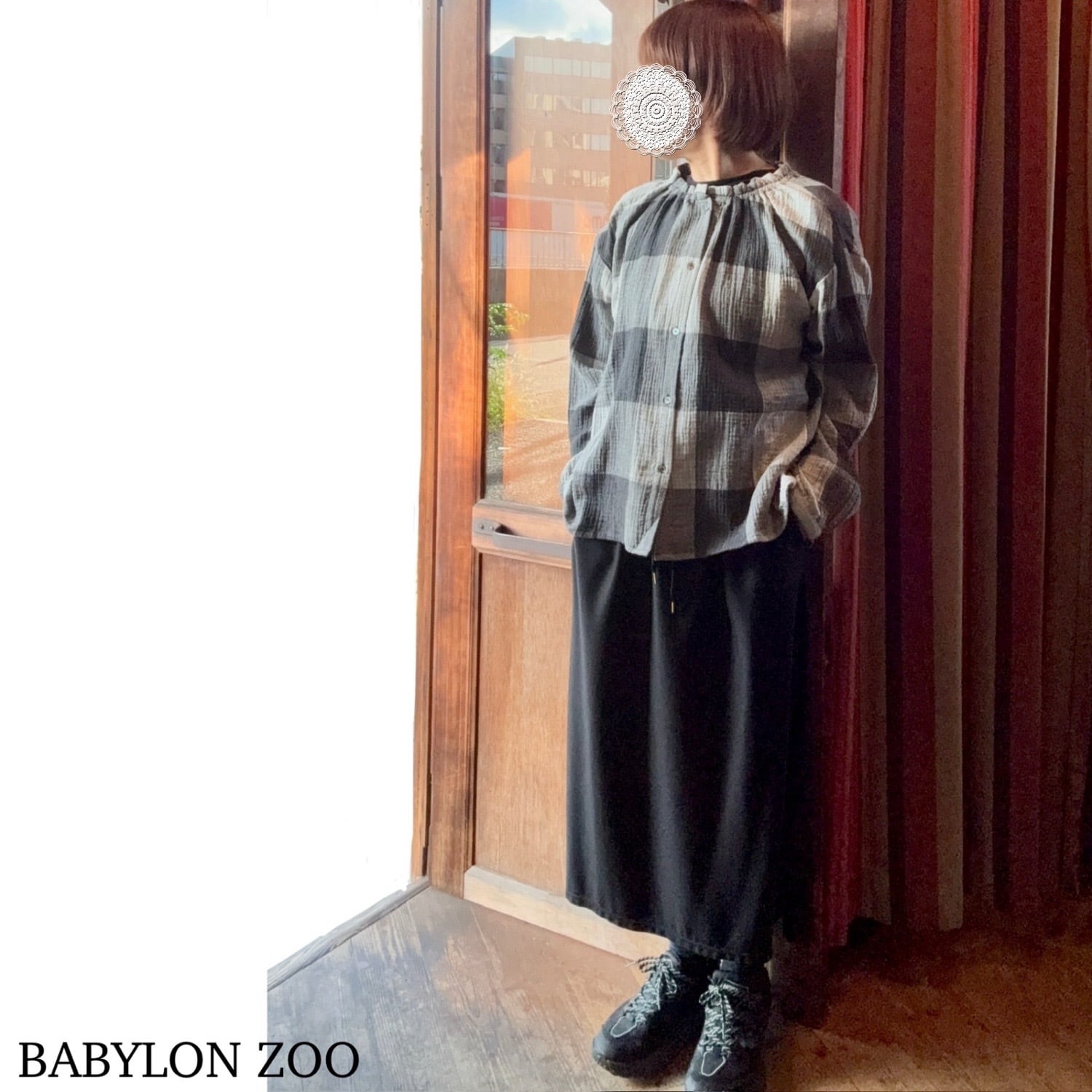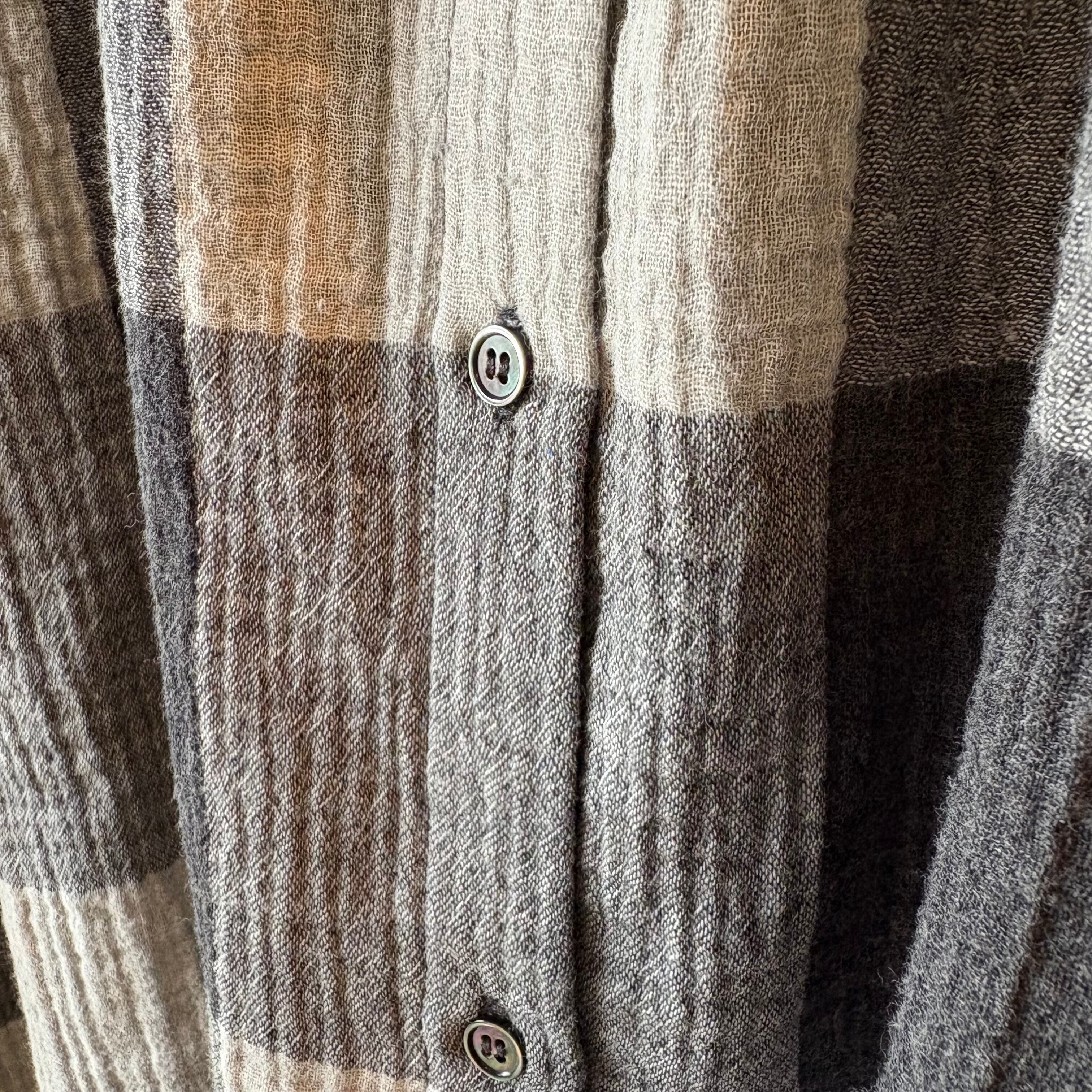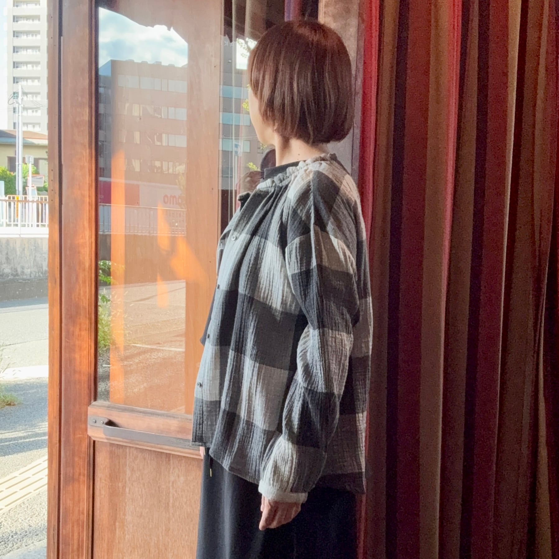 nachukaraのダブルガーゼ ギャザー衿ブラウス・グレーチェック