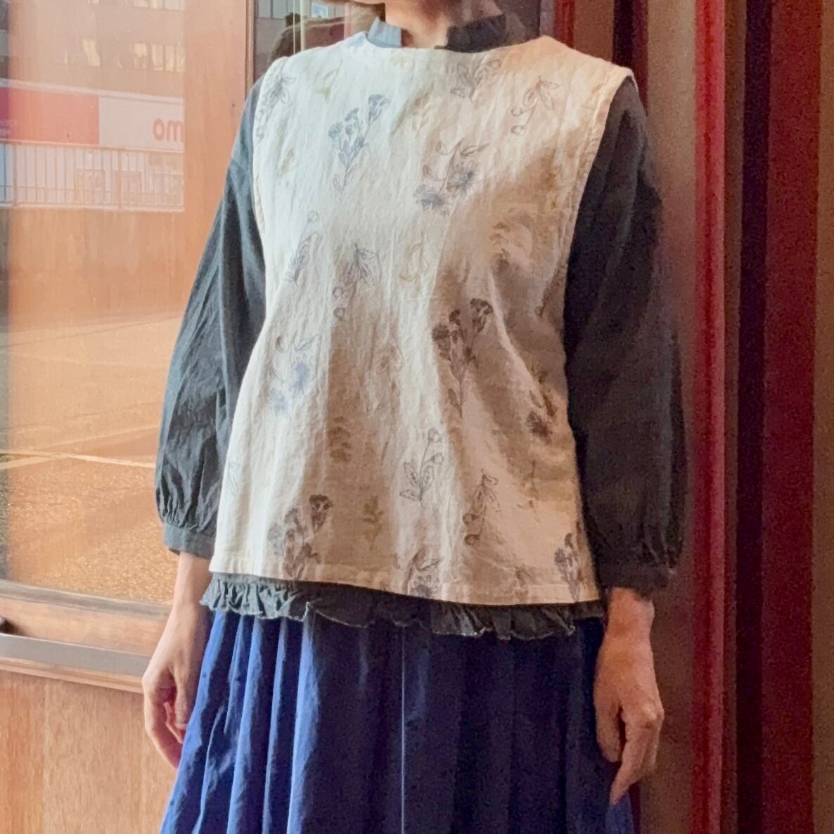 vmのインディゴ染め裾フリルプルオーバーブラウスです。