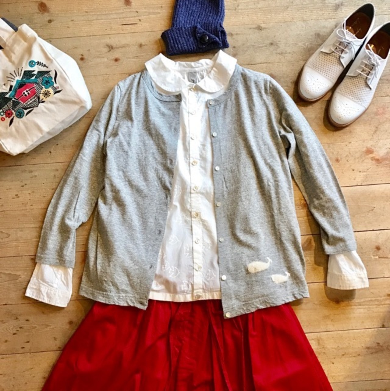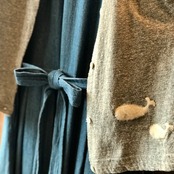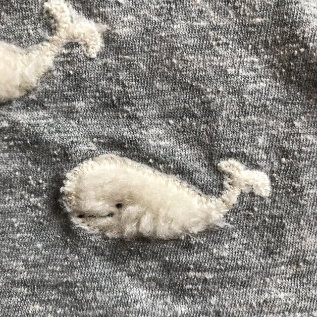 つぶらな瞳が可愛い親子クジラがちょこんとついたカーディガン。