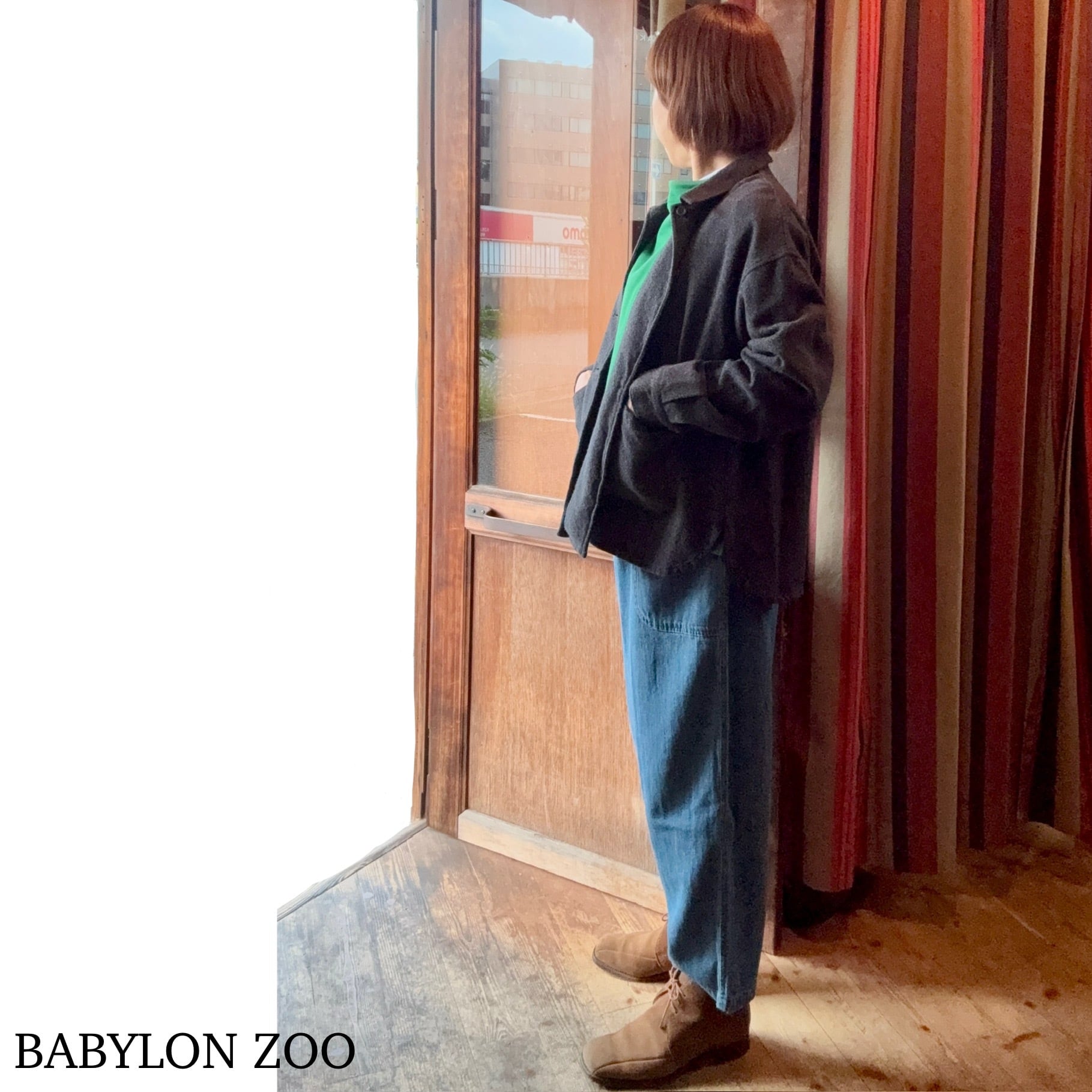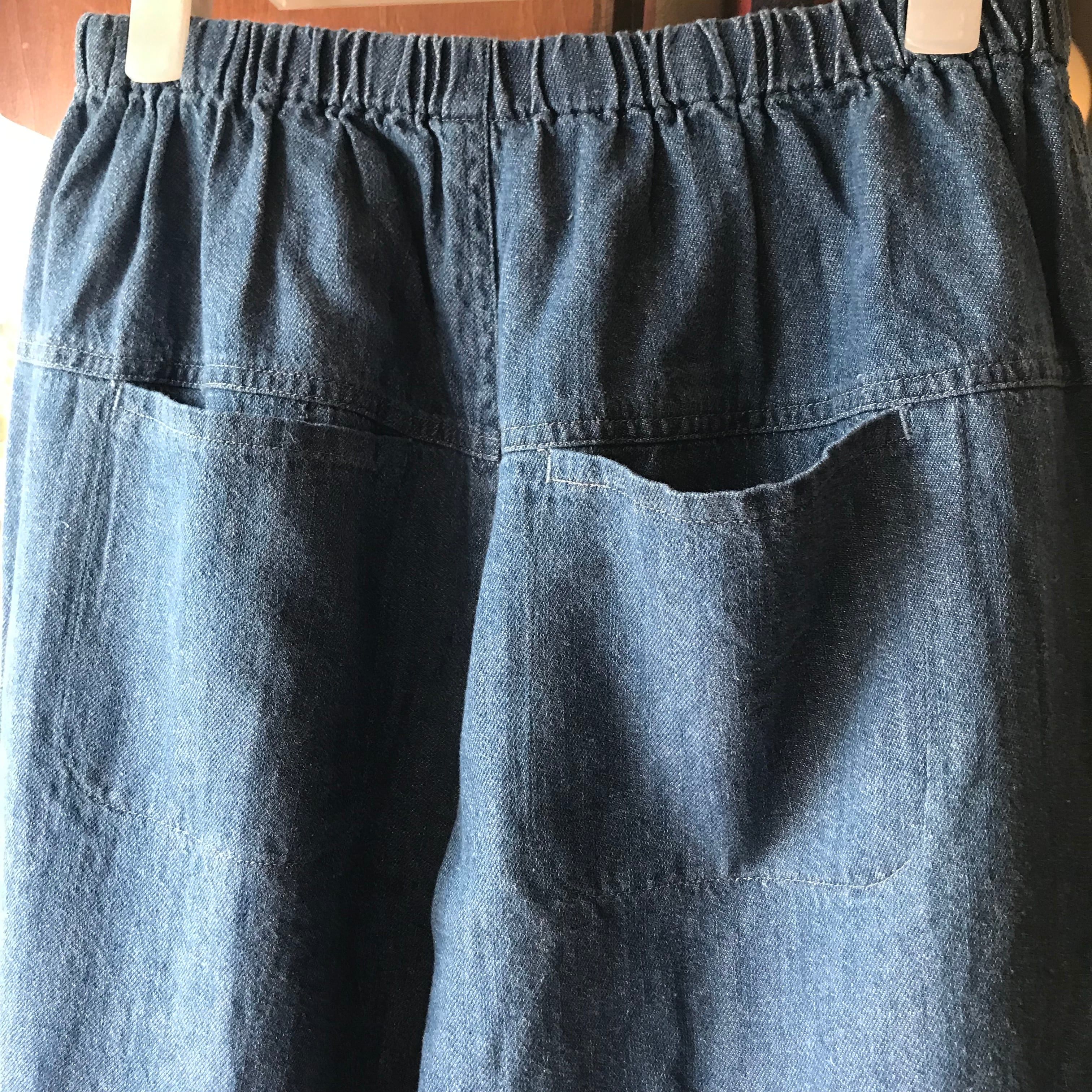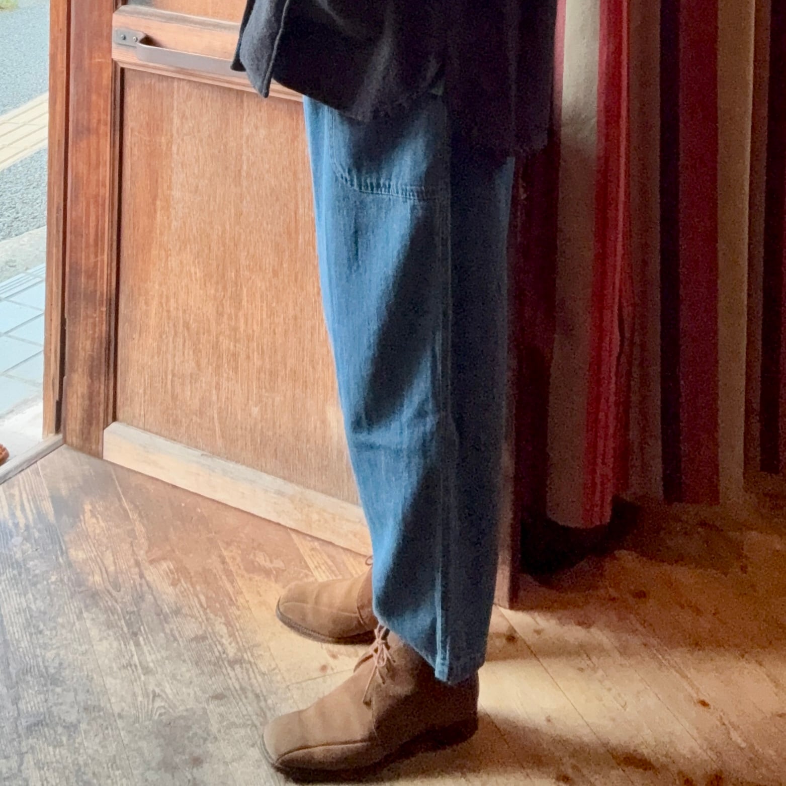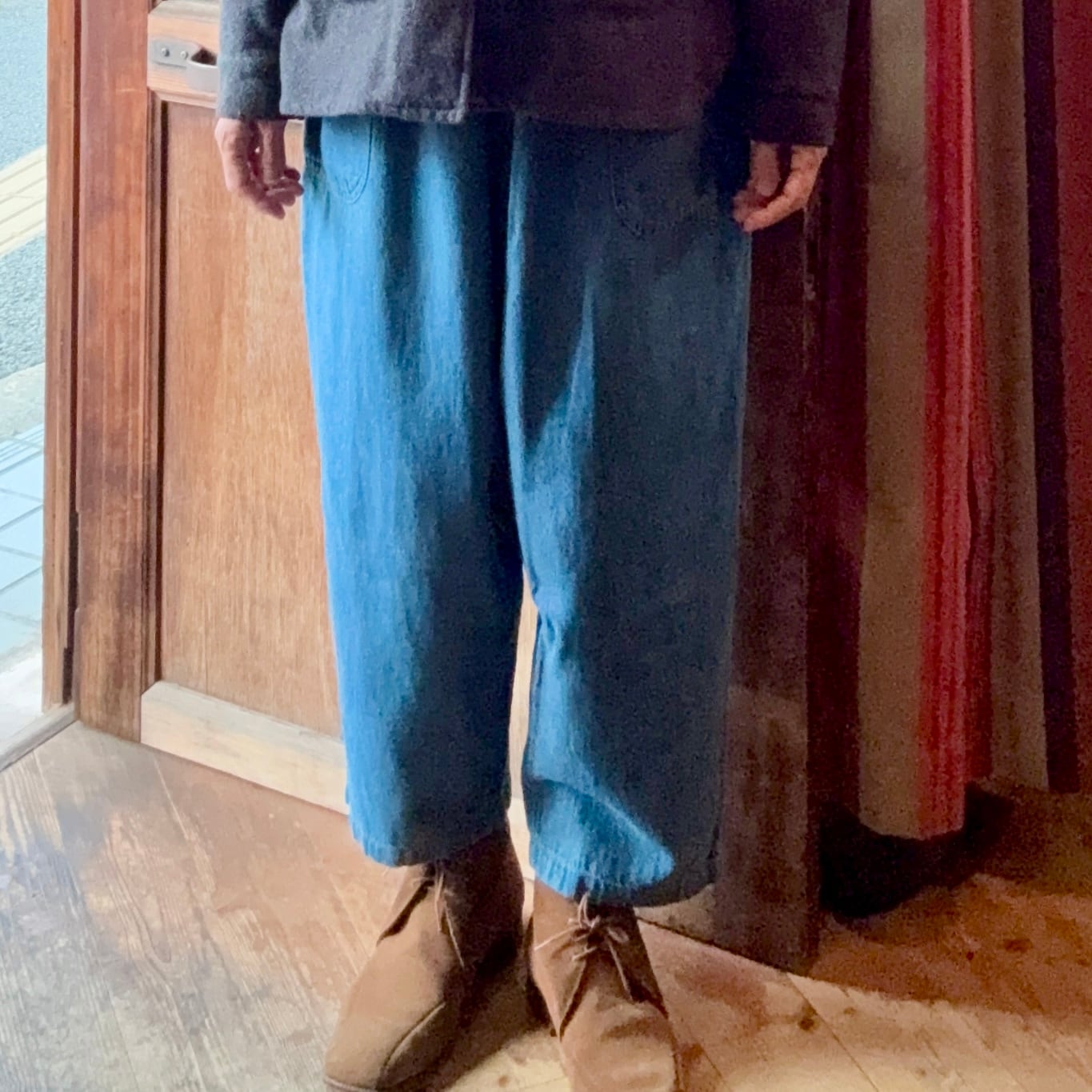 コットンリネン素材のデニムで、製品洗い加工を施して柔らかな風合いに仕上げてあります。