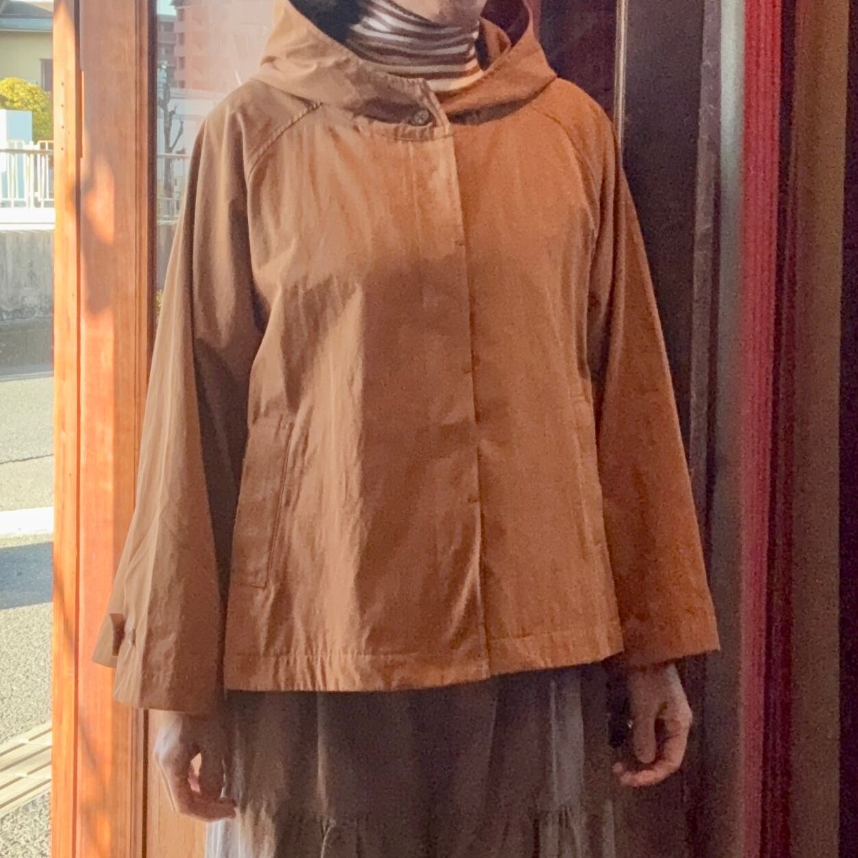 nachukaraのフード付きフレアショートコート・キャメル