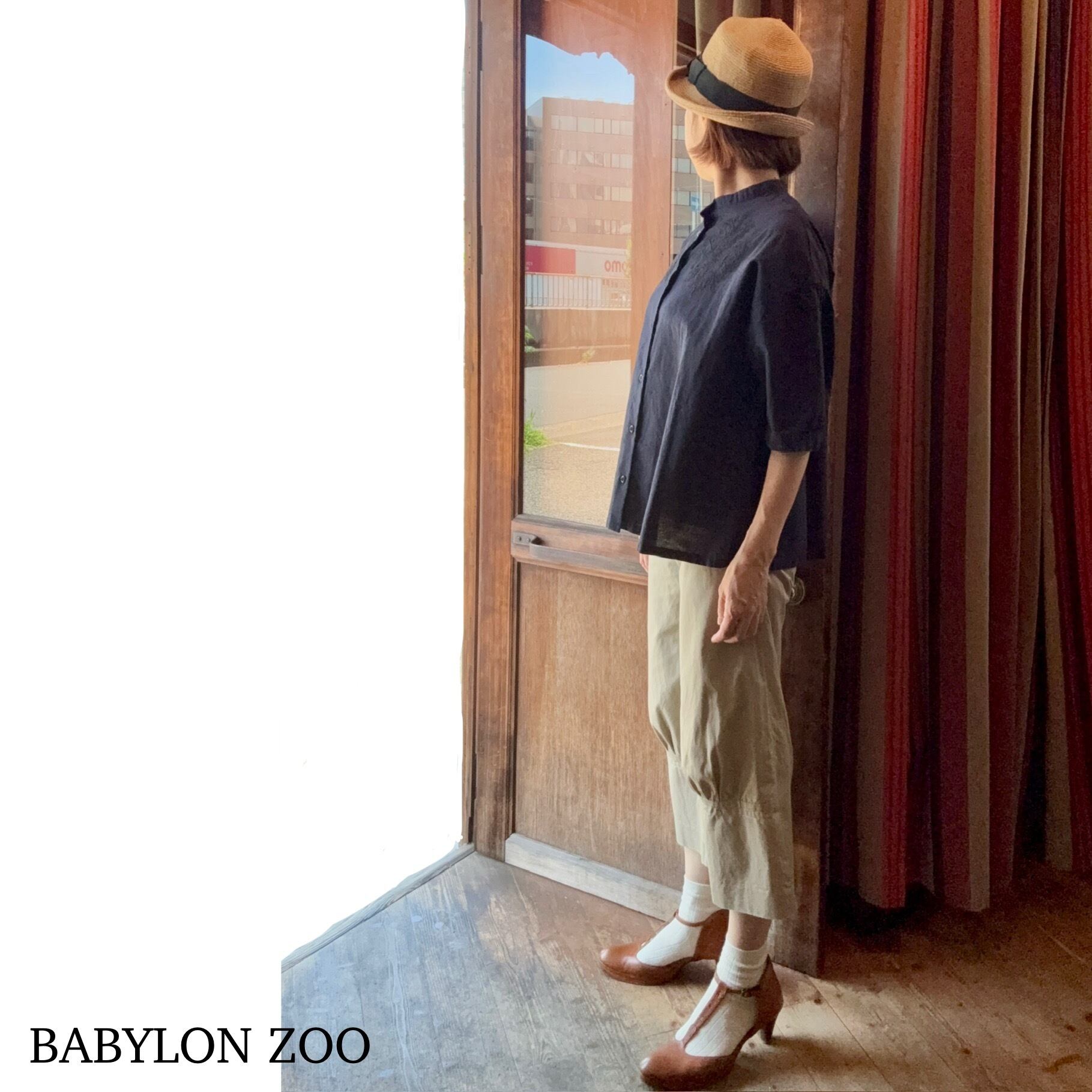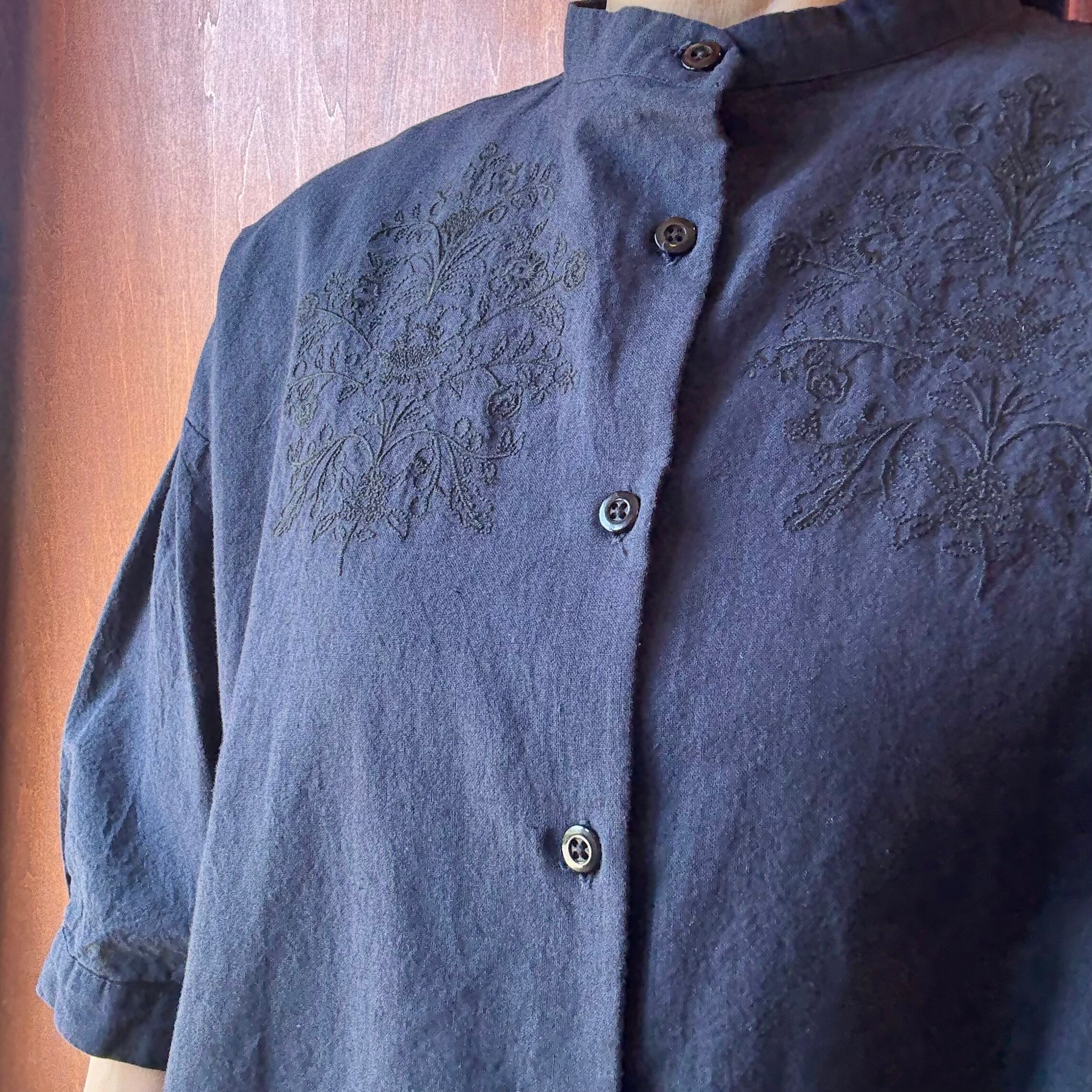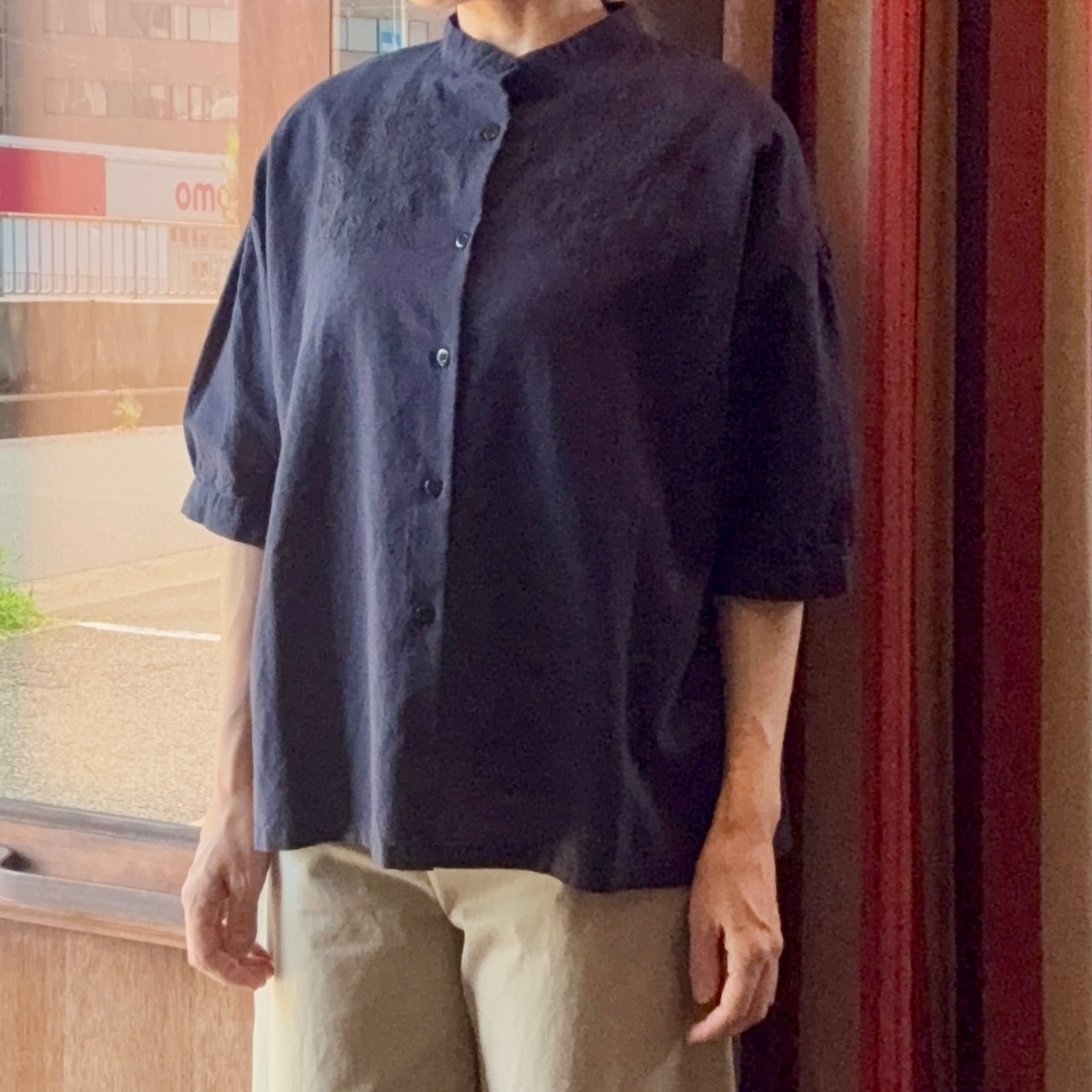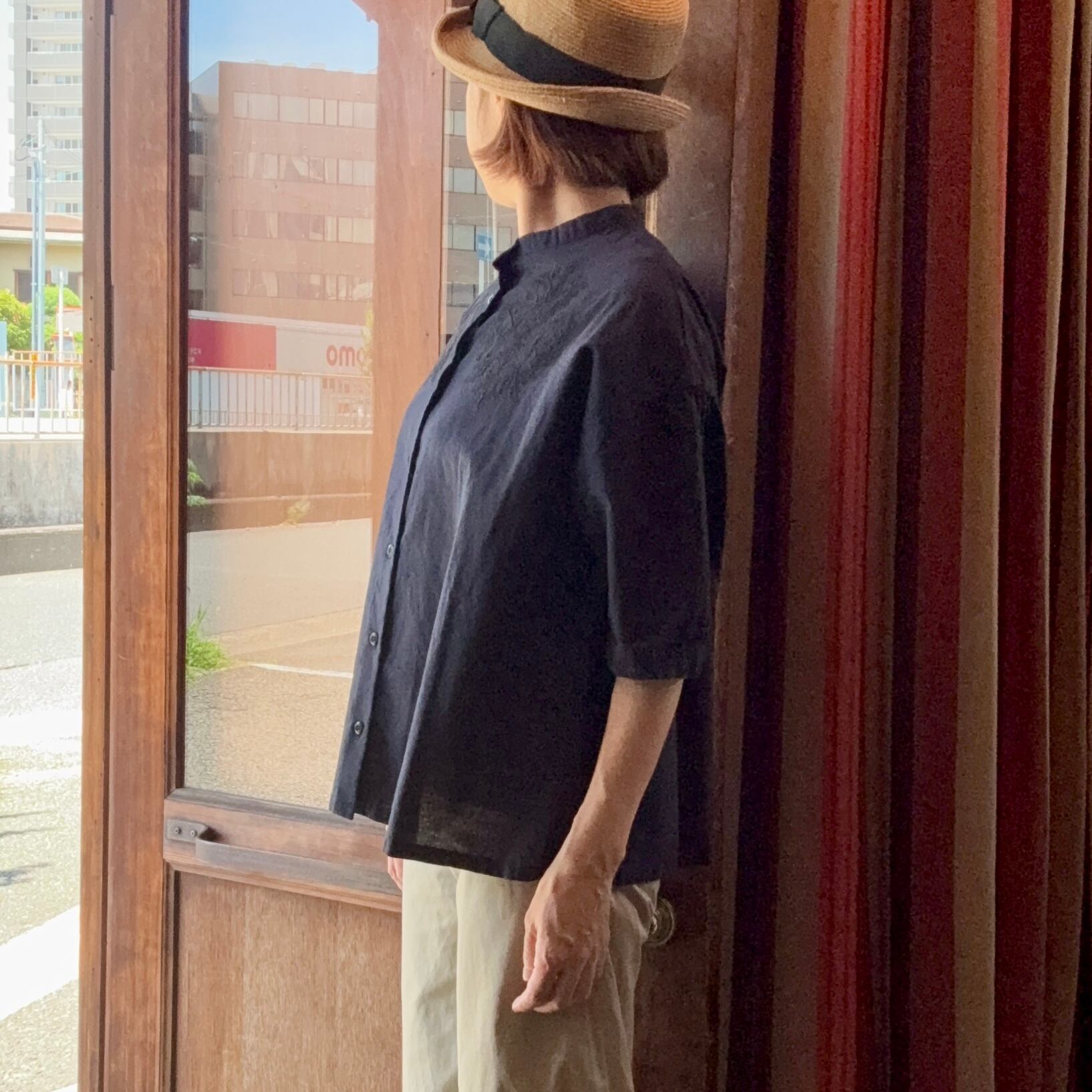 tukuroiのフラワー刺繍コットンリネンスタンドカラーブラウス・ネイビー