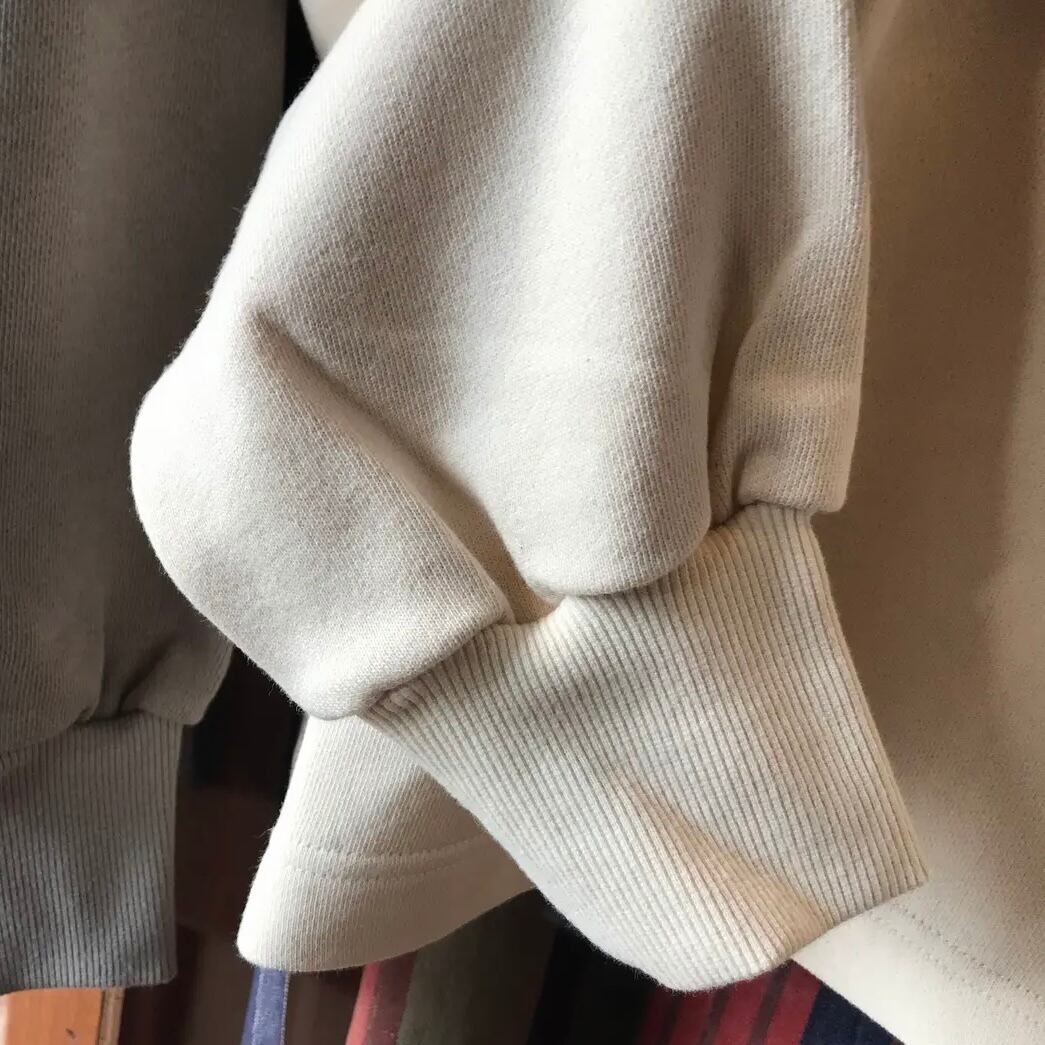 ゆったり身幅、裾はリブではないので締めつけ感のない楽な着心地です。