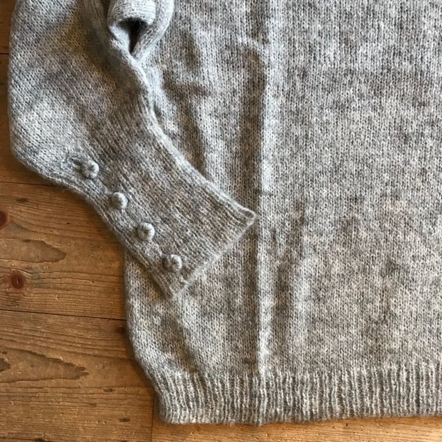 袖のリブに付いた飾りの毛糸ボタンが可愛い。