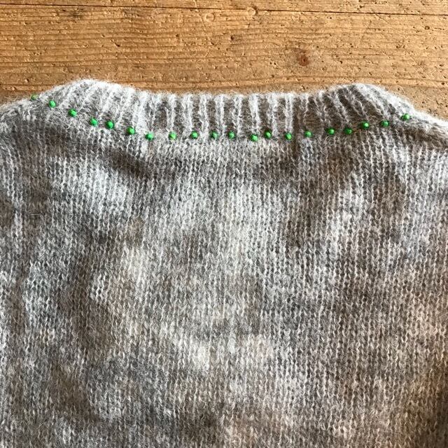 衿元にペッパーのようなウッドビーズを付けた薄手のVネックニット。