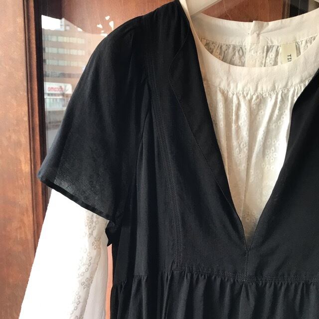 丸いお花刺繍のエンブロイダリーコットンと、無地のローンコットン素材のコンビネーションブラウス。