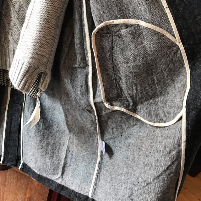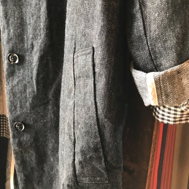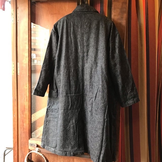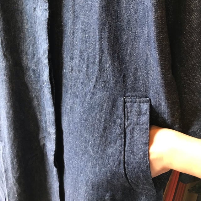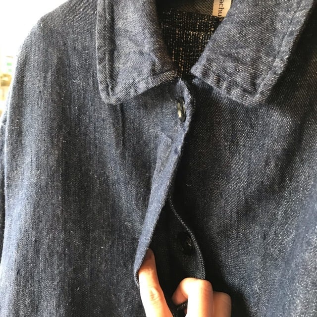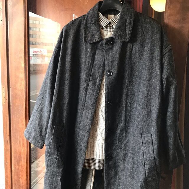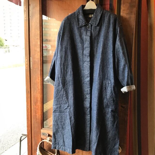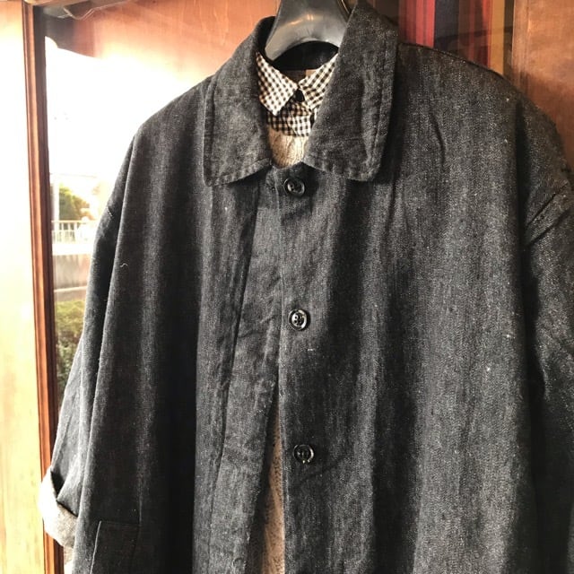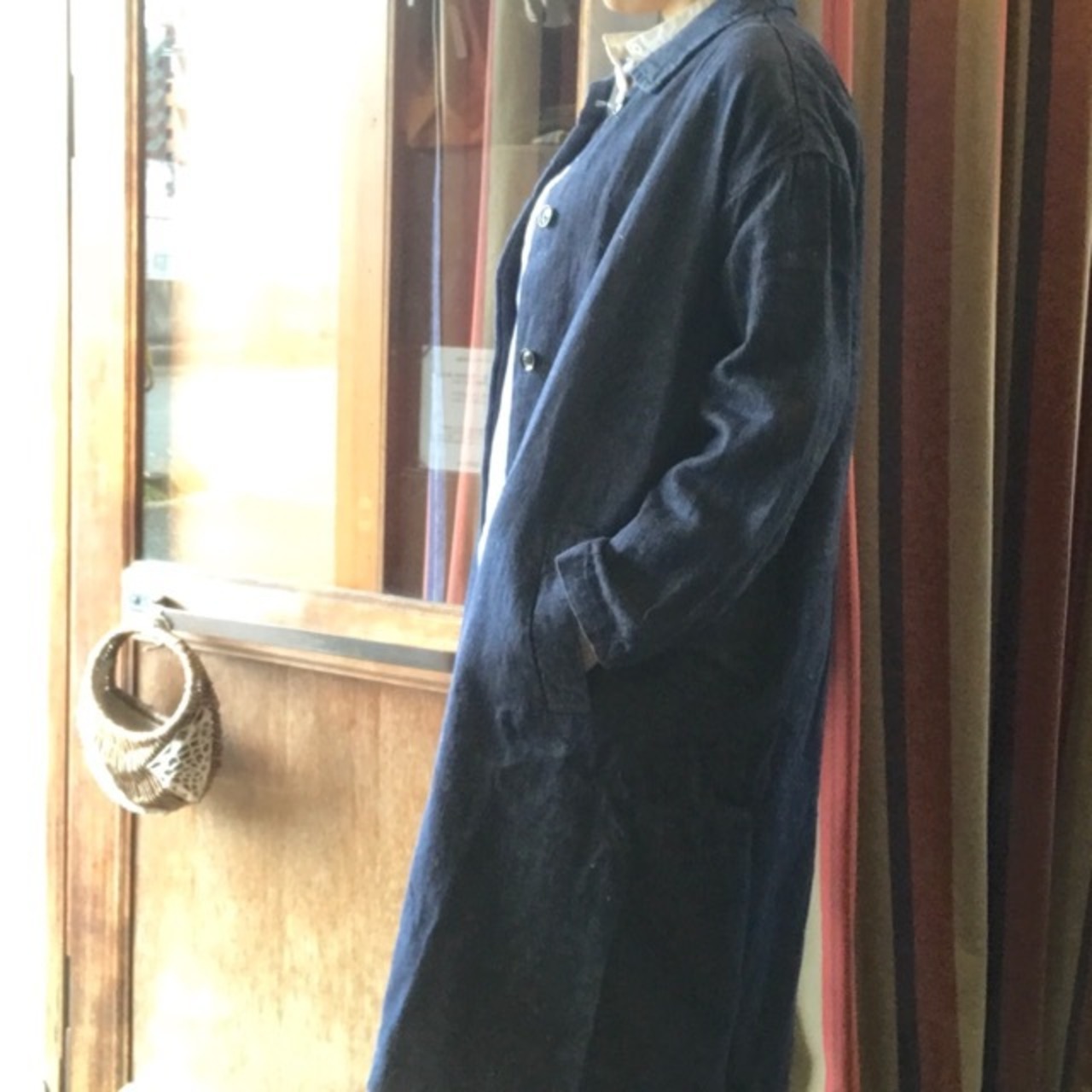 春秋に大活躍のライトアウターで、ステンカラーの比翼仕立てで、閉じると一番上以外ボタンが見えない仕様になっています。