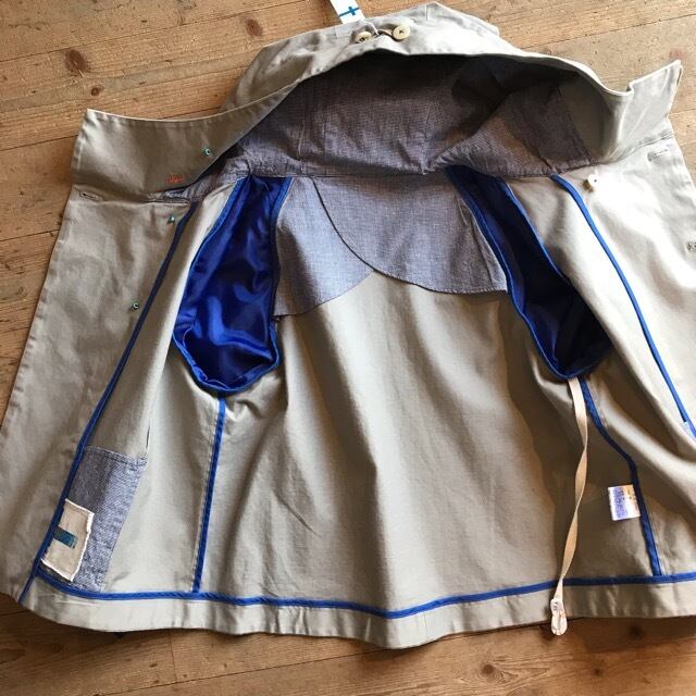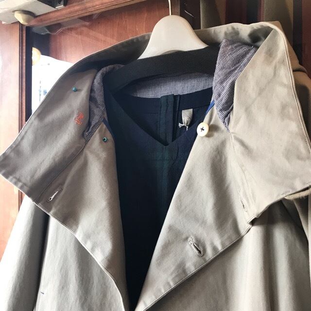 衿の内側にオレンジ色でvm刺繍と、ターコイズのビーズの力ボタン(フロントボタンの裏側)が見えます。