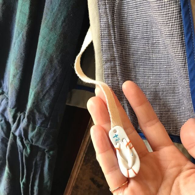 左脇からブランドアイコンのミニチュアビーチサンダルがぶら下がっています。
