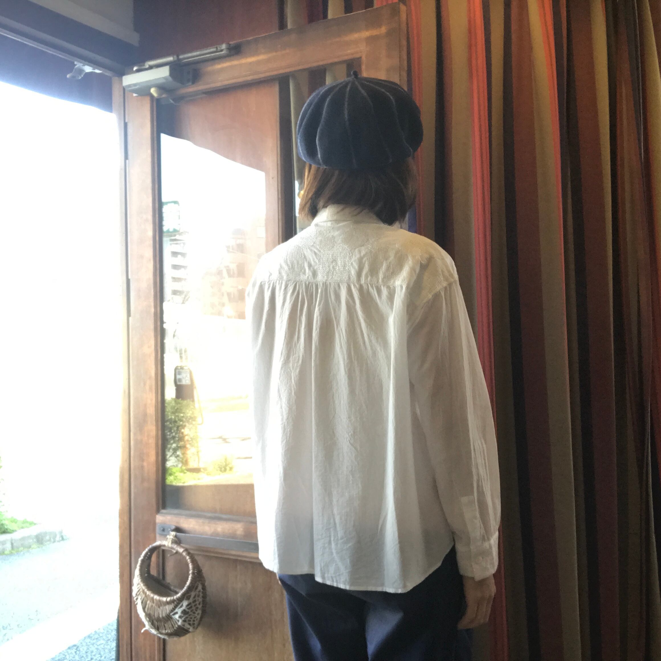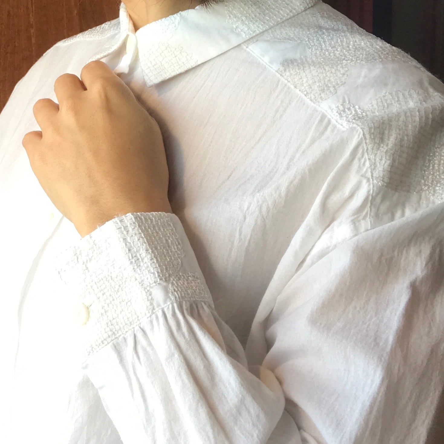 衿、ヨーク部分と袖口のカフスに部分的に使われています。