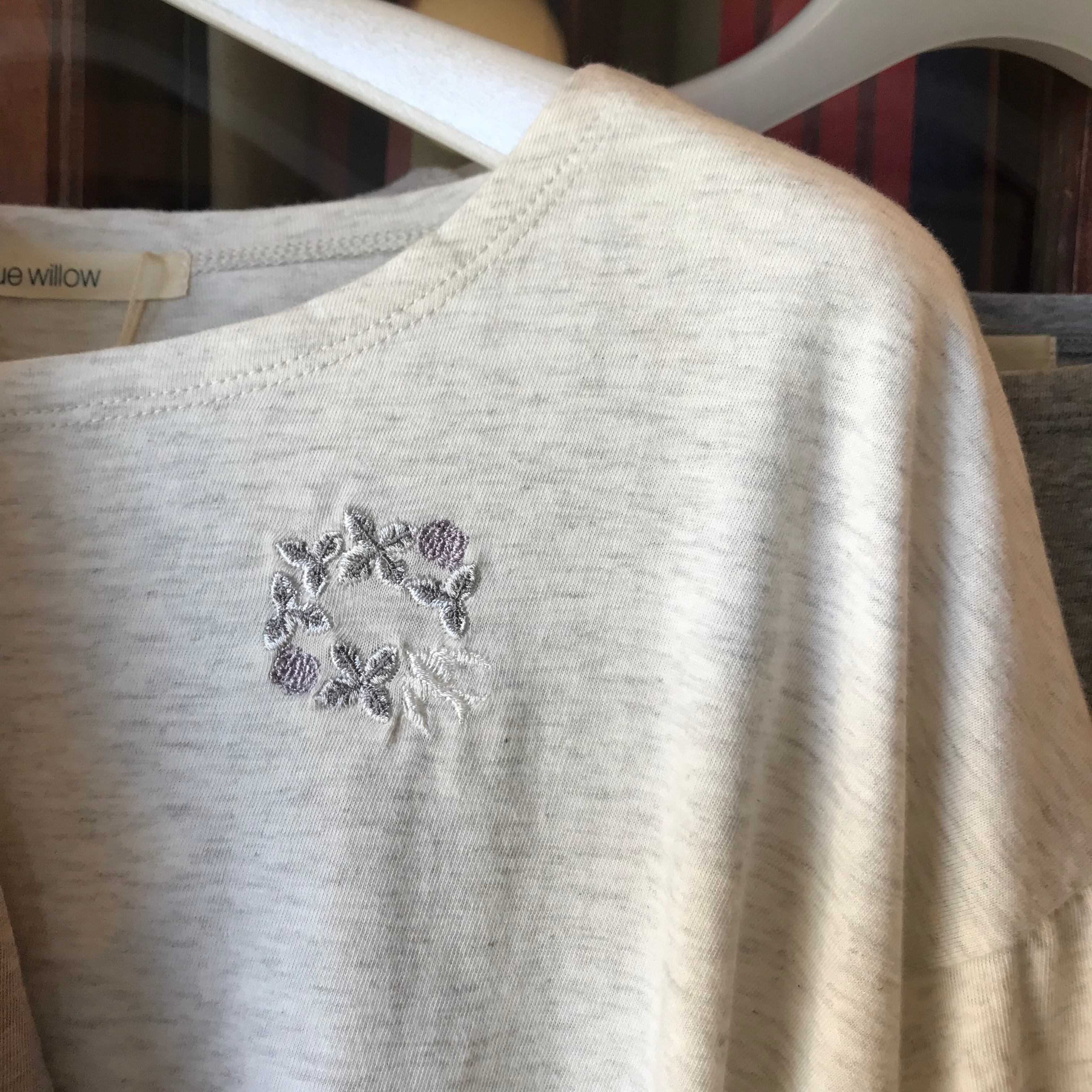左の胸元にクローバーとトリの刺繍が入った可愛いTシャツ。