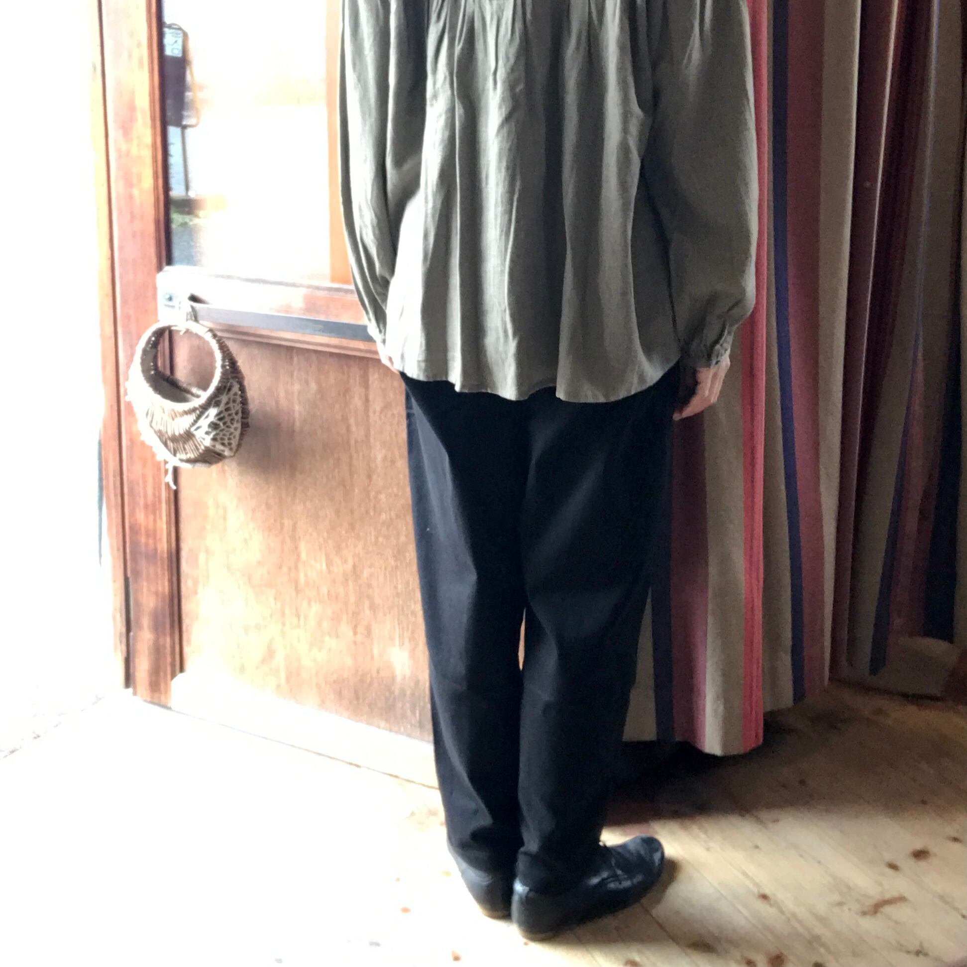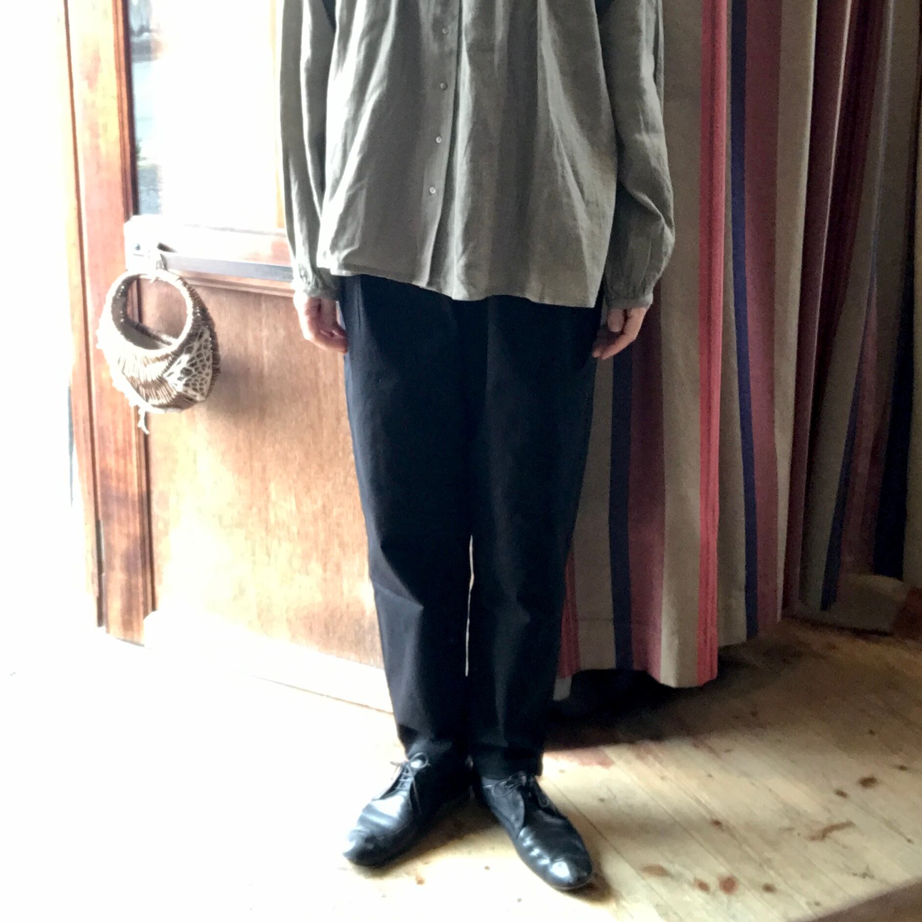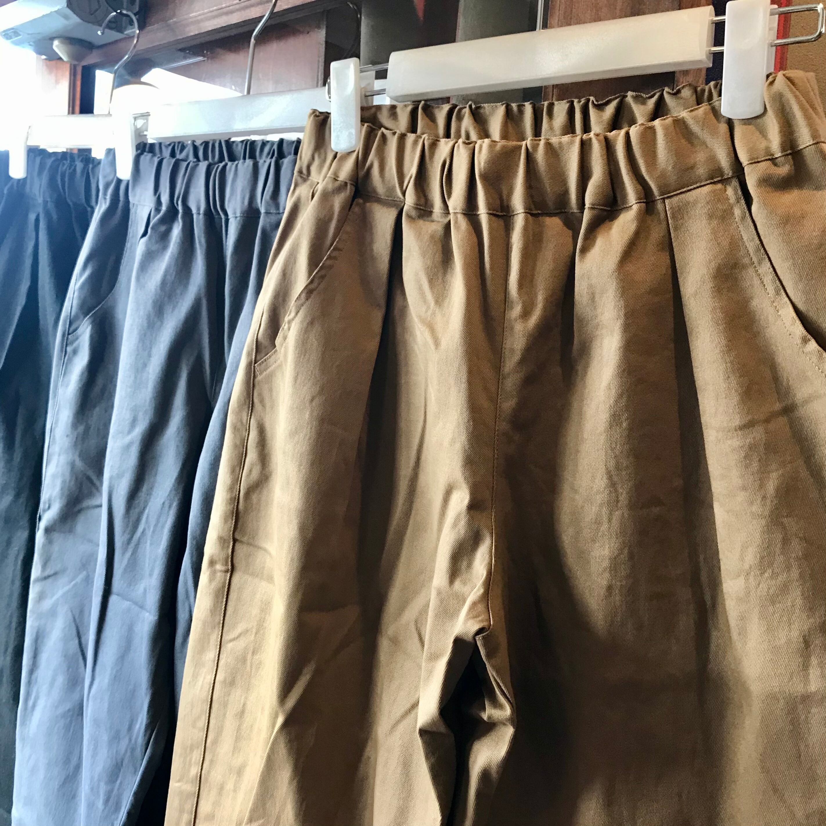 ウエストにタックを入れて腰回りにゆとり持たせ、裾に向かって細くなるシルエットです。