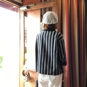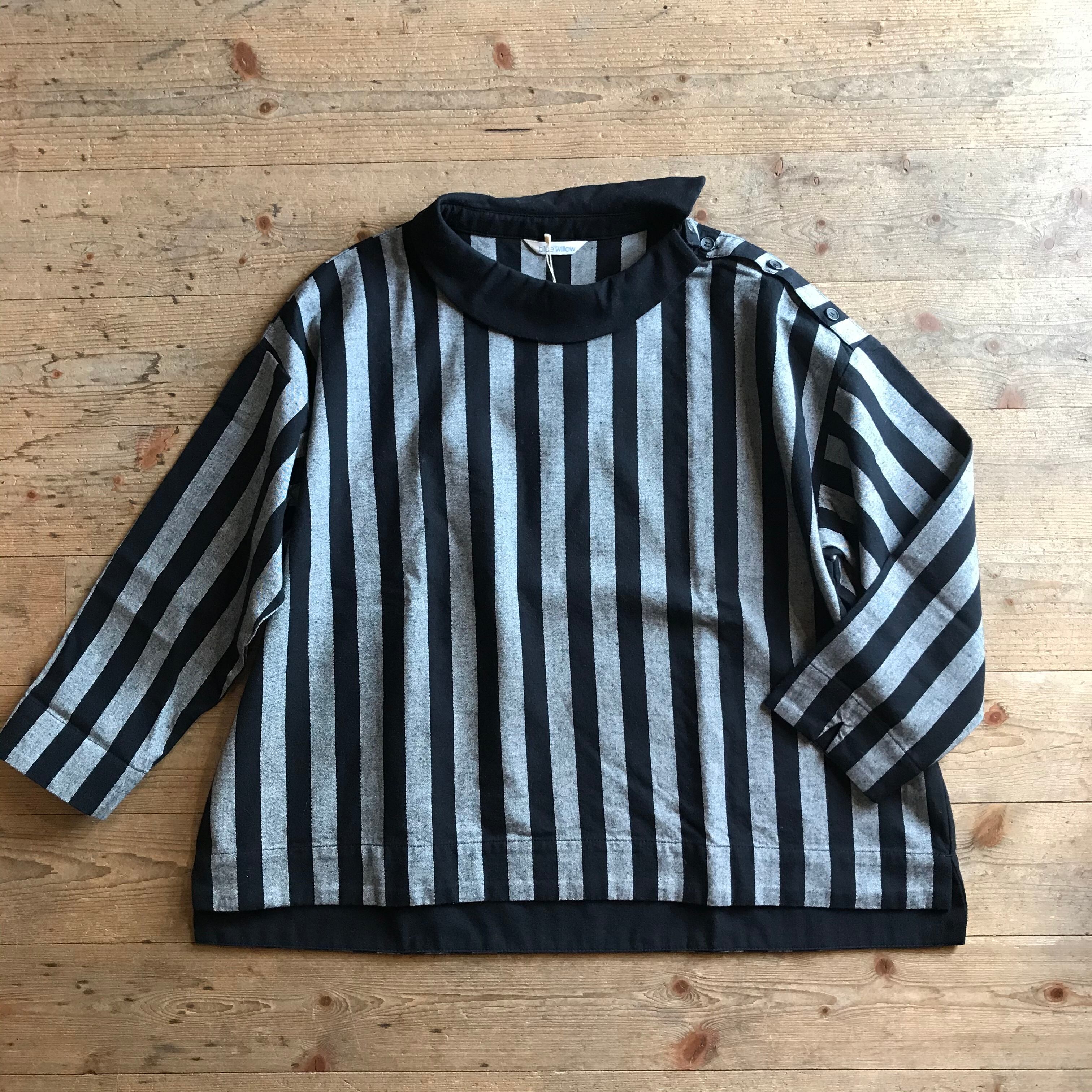 ゆったり身幅、ドロップショルダーで着心地が楽ですが、太ストライプのおかげでスッキリ見えます。