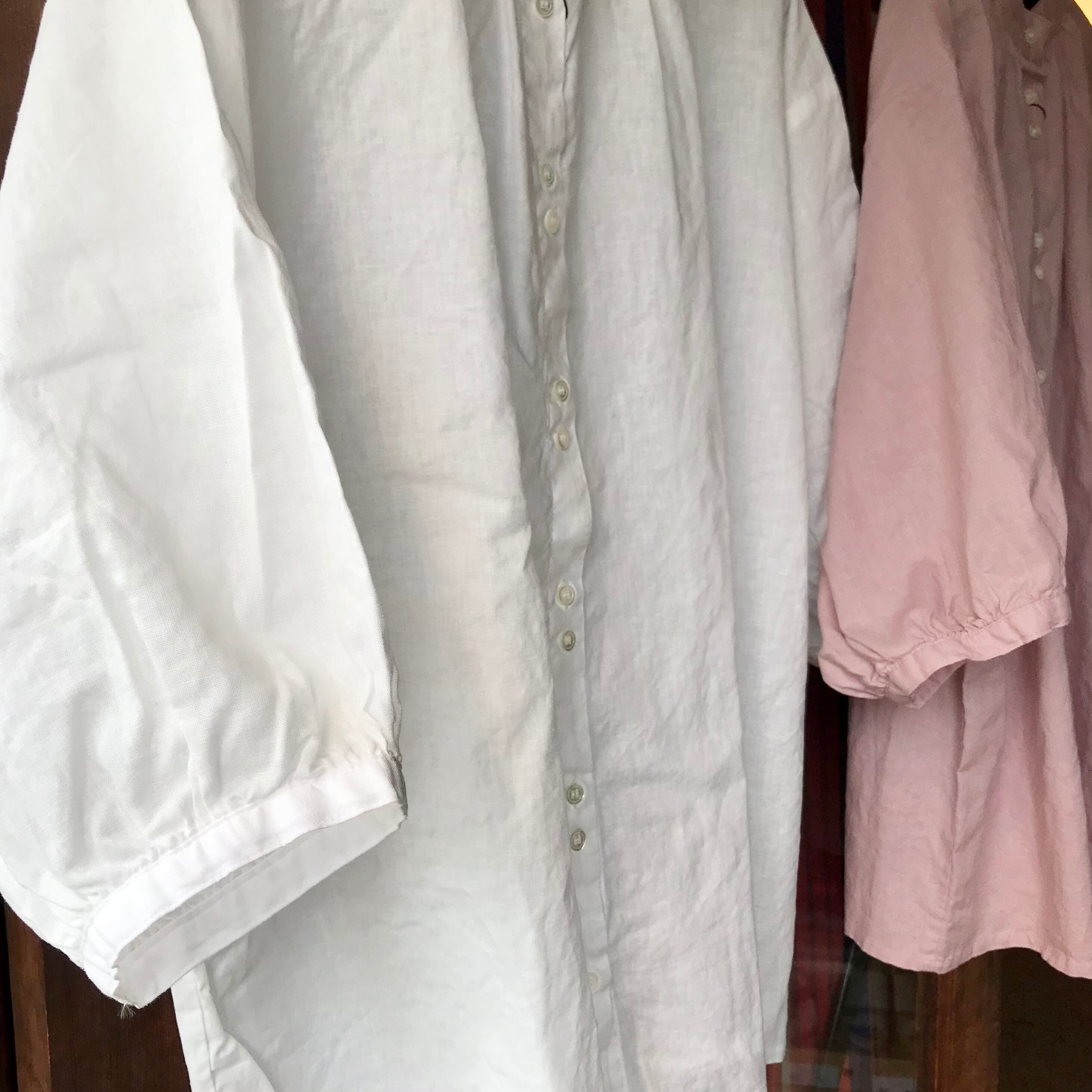 衿ぐりと袖口にはギャザーを施し、ボタンは2つ並んだデザイン。ひとつは飾りボタンです。