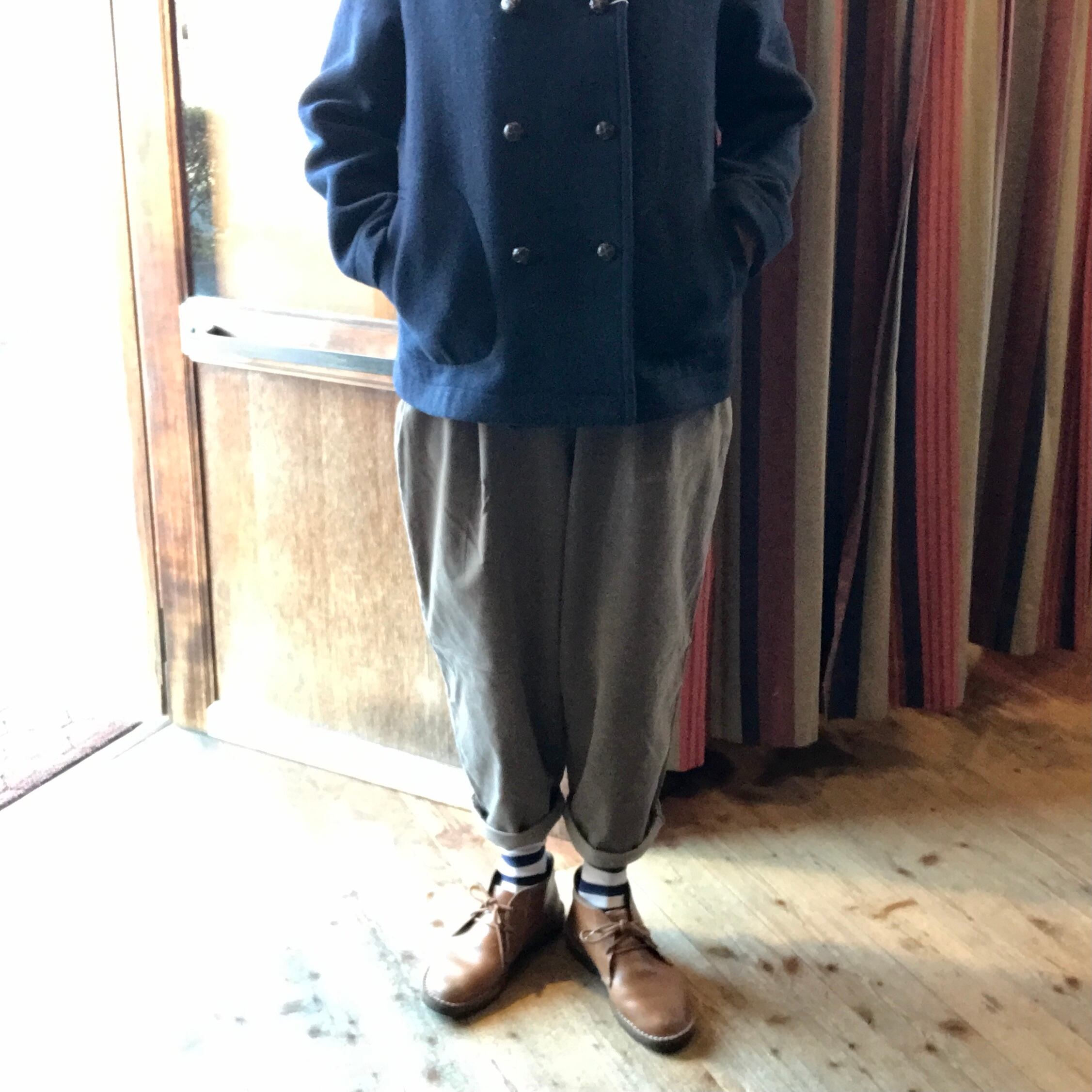 裾を二つ折りと伸ばした状態とで穿き比べています。