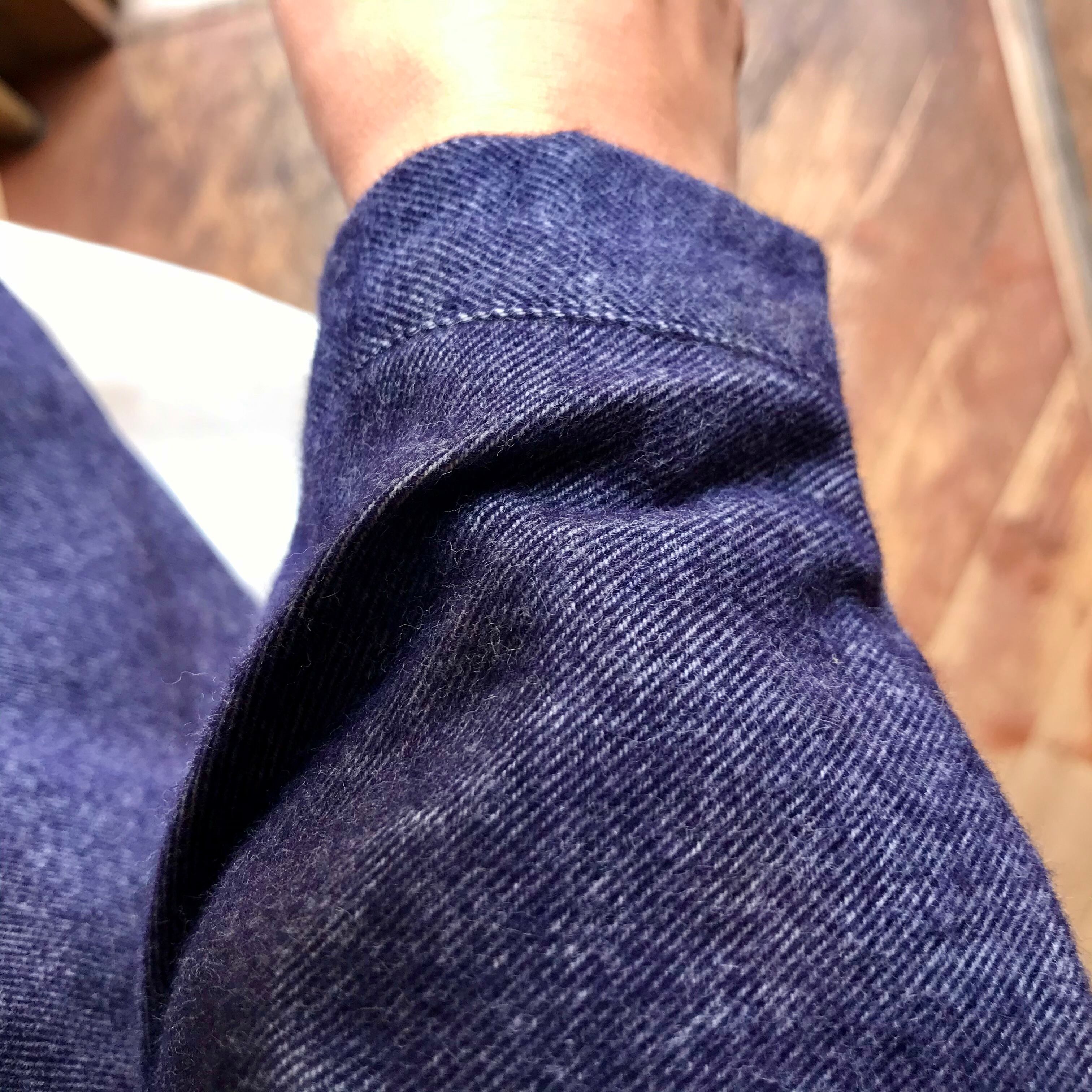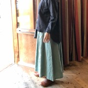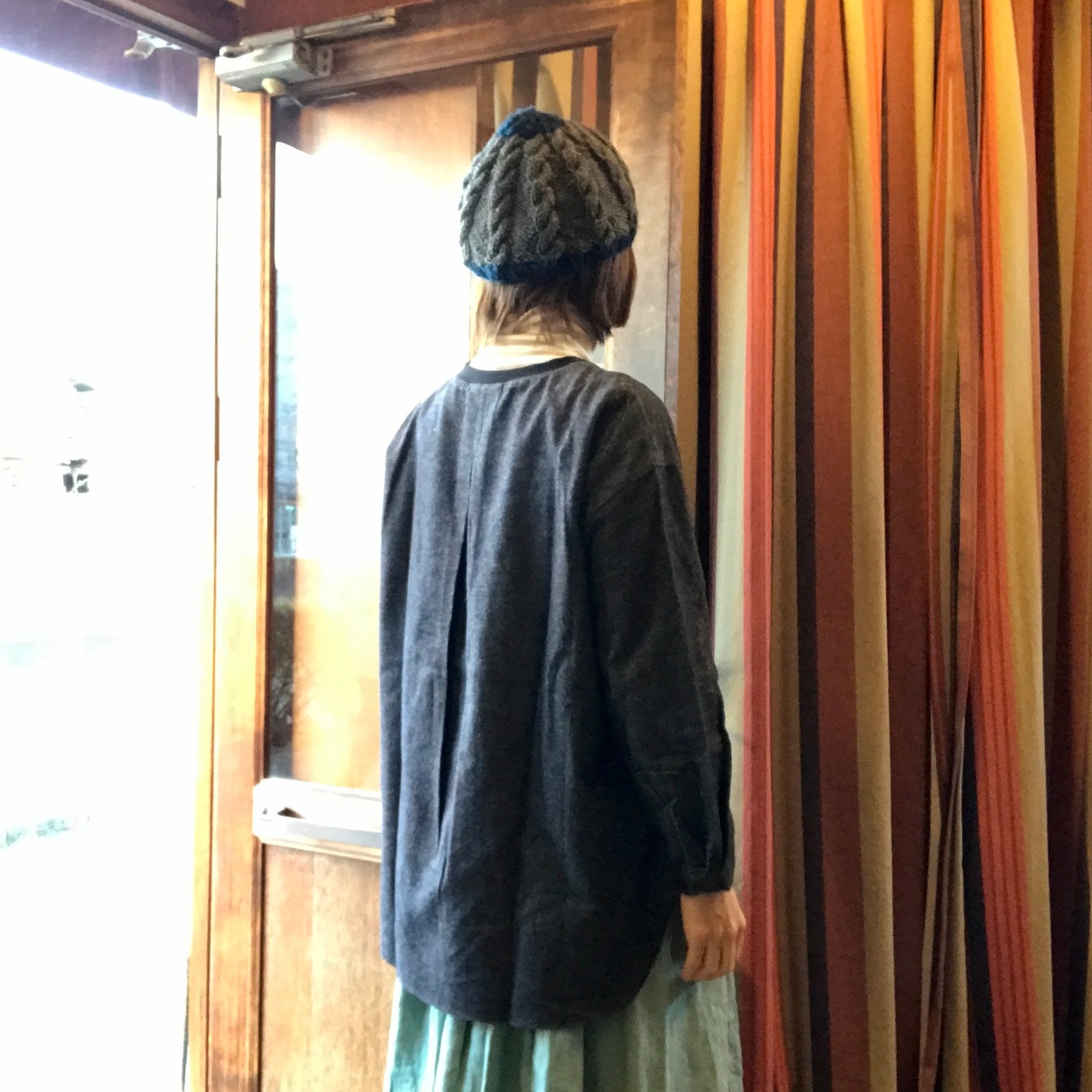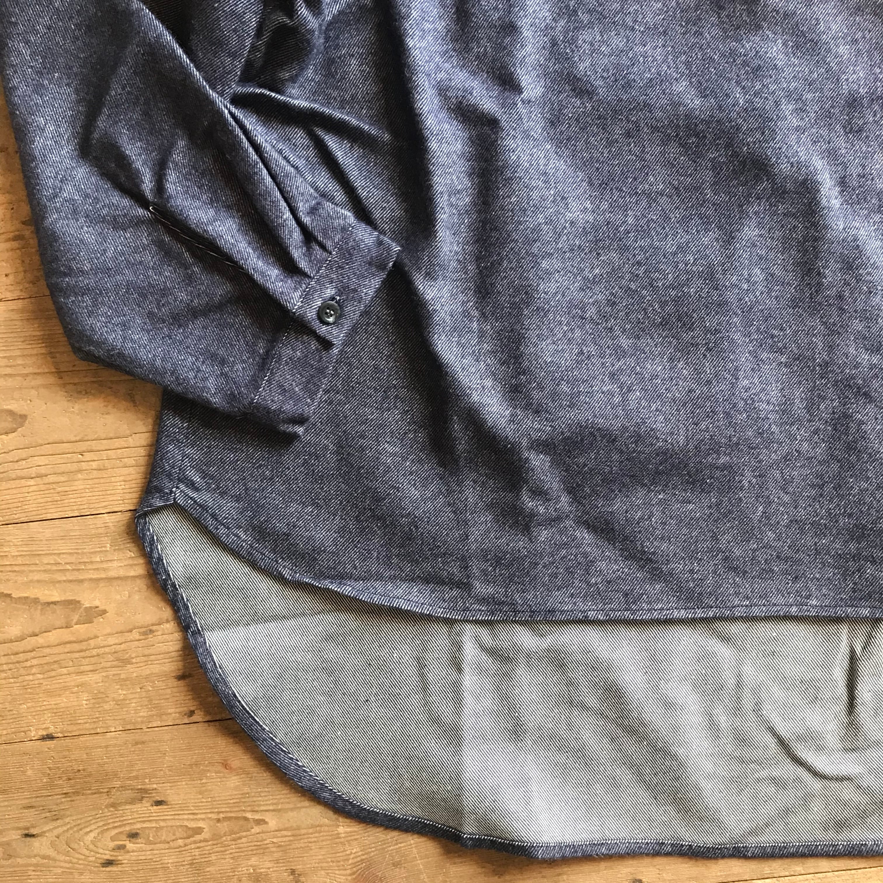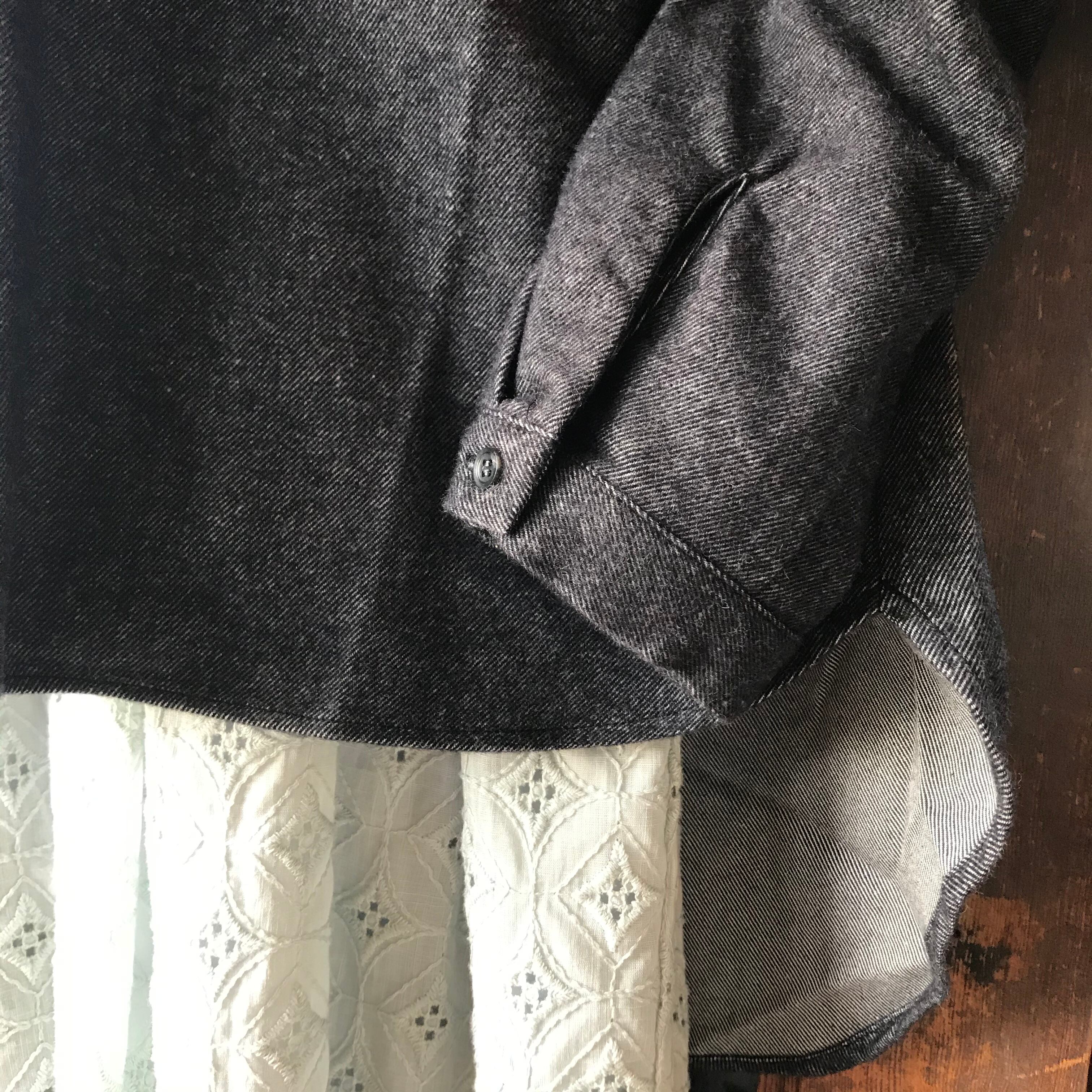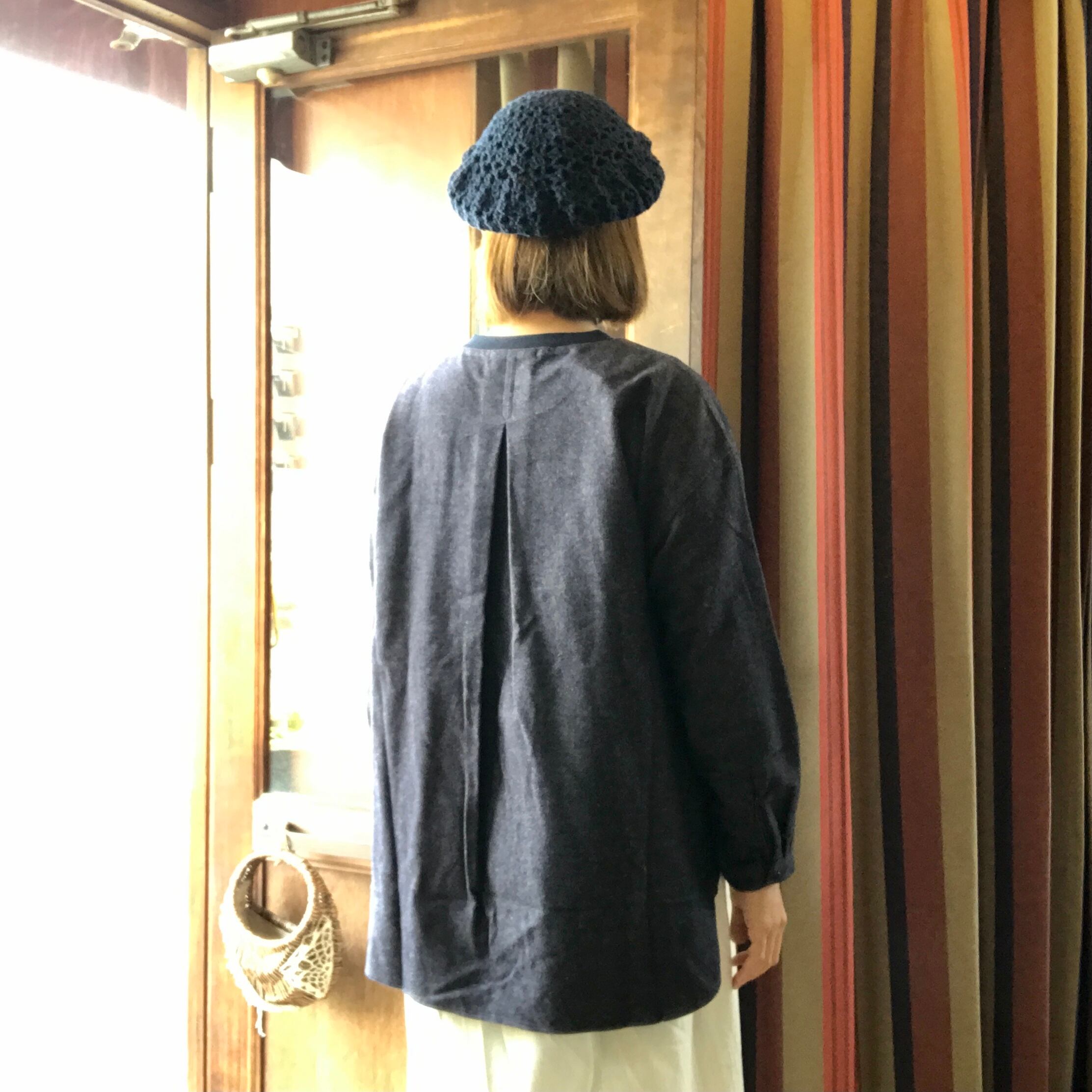 袖口カフス開き仕様、裾は前後差を大きくつけてポイントにしています。