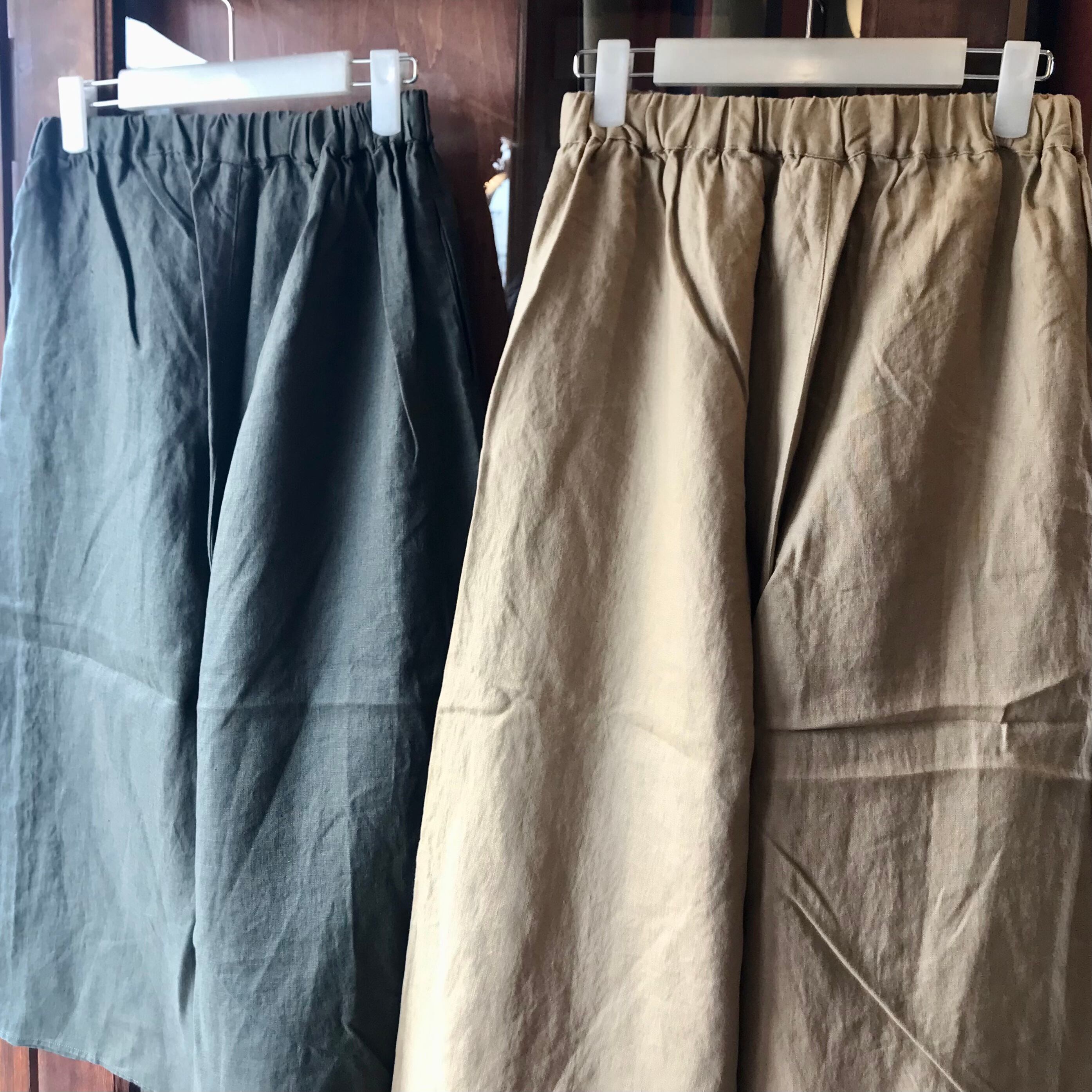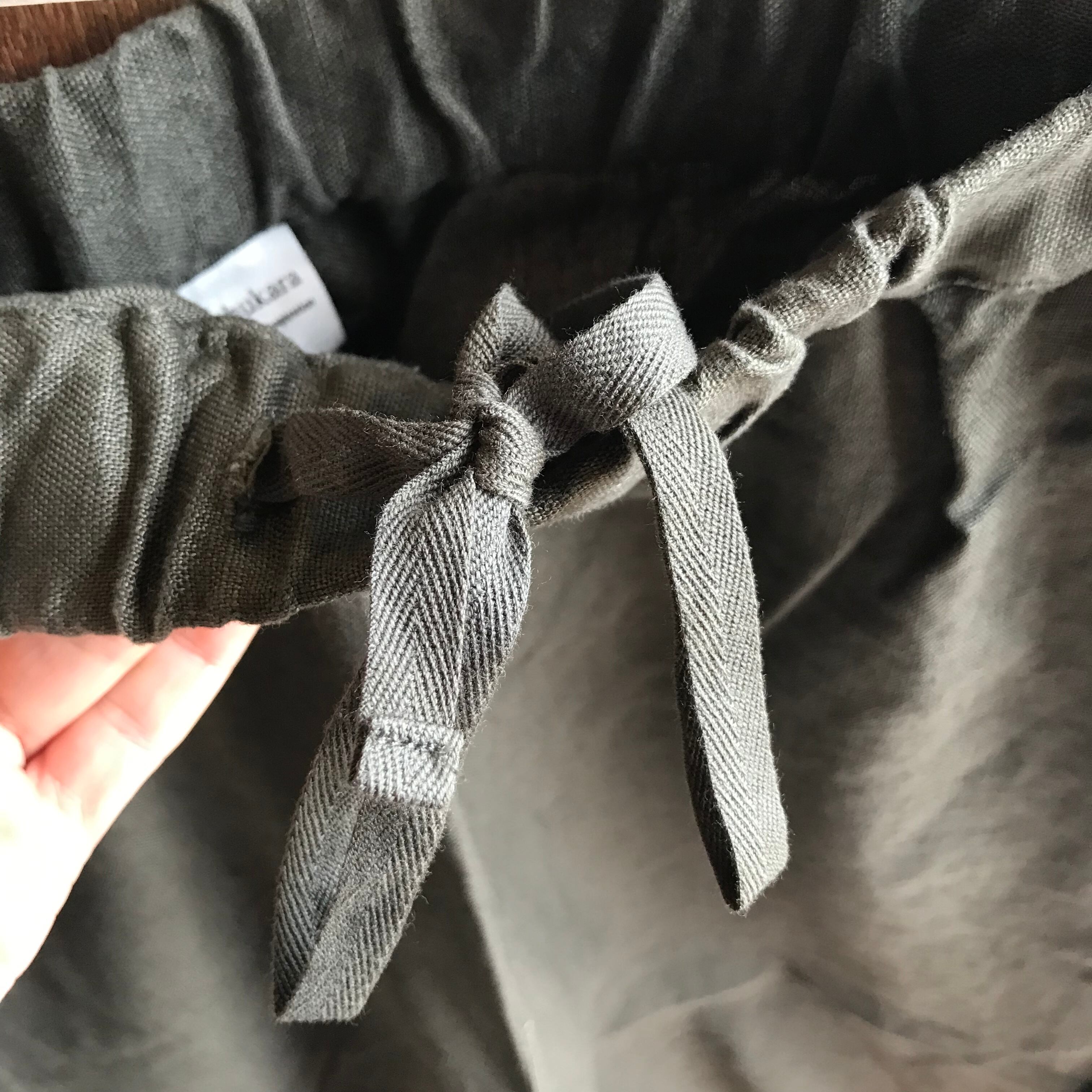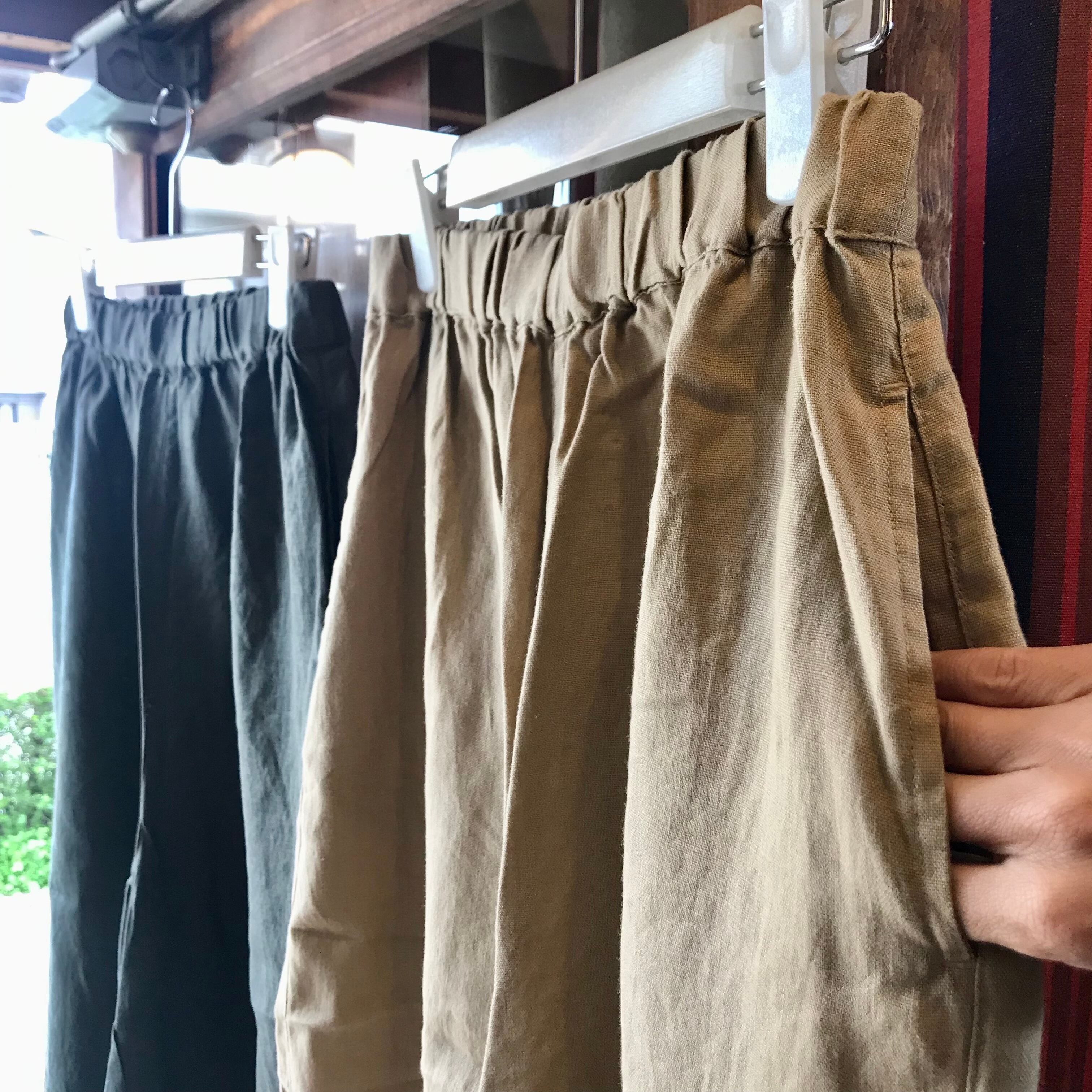 ウエストは総ゴム、内ヒモ仕様、両脇にスラッシュポケットが付いています。