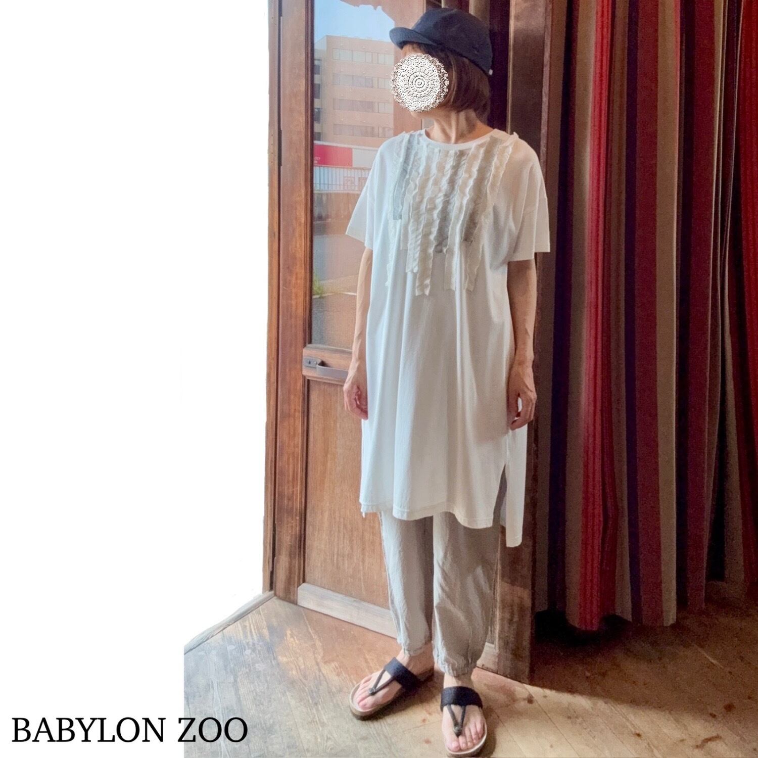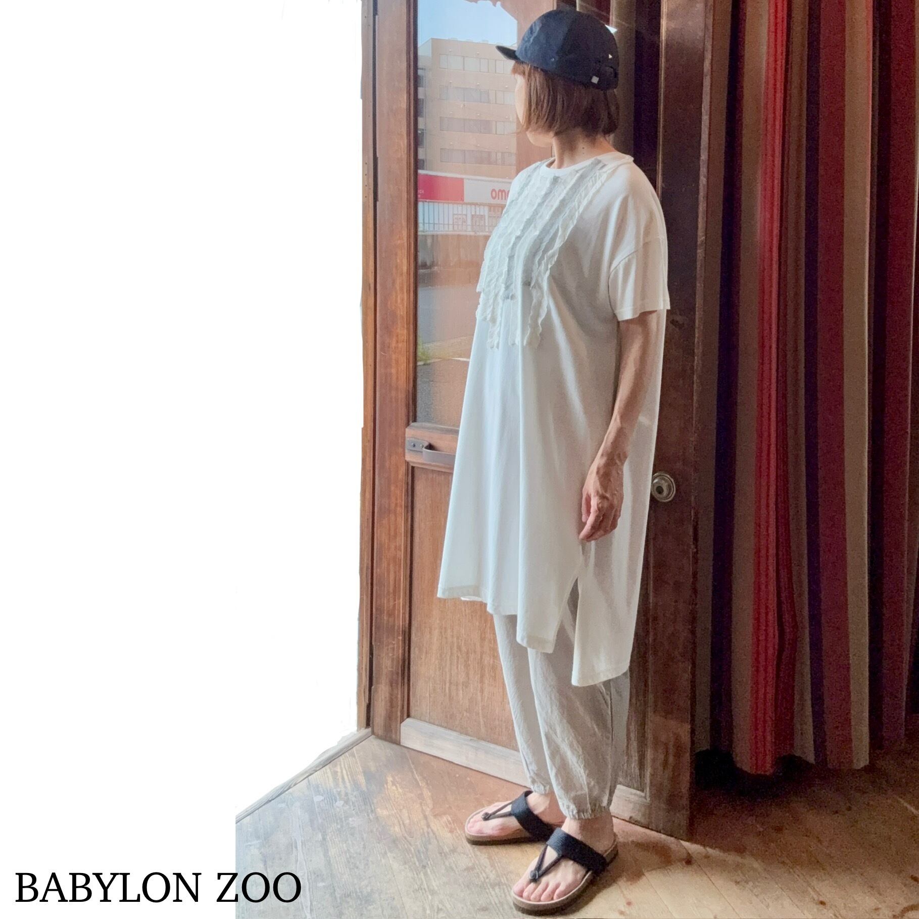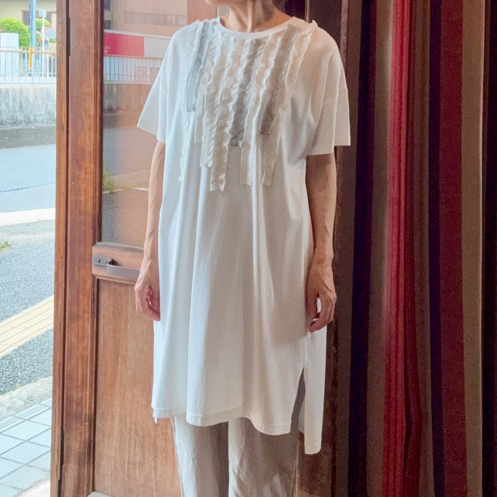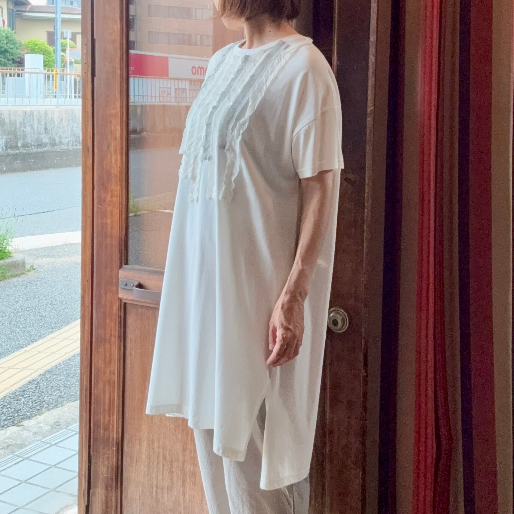 シンプルなチュニックの前見頃に、異素材のフリルを施しています。