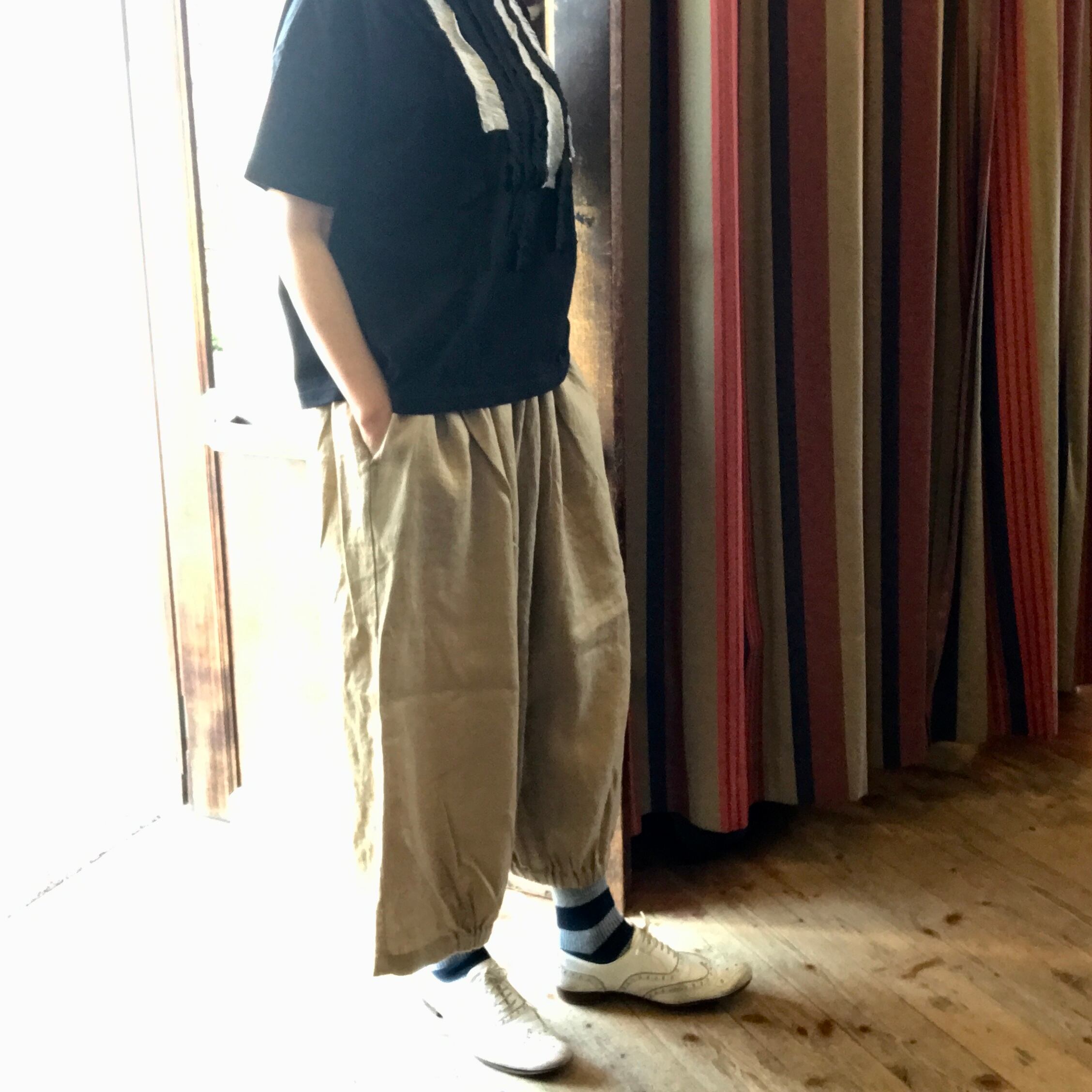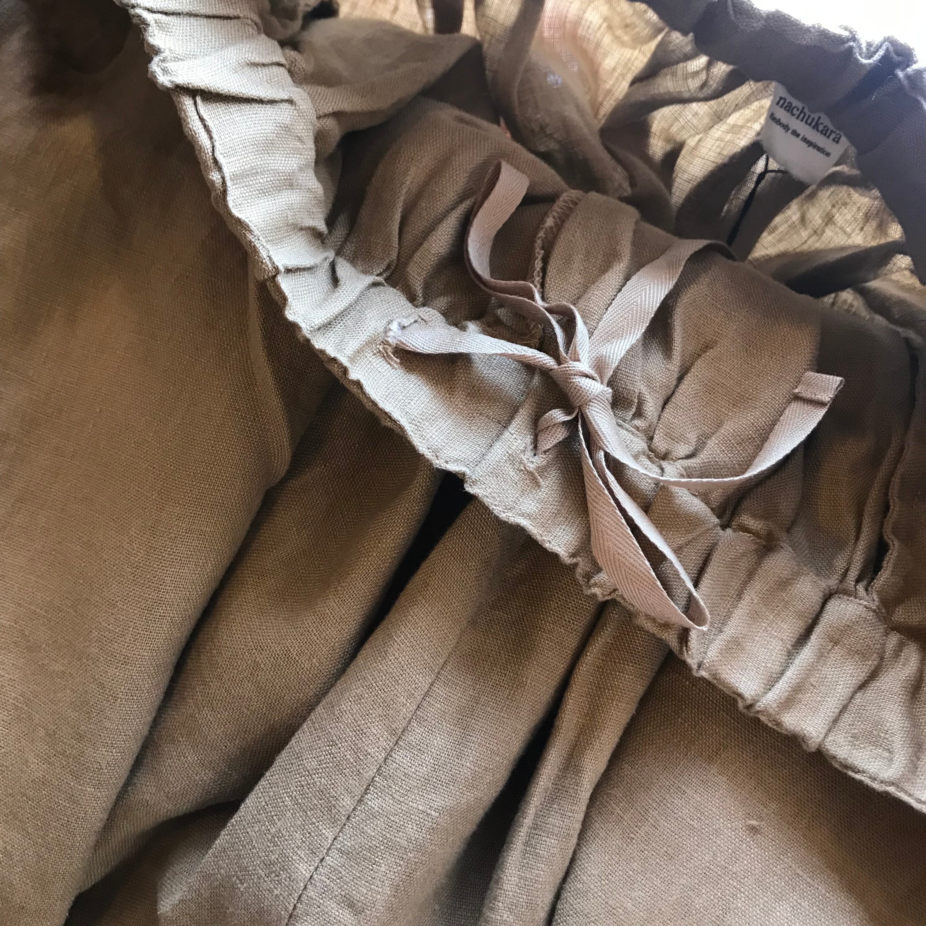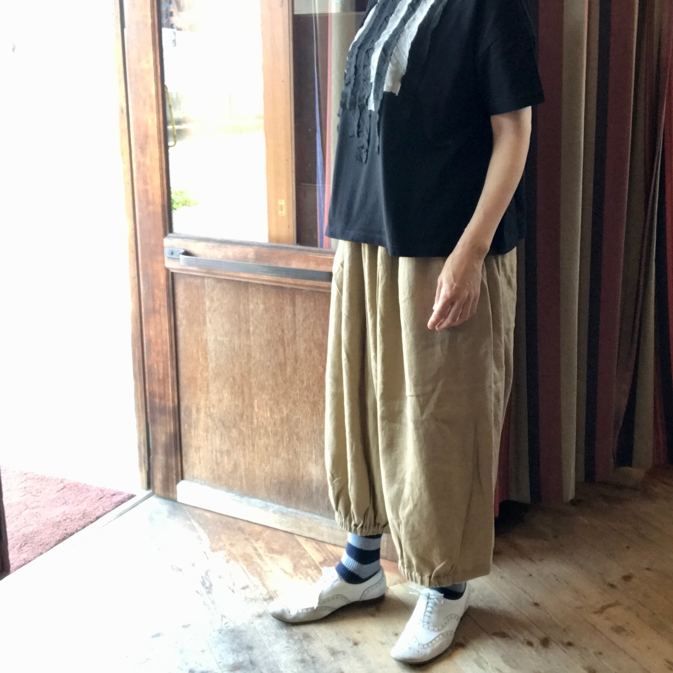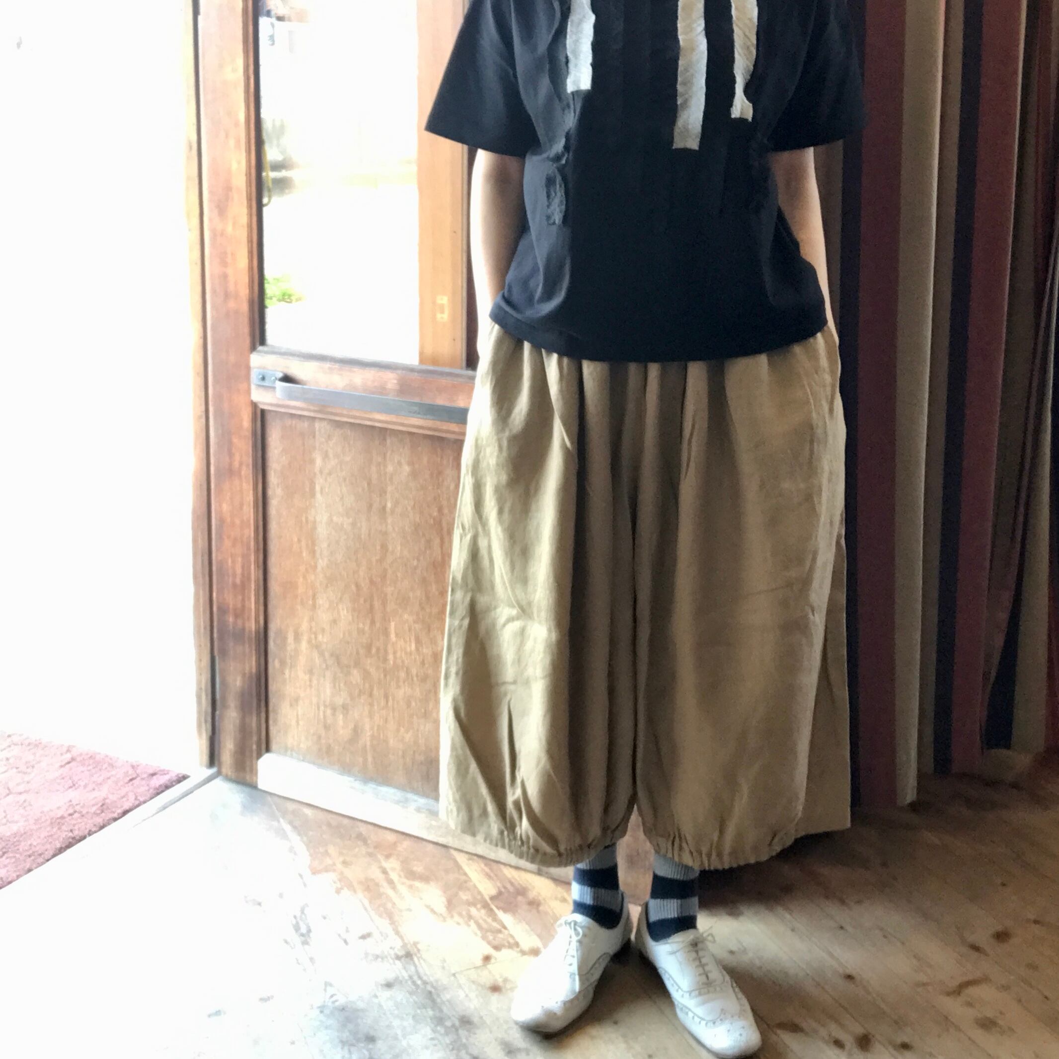 ウエストにたっぷりと取ったギャザーと、裾の内側にゴムを入れて作ったバルーンシルエットがポイントです。