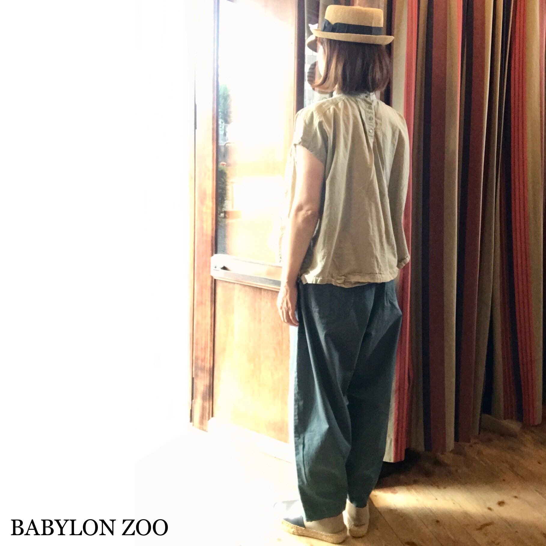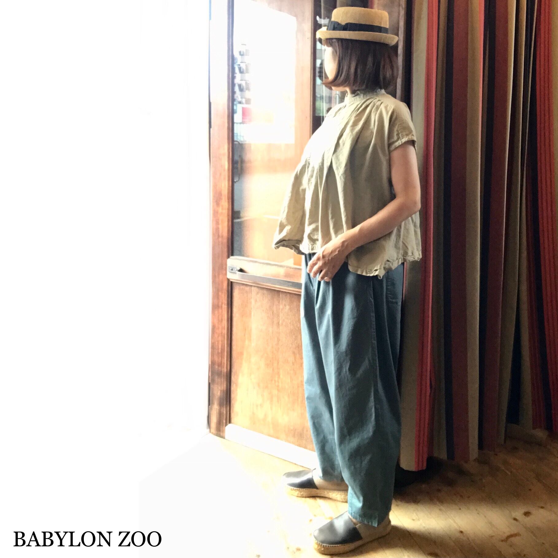 後染め加工、洗い加工を施していますのでくたっとしたシワ感などがございます。生地の特性とお考え下さい。