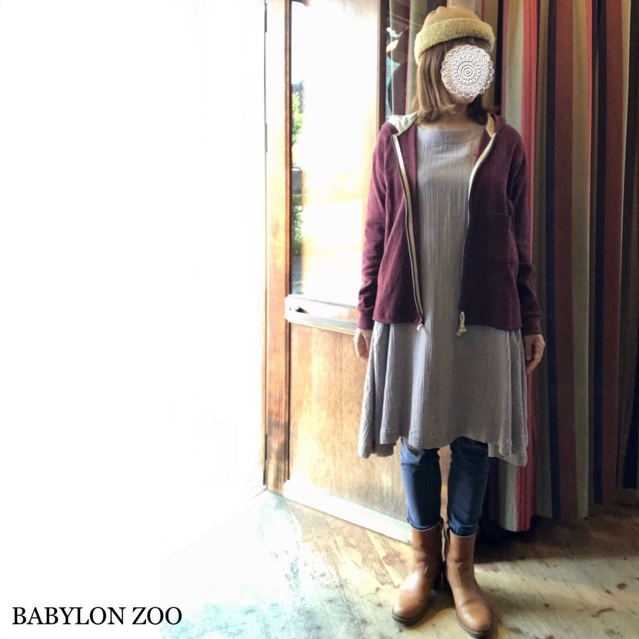 フード裏には生成り色のシャツ生地を。