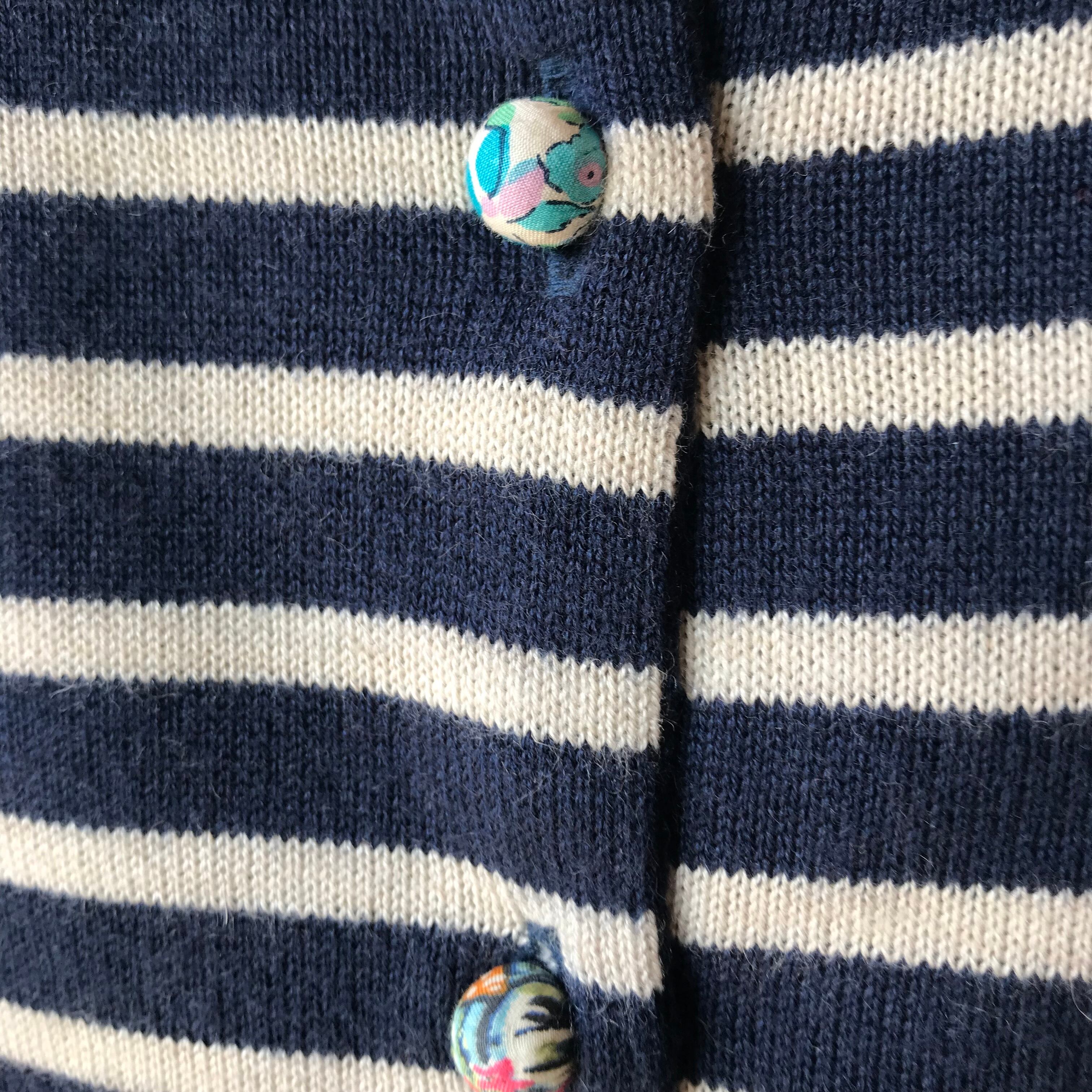 Des Ponds Dans L'eau(デポンダンルウォ)のリバティプリントくるみボタンカーディガンです。