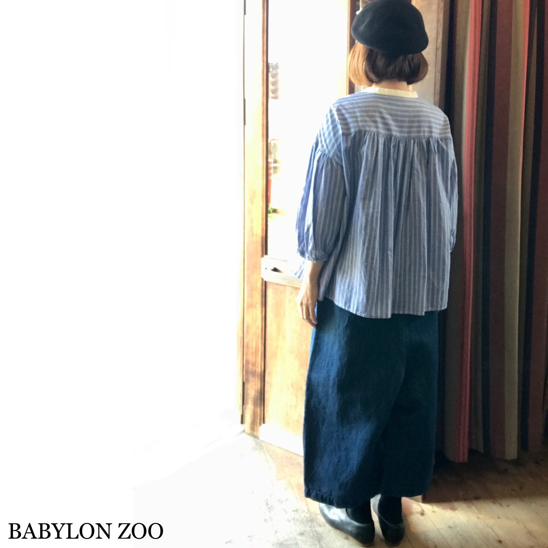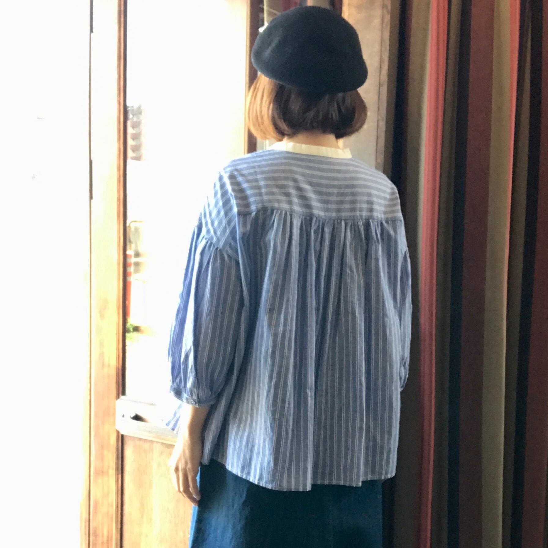 blue willowのコットンリネンクレリックカラーギャザーブラウス。