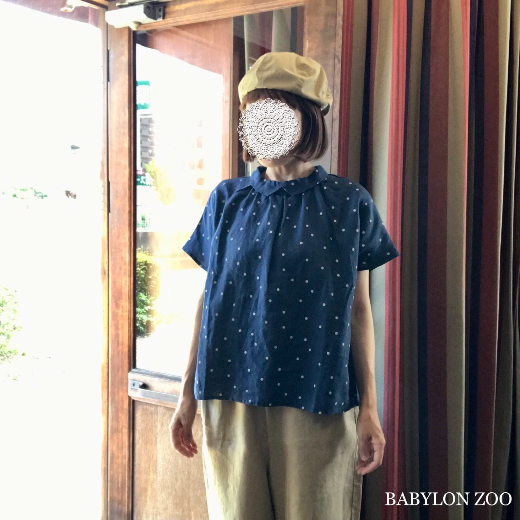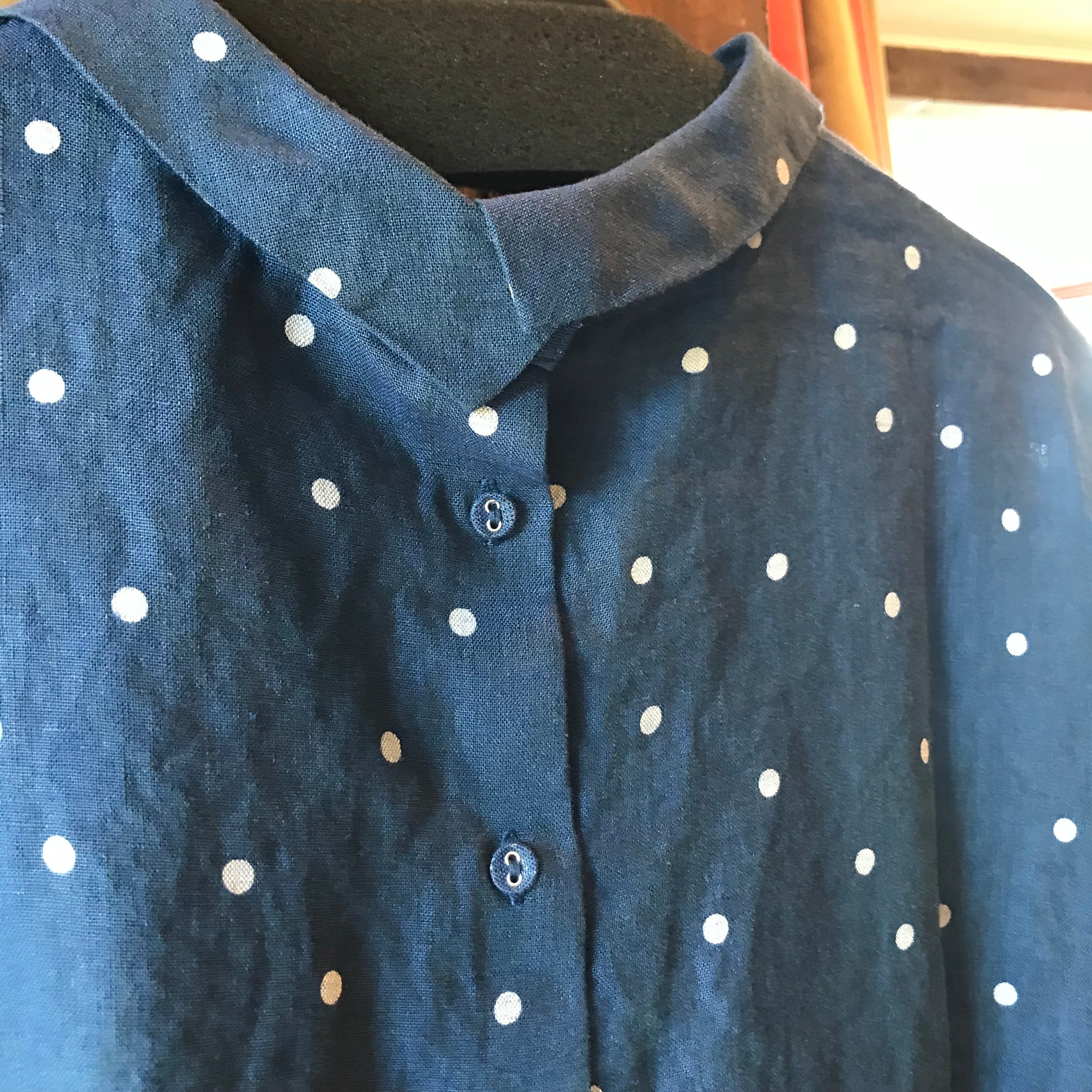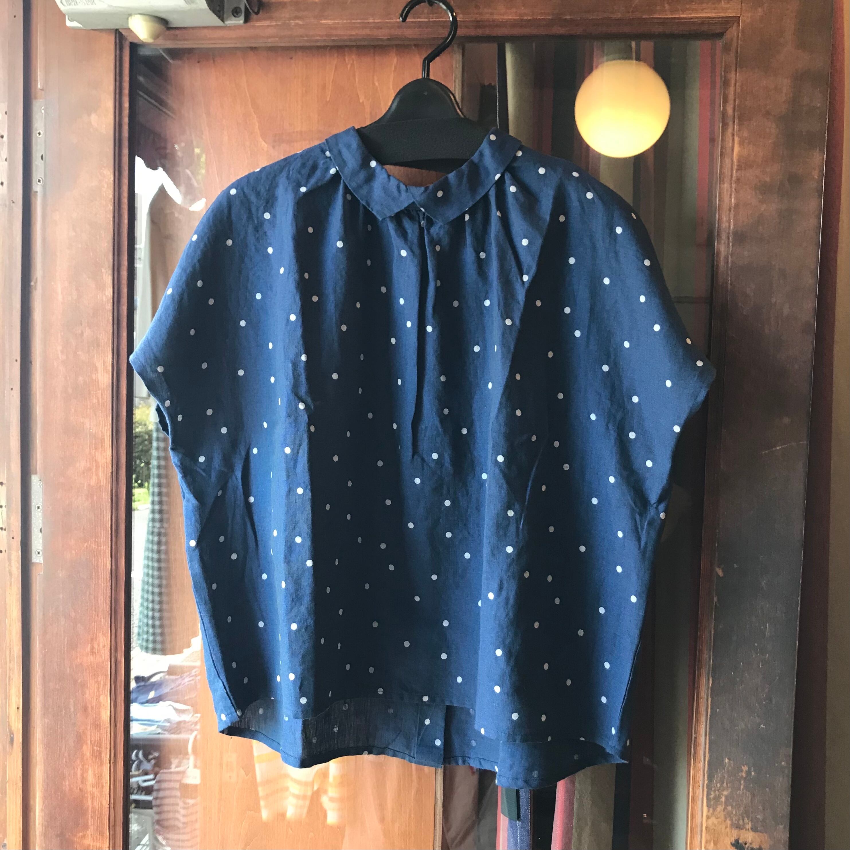 blue willowのリネンドットプリントチビ衿ブラウス。