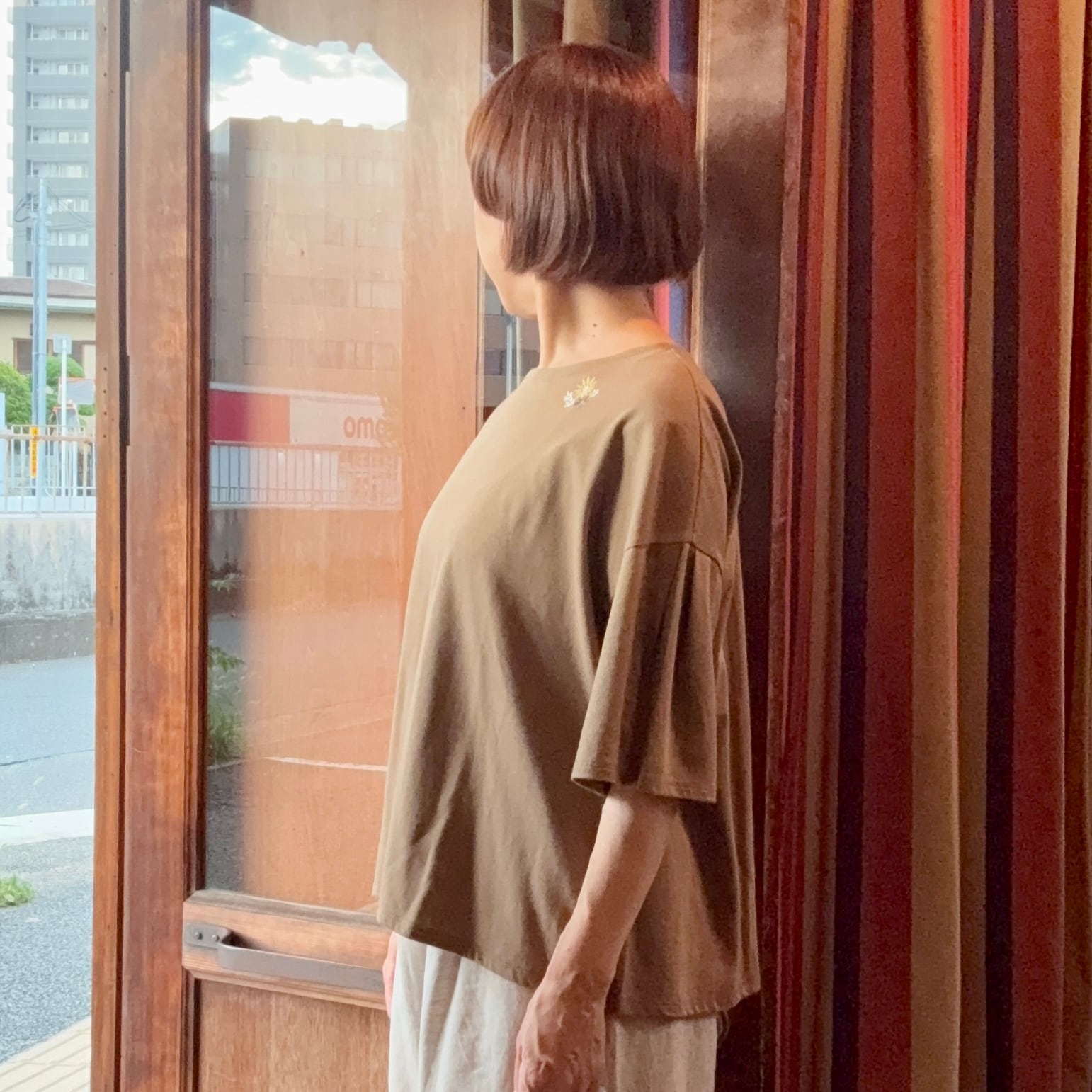 衿元にフラワー刺繍が入った可愛いTシャツ。