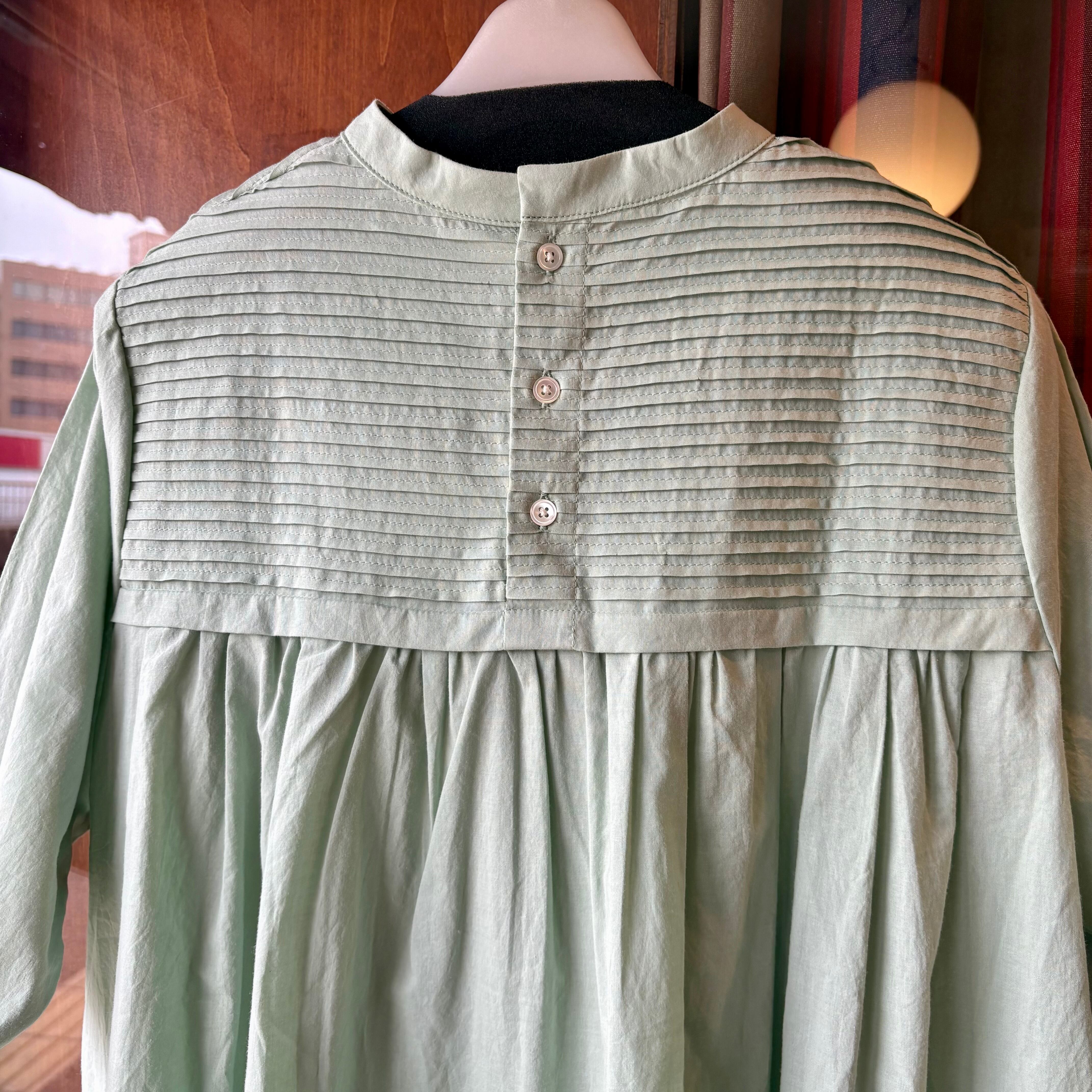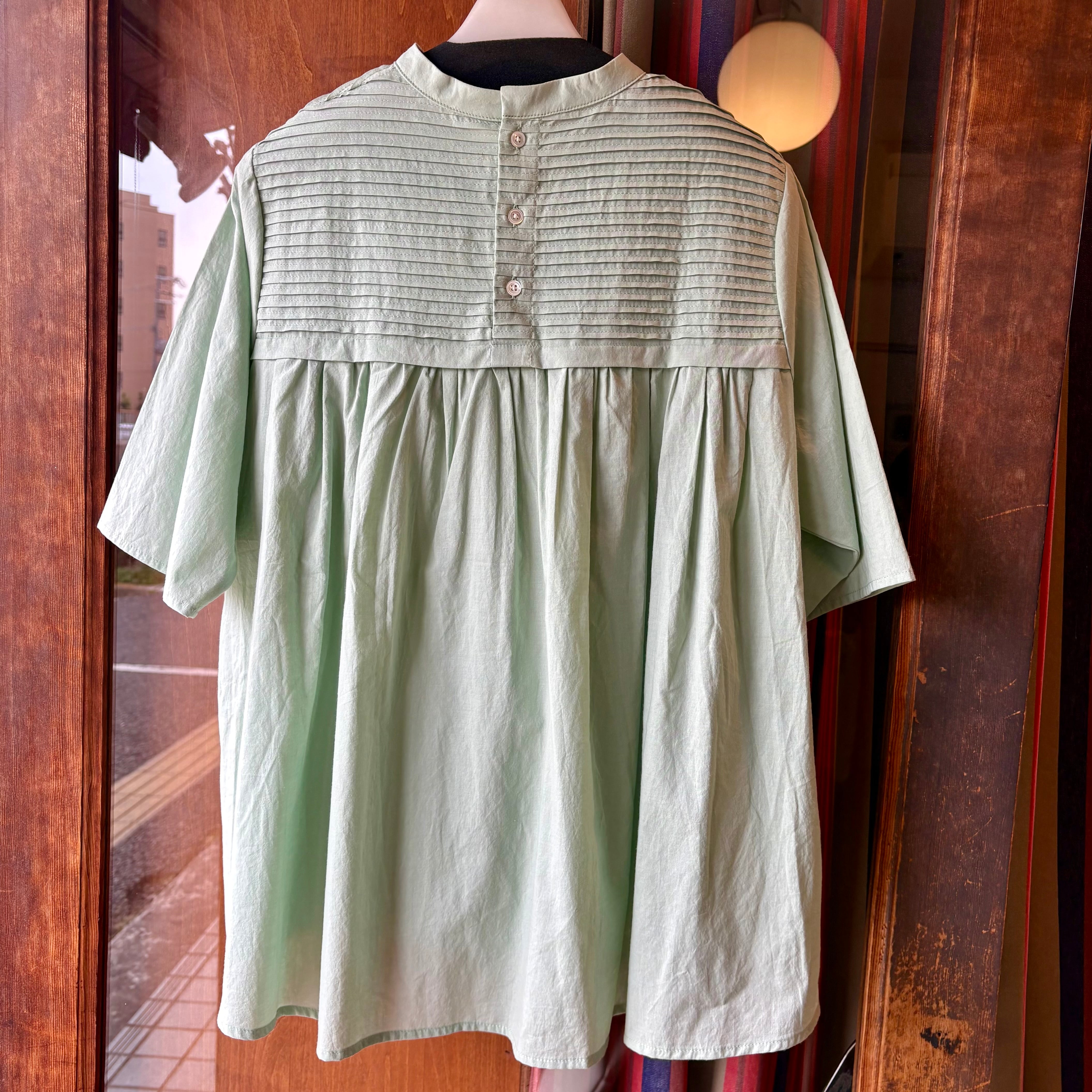 前後のヨークに入れた繊細なピンタックとスタンドカラーがポイントで、ヨーク下のギャザーがふんわりとした女性らしいシルエットを演出してくれる一枚です。