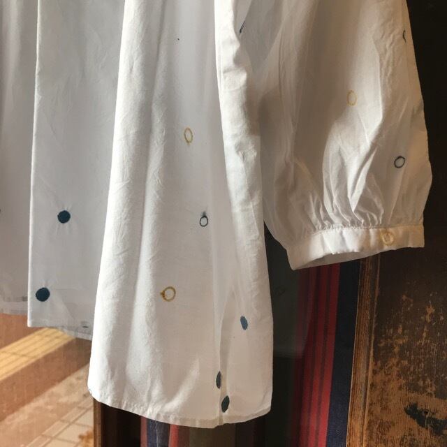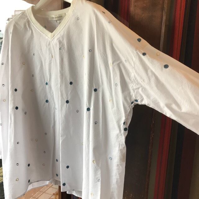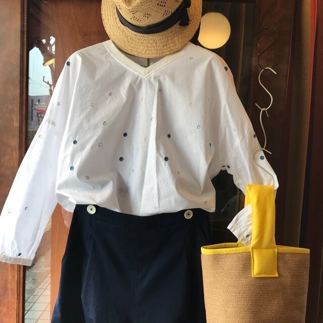 ブルーとイエローのドット刺繍が全面に施されているVネックのプルオーバーブラウスです。